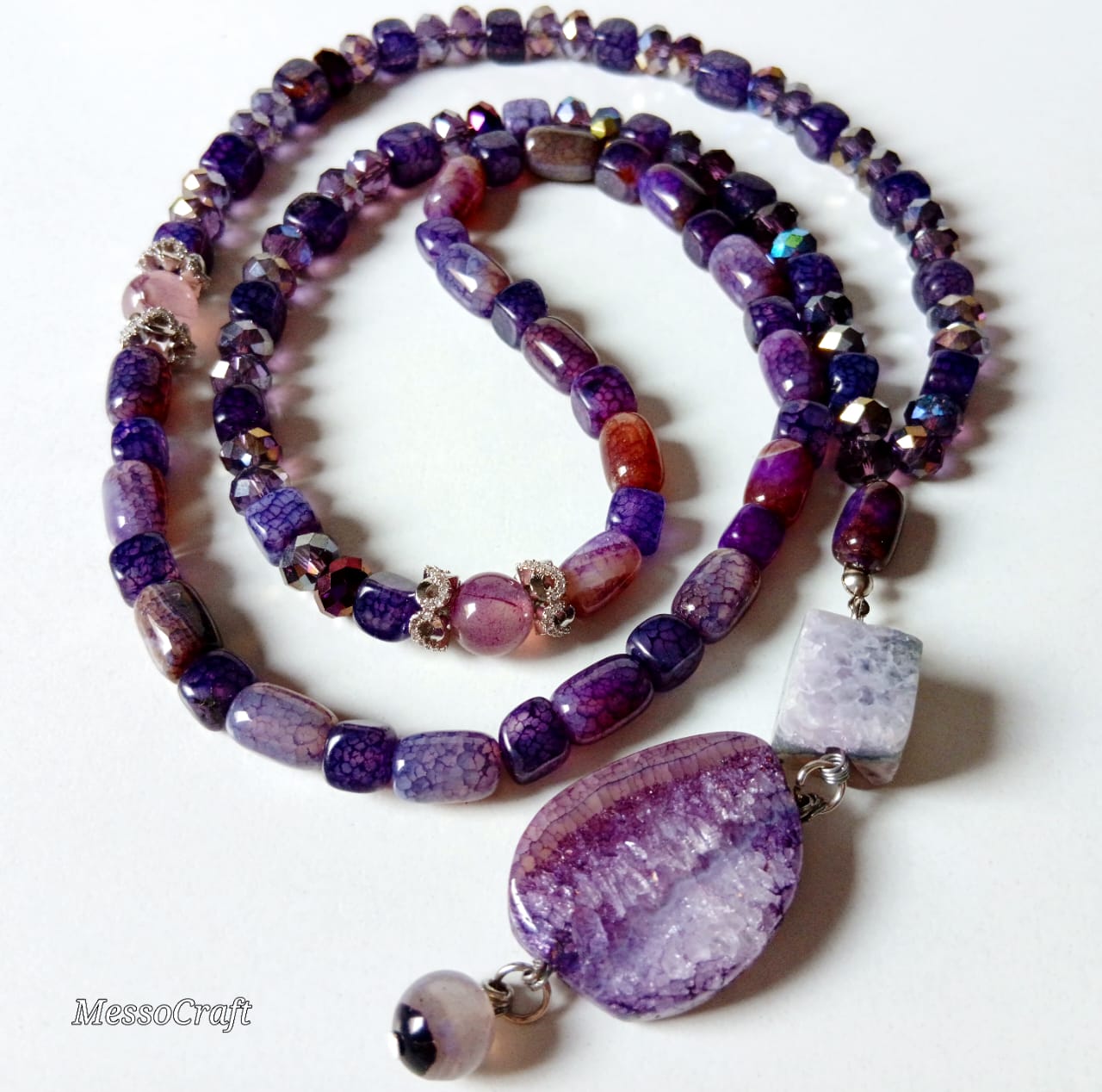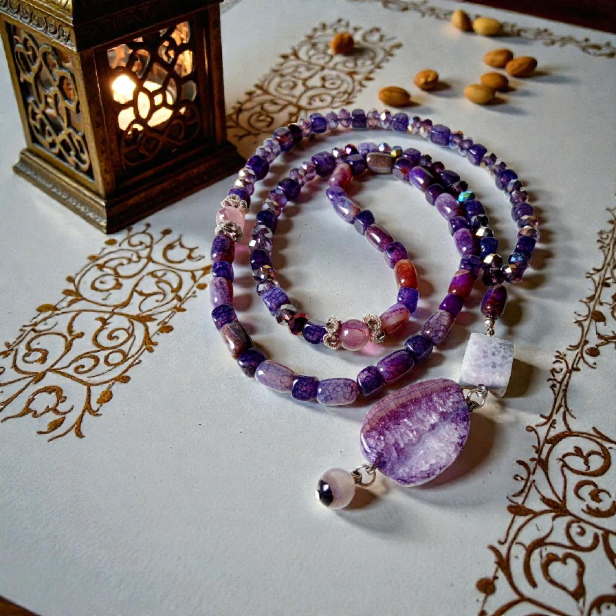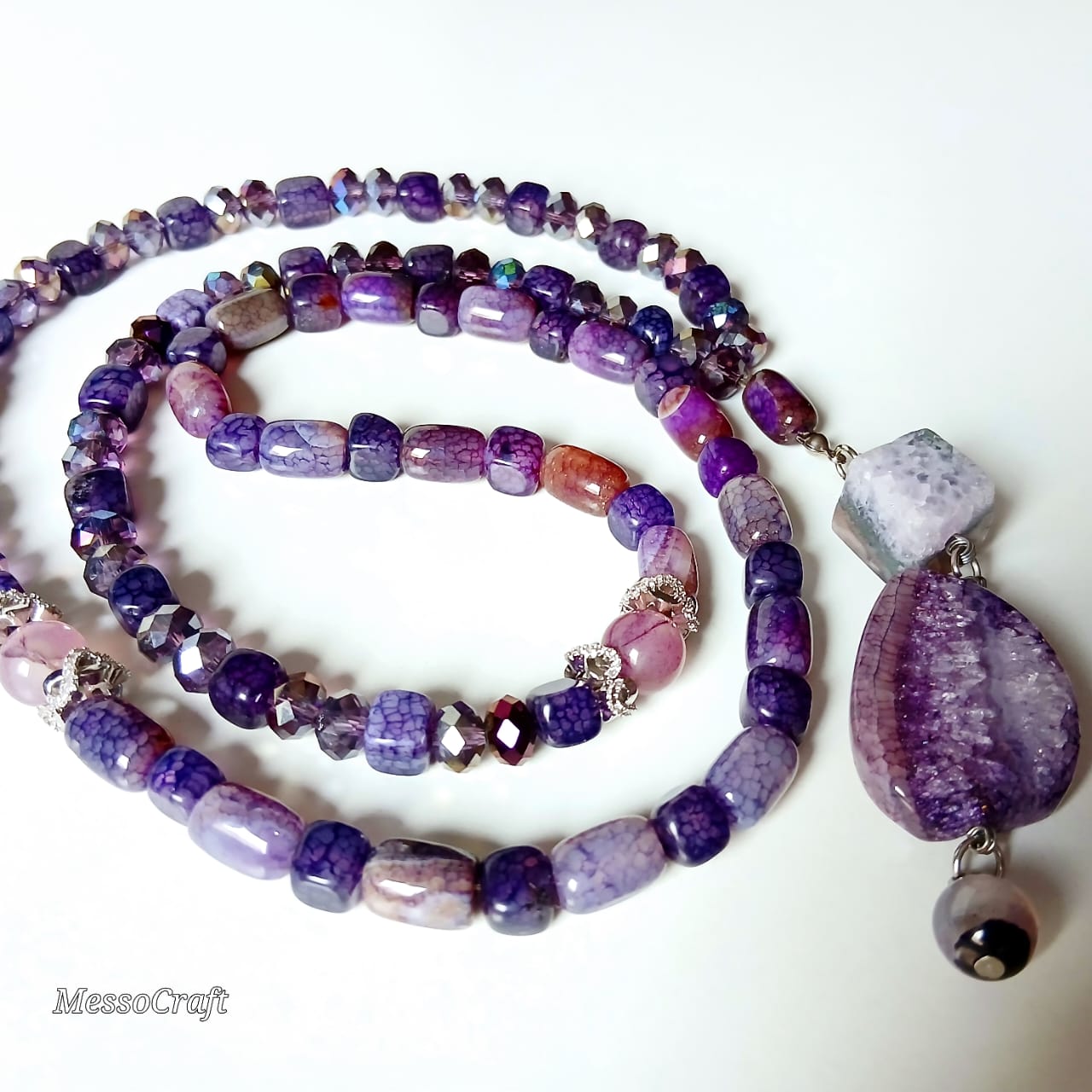 Rosary 99 purple cylinder and square agate, purple crystal changeable, silver separators and 2 original purple gemstones (square and oval)