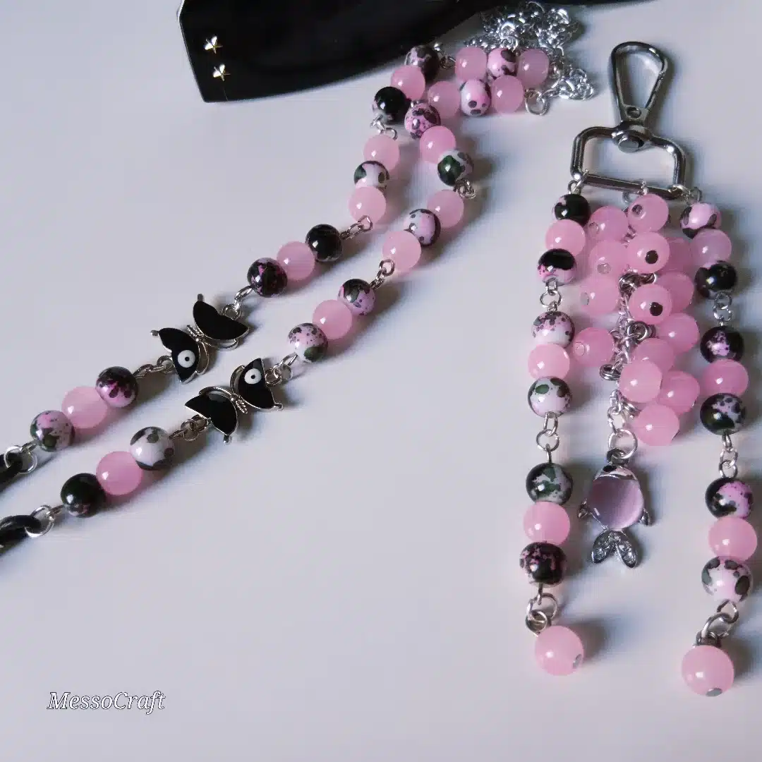 • Set consists of a bag charm and a glasses chain made of rose and mix black alabaster stones, hanged from bag charm a pendant in shape of a fish and in the glasses chain 2 black butterfly pendants