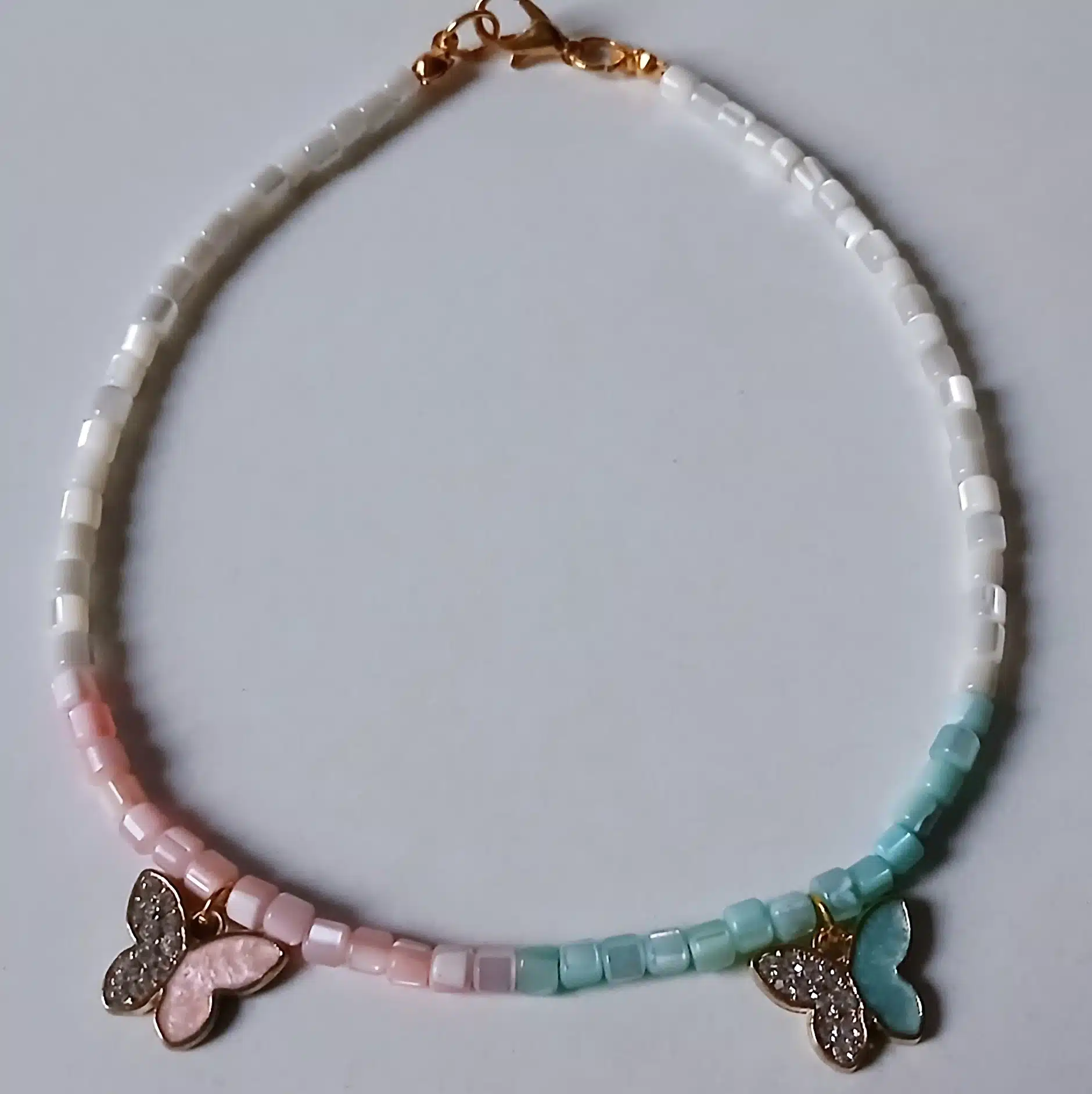 Anklet made of white/powder rose / baby blue seashell stones with rose and blue butterfly pendants