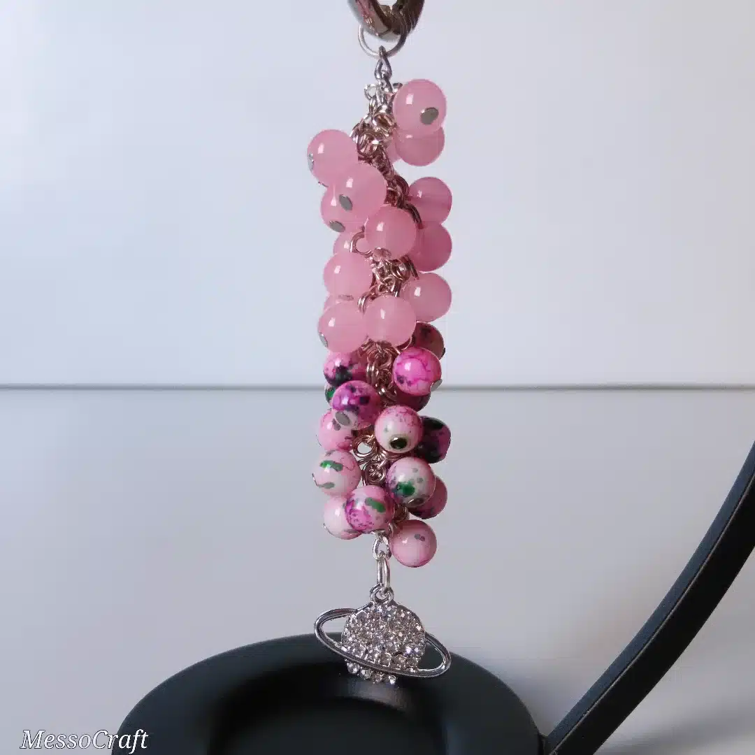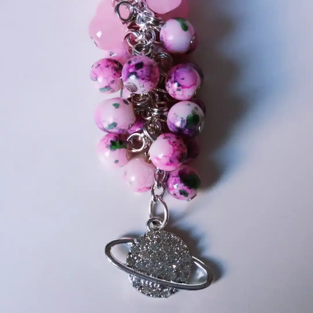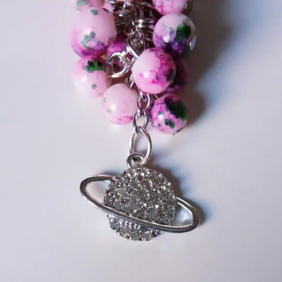 Bag charms made of Rose and mixed colour stones and hanged a pendant in the shape of the galaxy filled with tiny diamond stones
