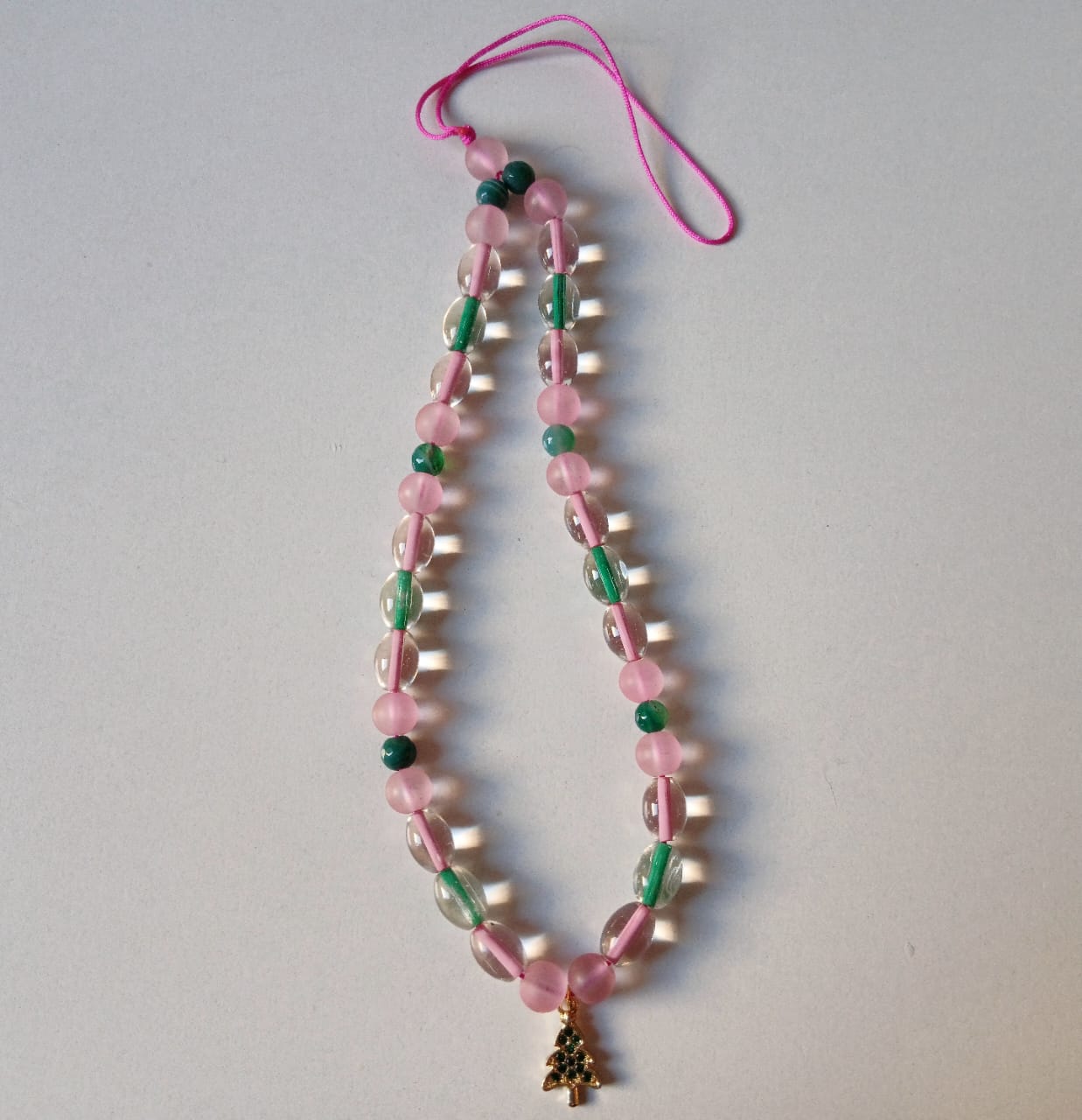 Mobile chain made of rose and green opal stone beads with a xmas tree pendant