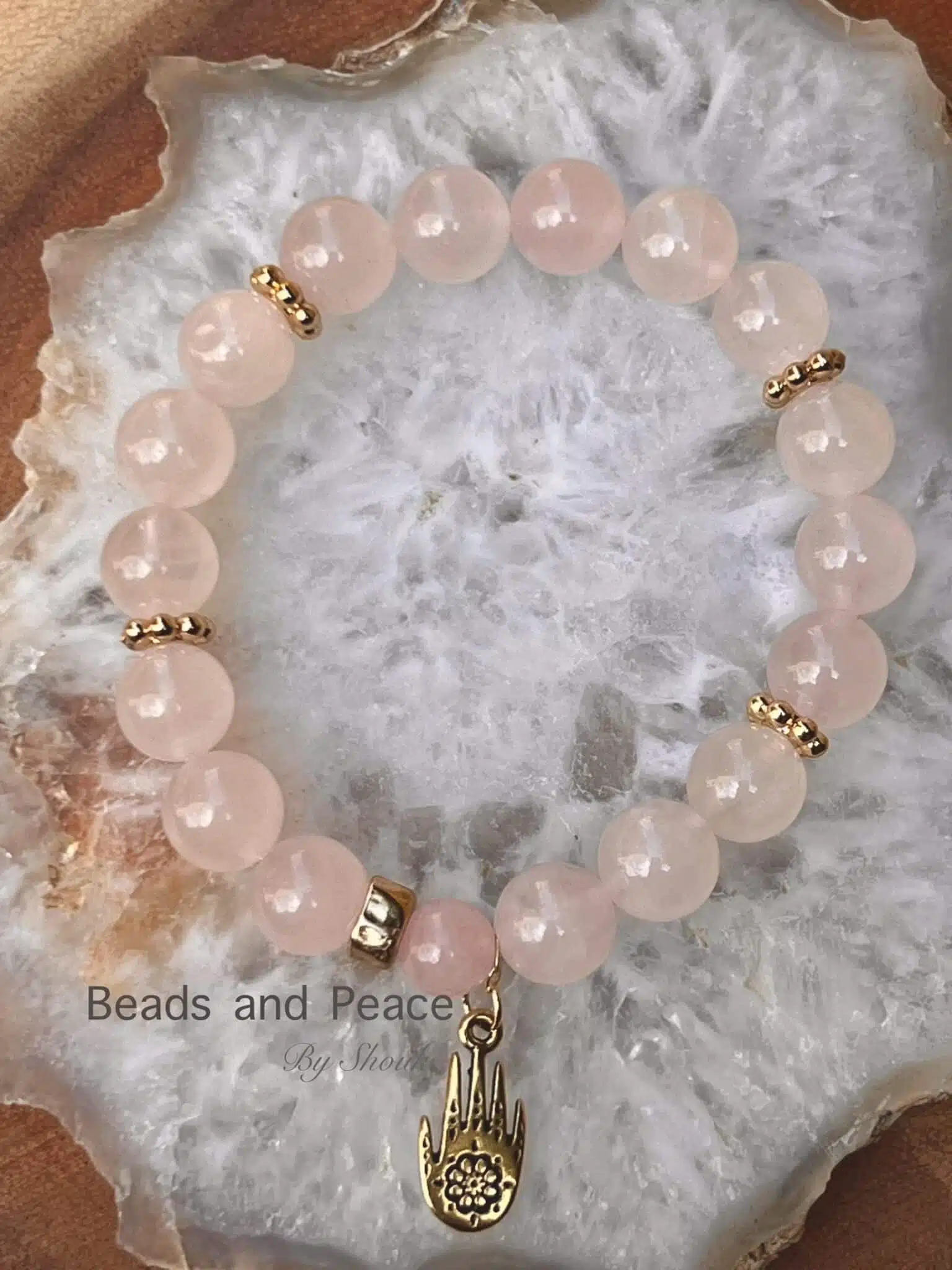 A gorgeous handmade bracelet, 10mm rose quartz beads, with Fatima’s hand charm. Stretch bracelet made with high quality elastic cord to make it easy for you to wear, please roll it don’t pull it. Gold filled separate beads.