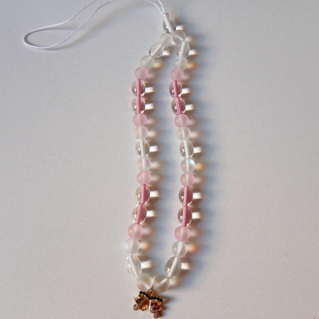 Mobile chain made of rose and white opal stone beads with a xmas bells pendant