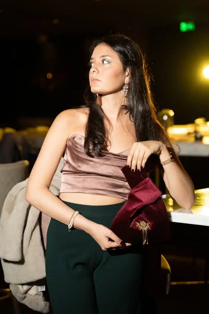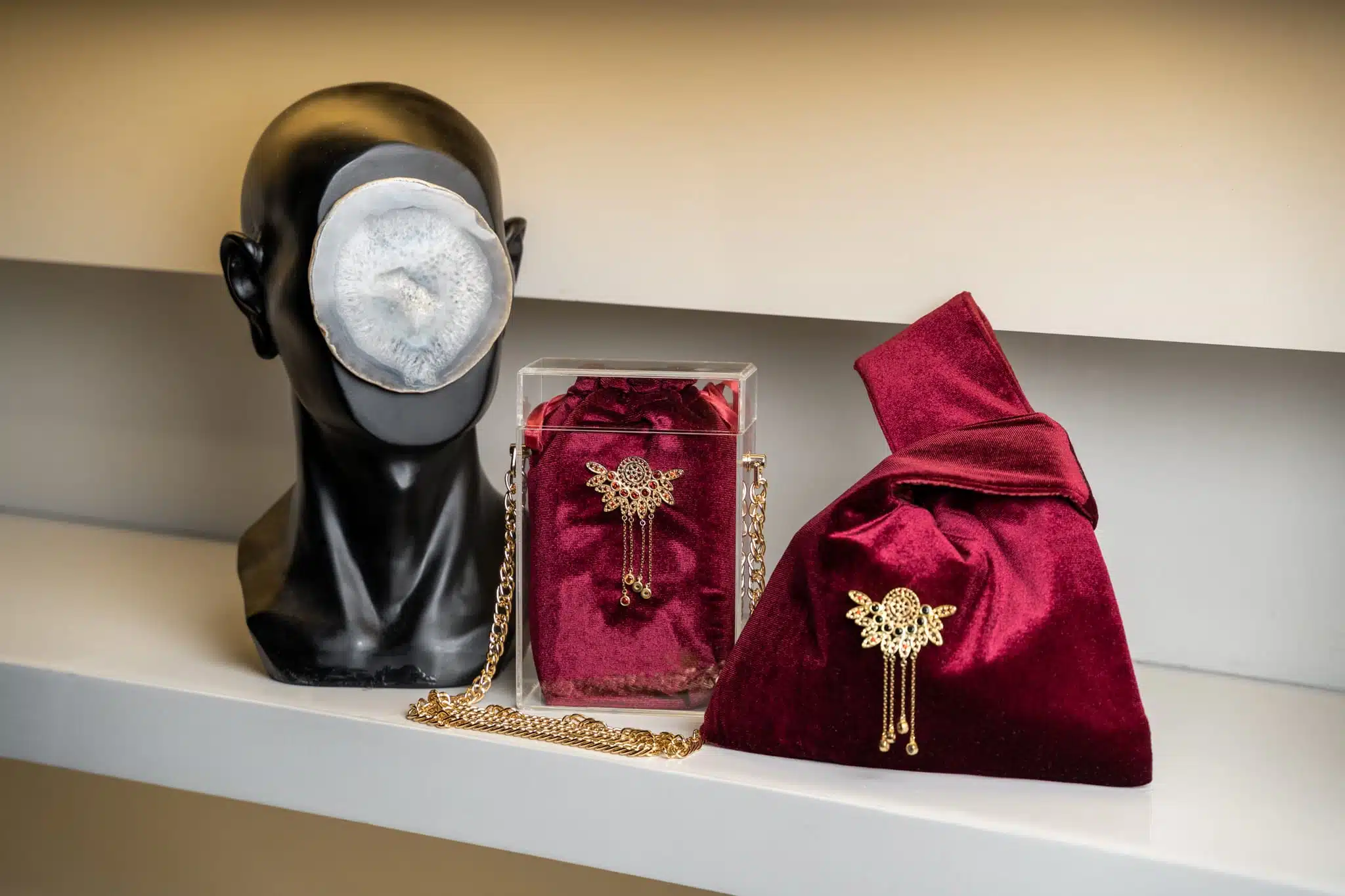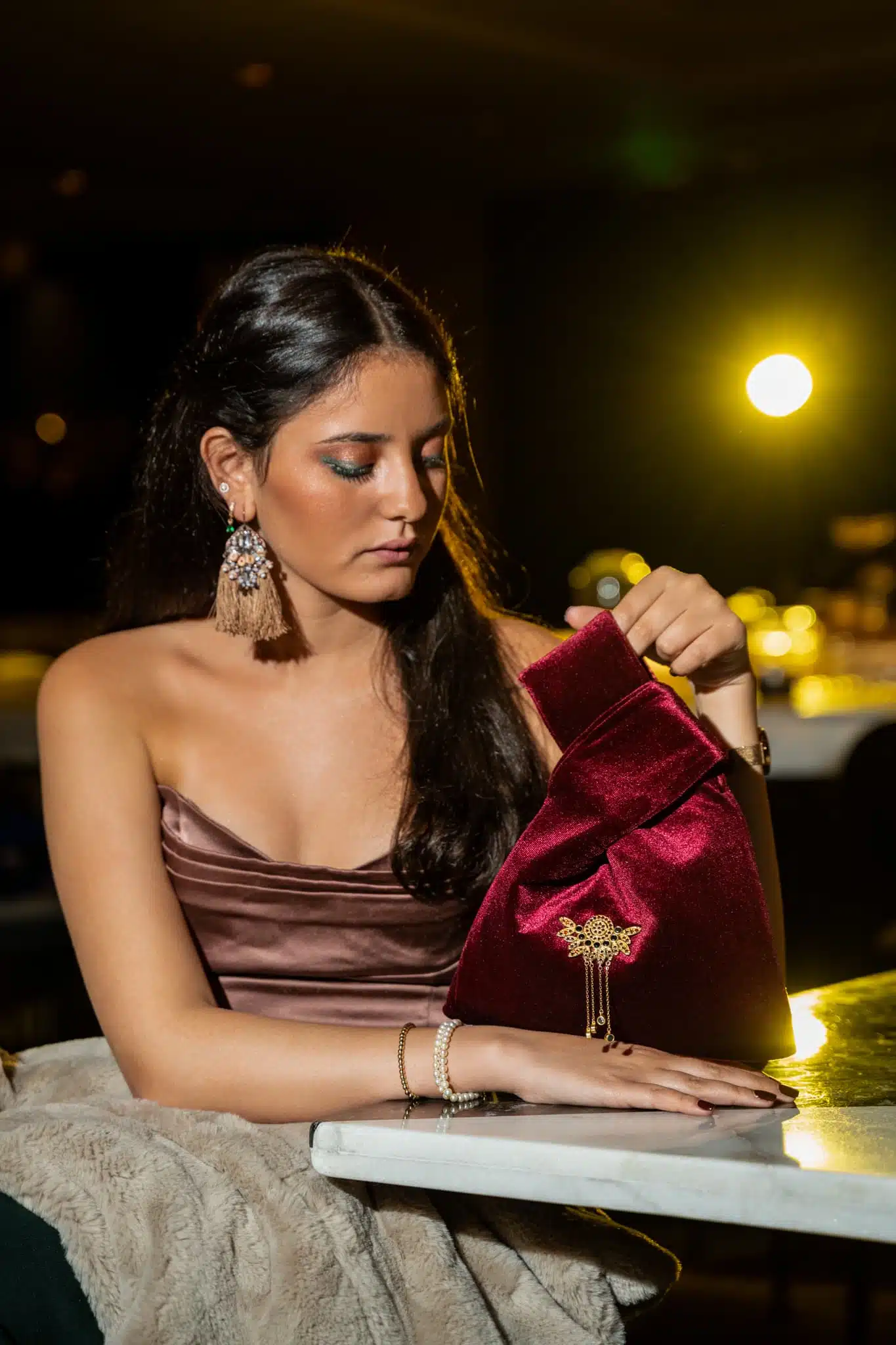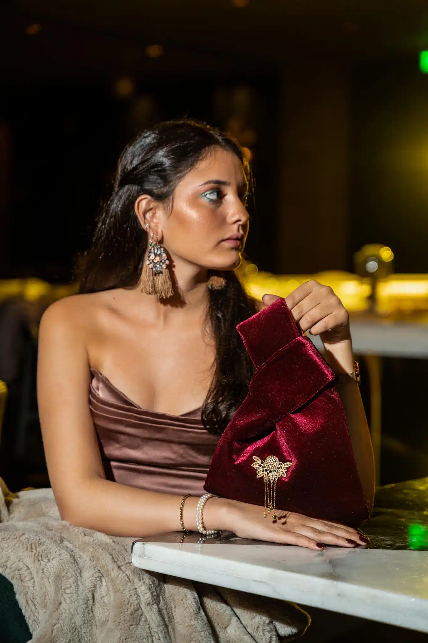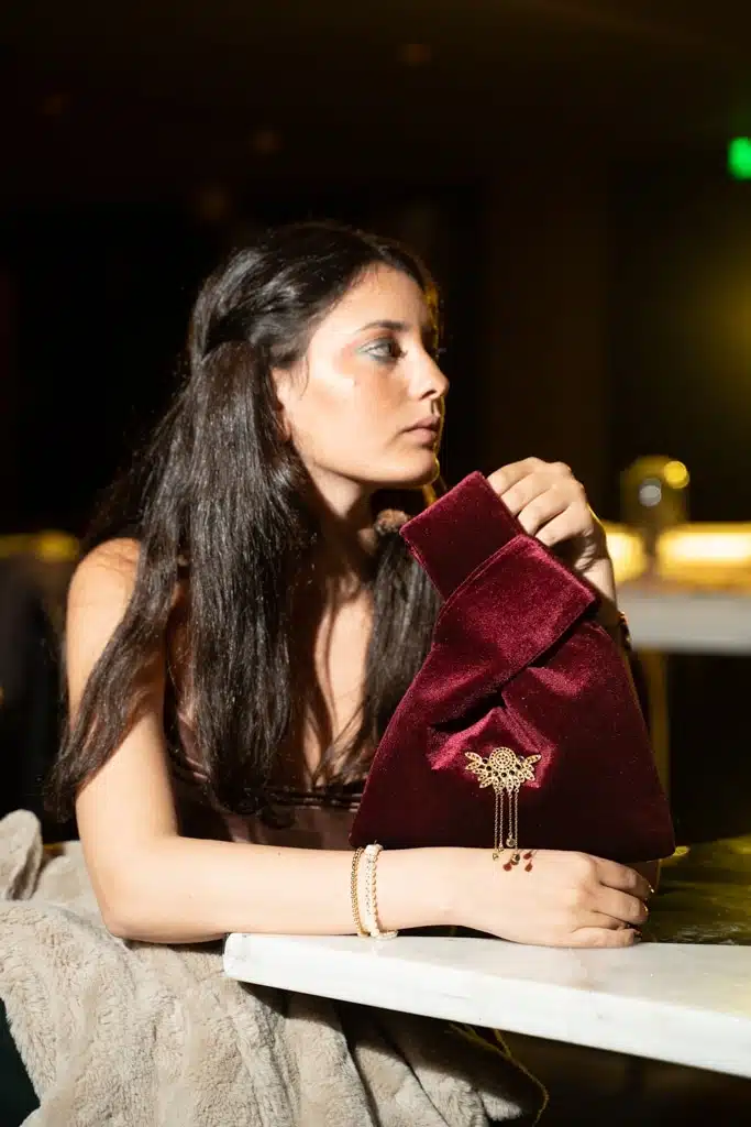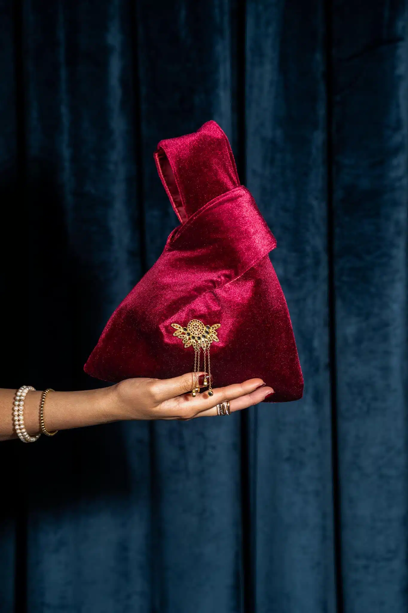 Royal Red Japanese Knot Wristbag, in rich Velvet Material , tailored with inside satin lining, and our signature yellow gold-embedded piece with Black & Red stones, by CH by Christine Habib Azer,