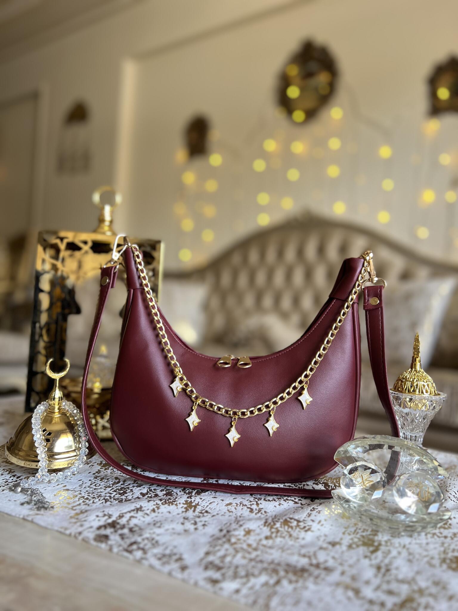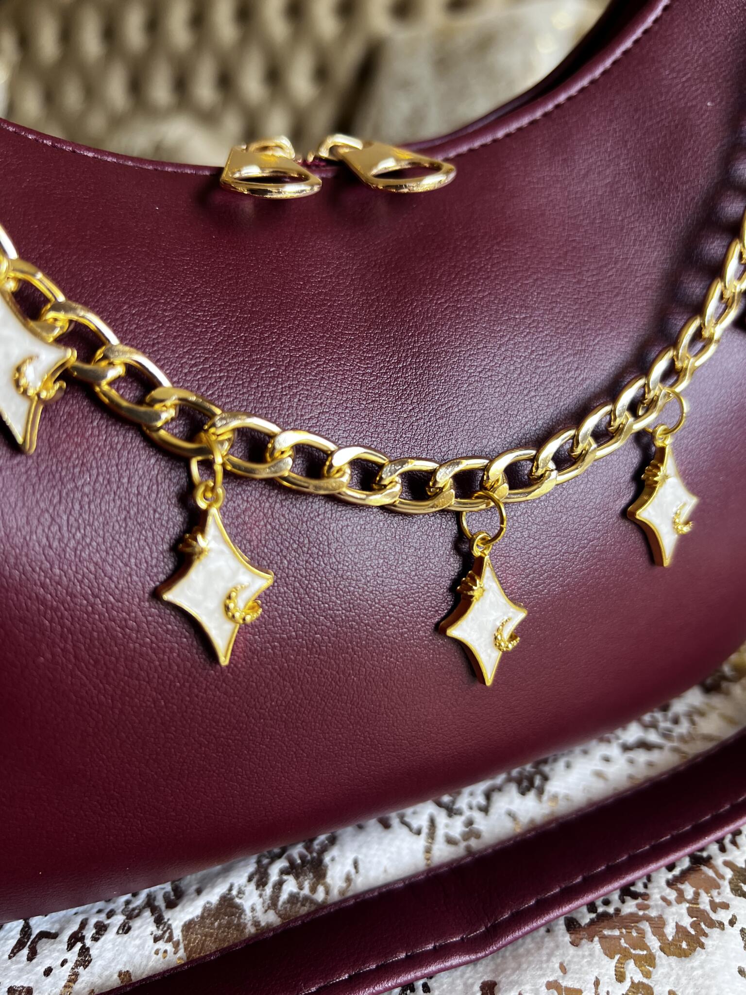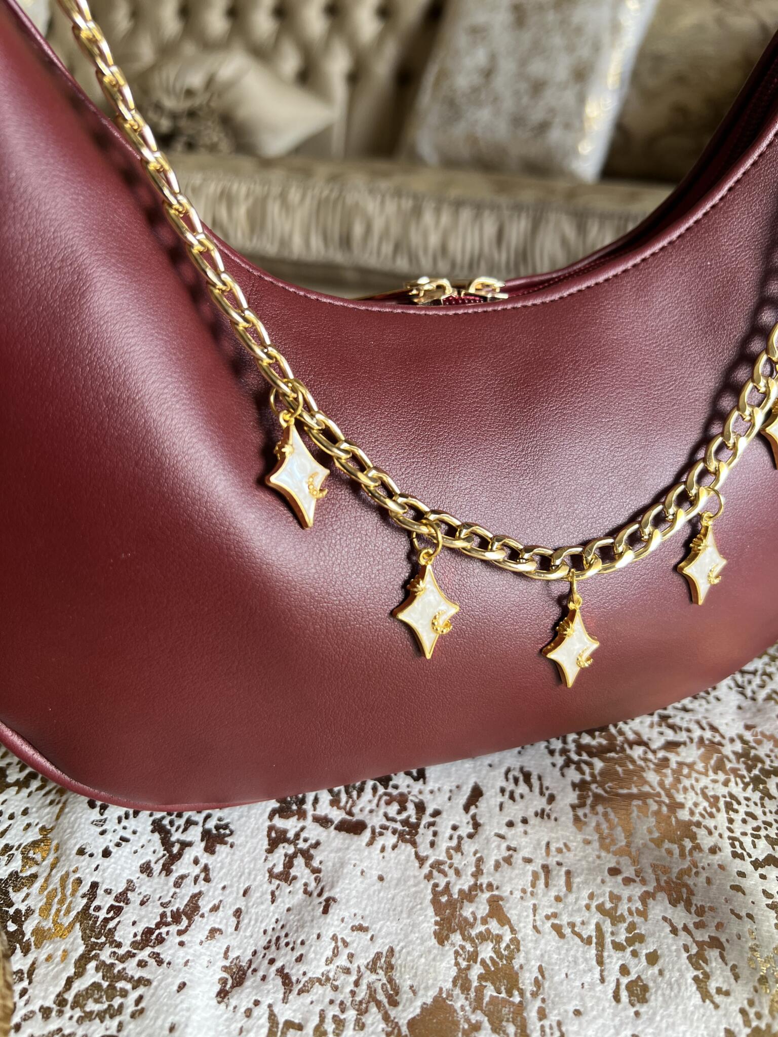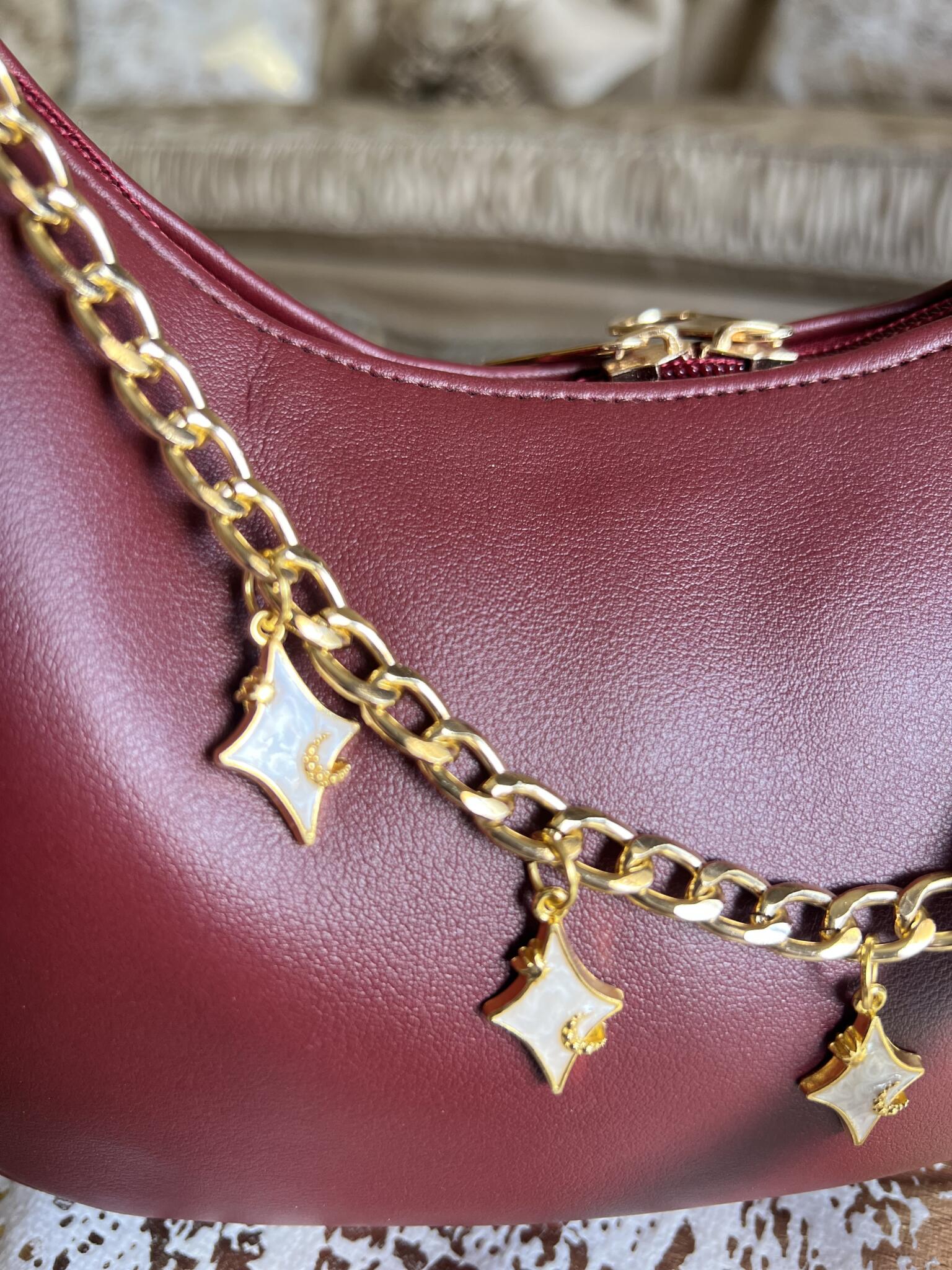 Rich burgundy elegance adorned with pink marble charms, a crescent moon, and delicate stars — a bold yet feminine statement piece.