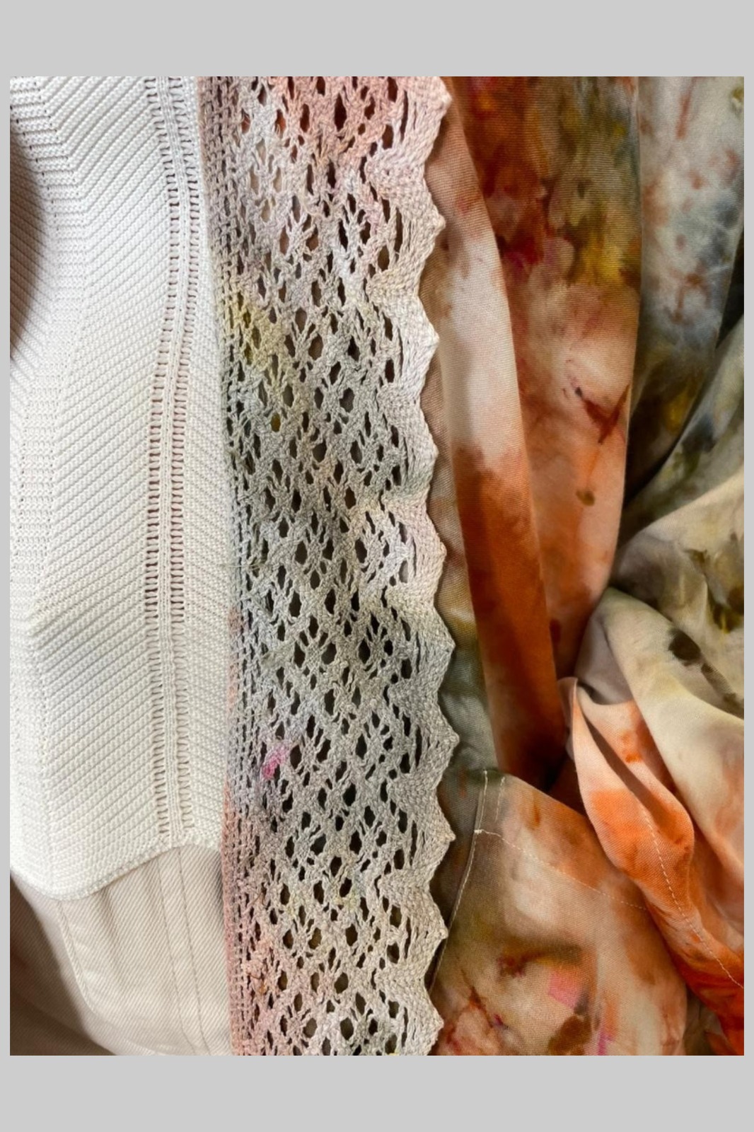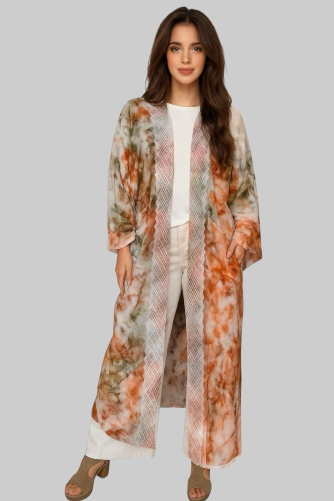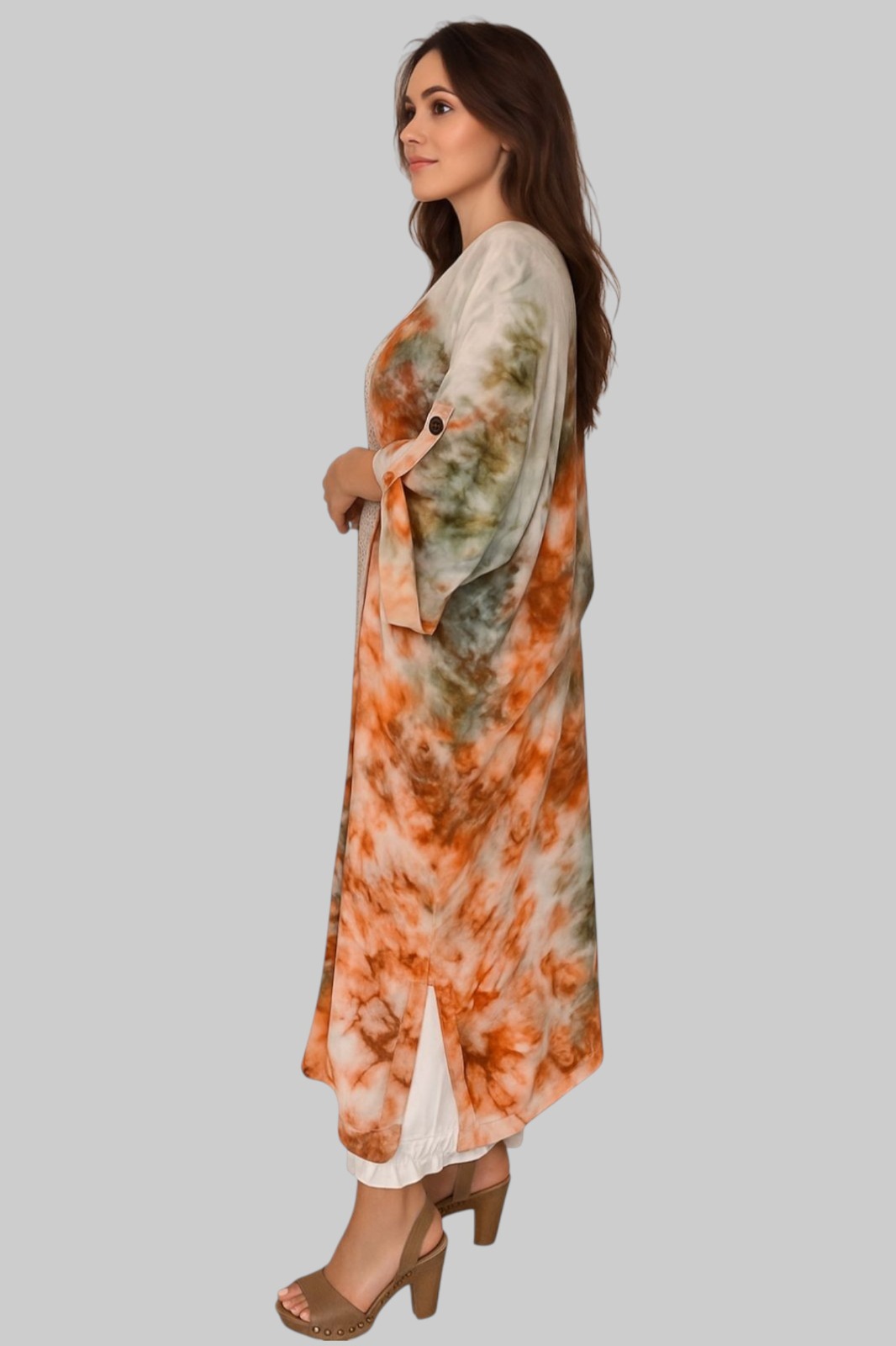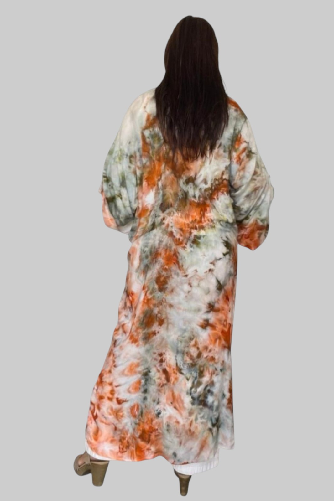 Elevate your wardrobe with this luxurious boho kimono, handcrafted from soft, breathable viscose and finished with a unique hand ice-dye technique. Each kimono is a one-of-a-kind masterpiece, blending earthy orange, green, and neutral tones for a statement look that’s perfect for resort wear, beach cover-ups, or chic layering. Can be worn with the matching Jumpsuit.