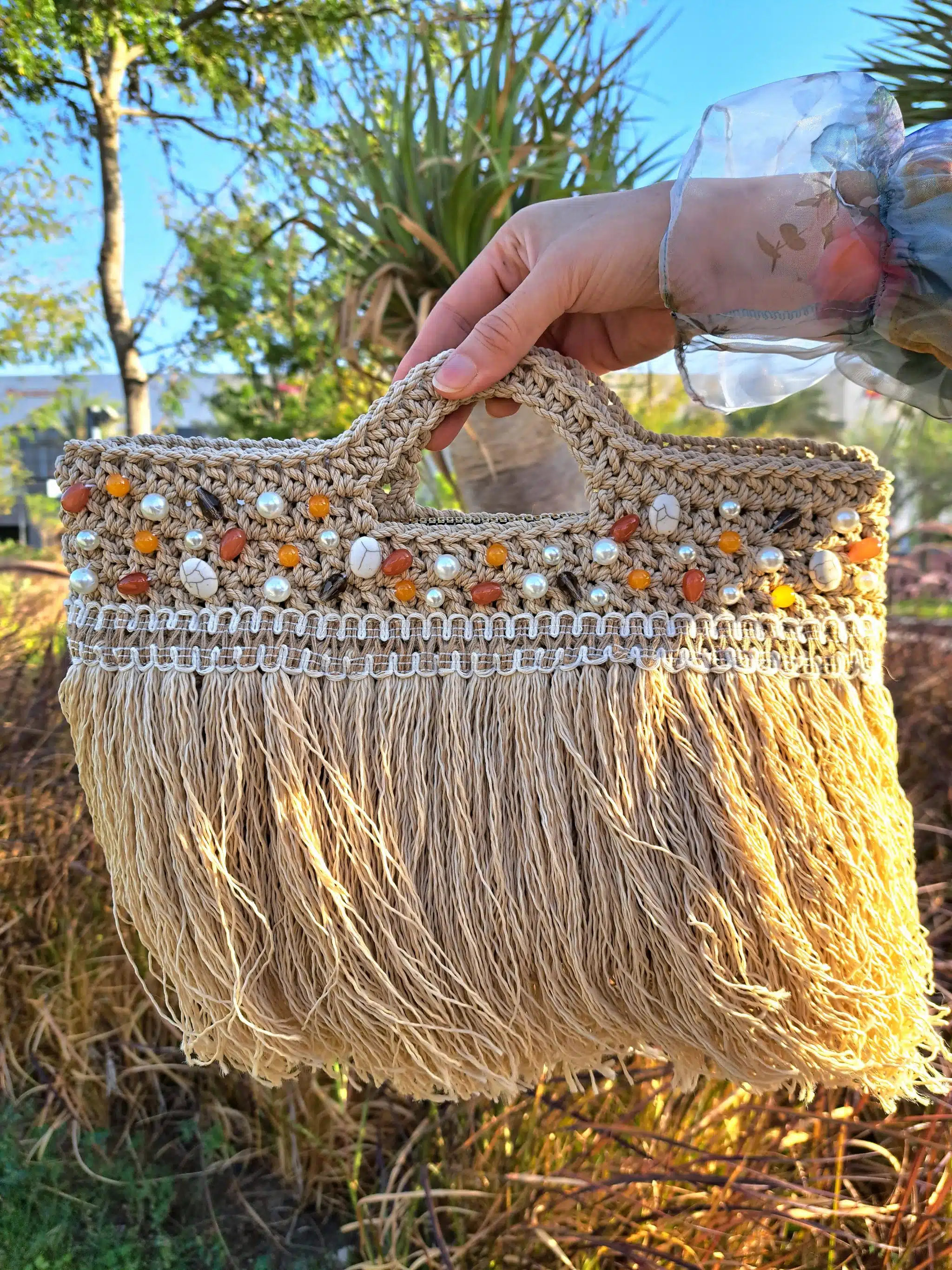 with a long strape, gold zipper, inner coating & decorating crystals & stones.