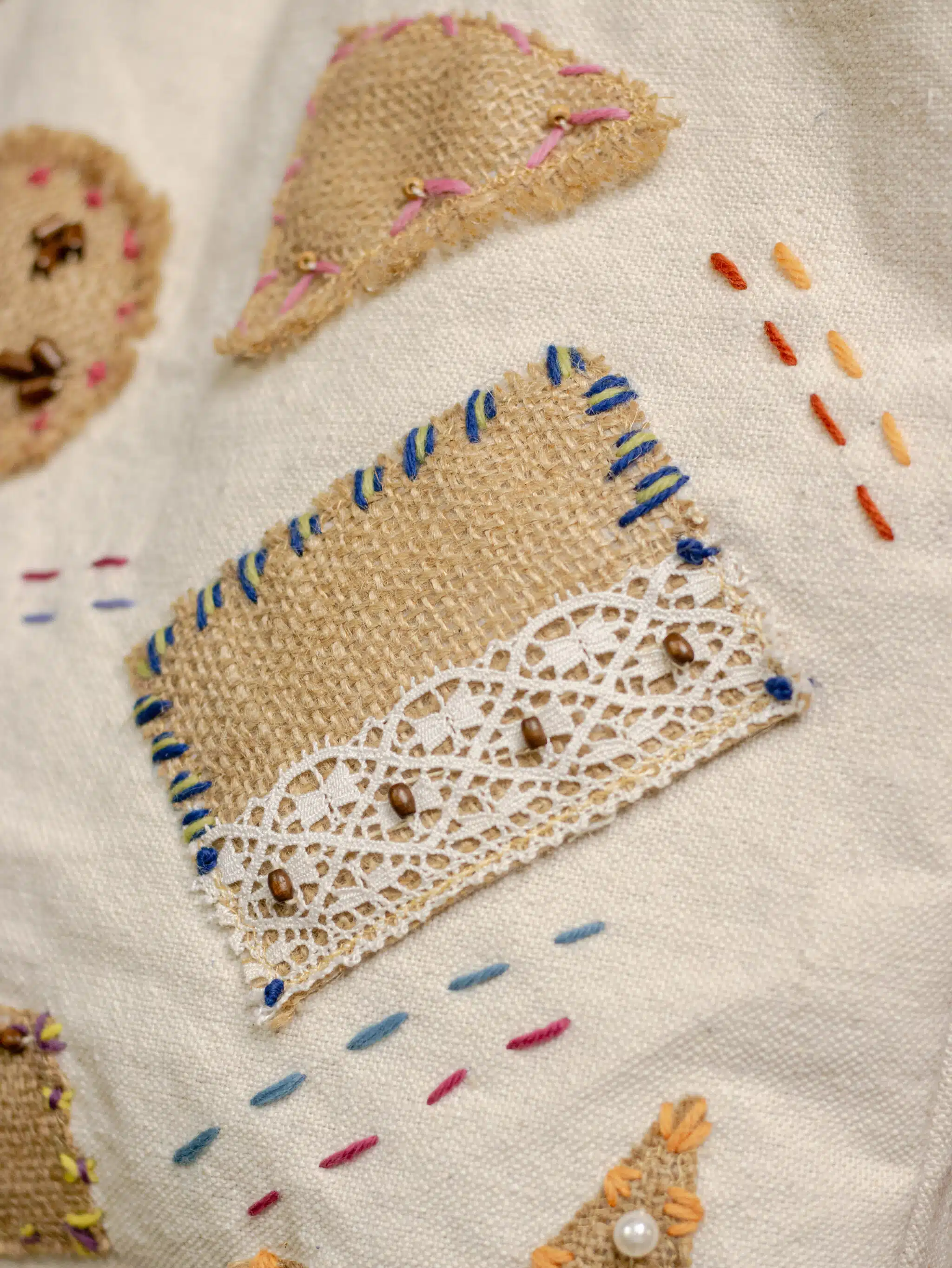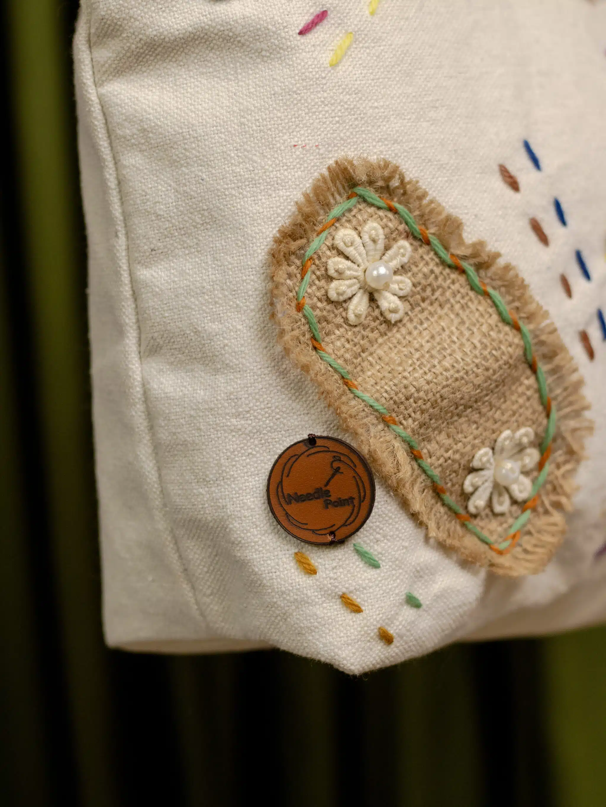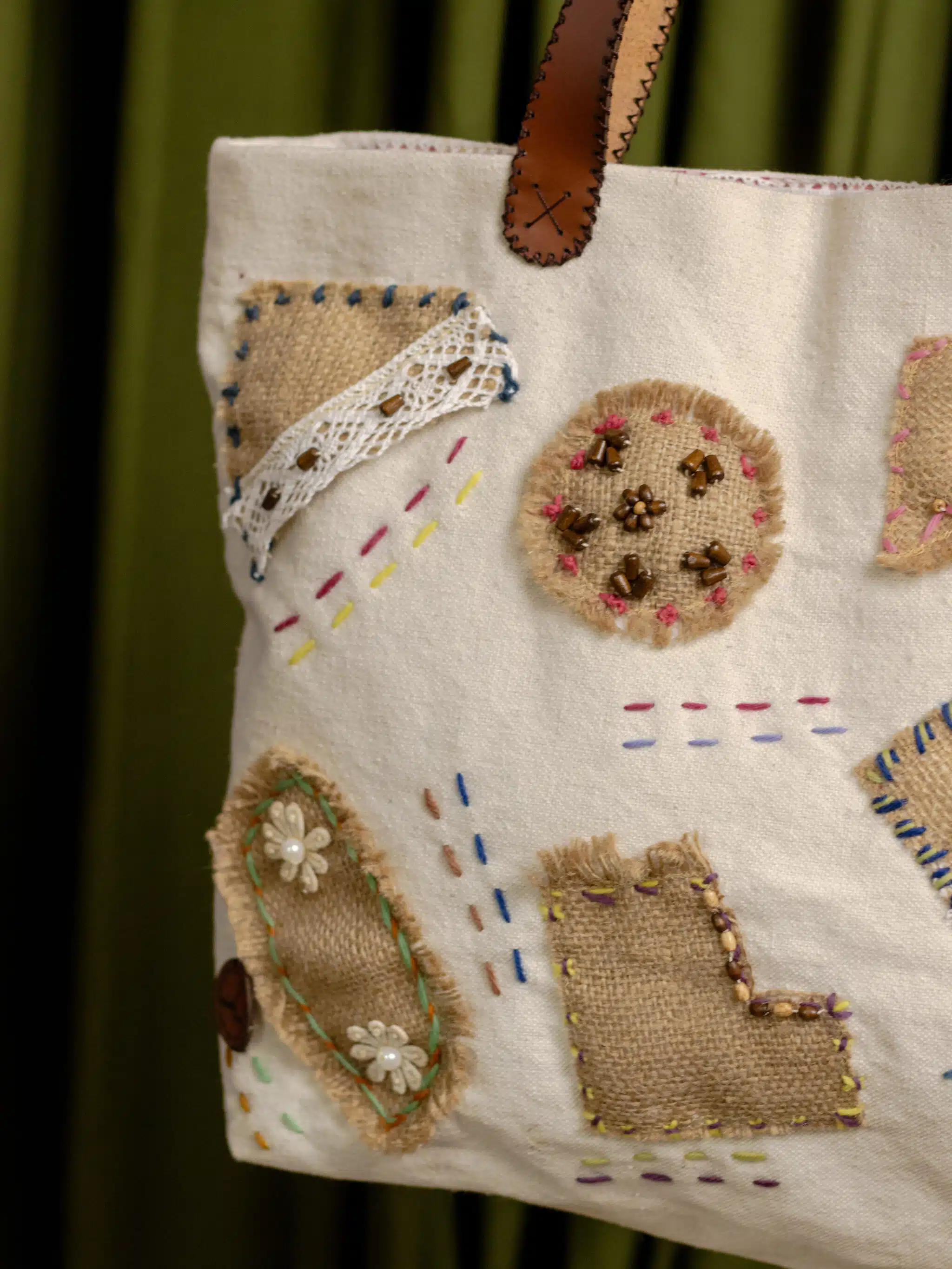 Made from high-quality Egyptian cotton, this unique handbag features traditional burlap appliqué, hand-embroidered with colorful threads, shimmering beads, and delicate faux pearls.
