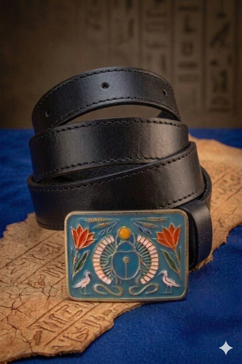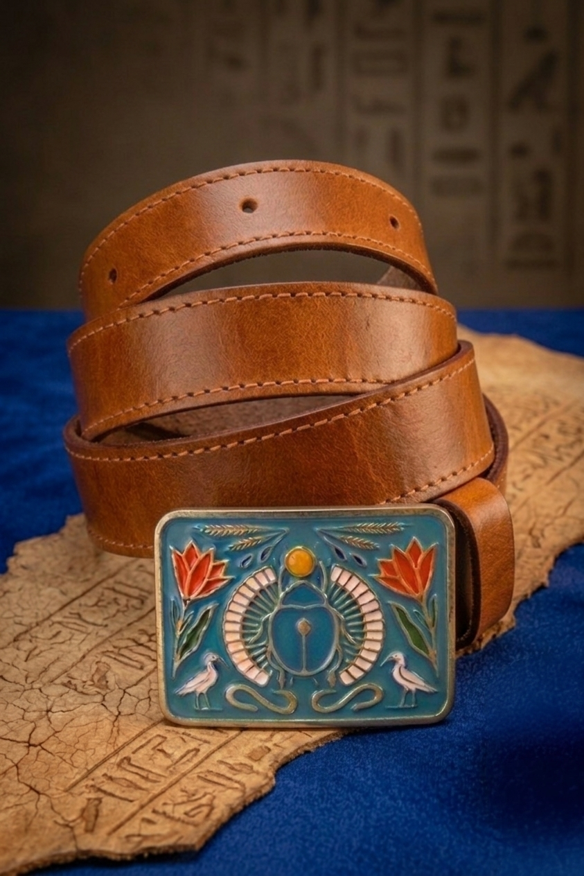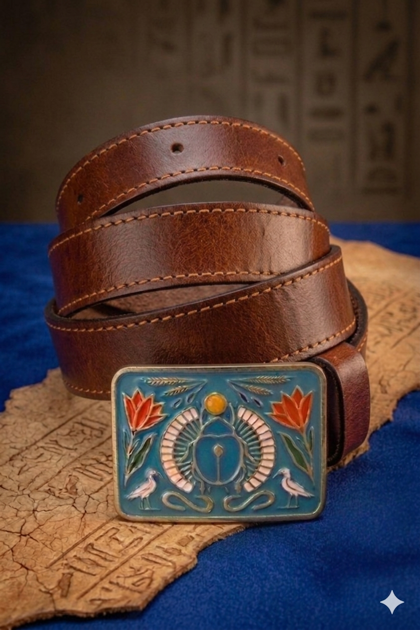 The metal buckle features an artistic design inspired by ancient Egyptian art, adding a distinctive touch that transforms the belt from a simple accessory into a statement of identity and style.