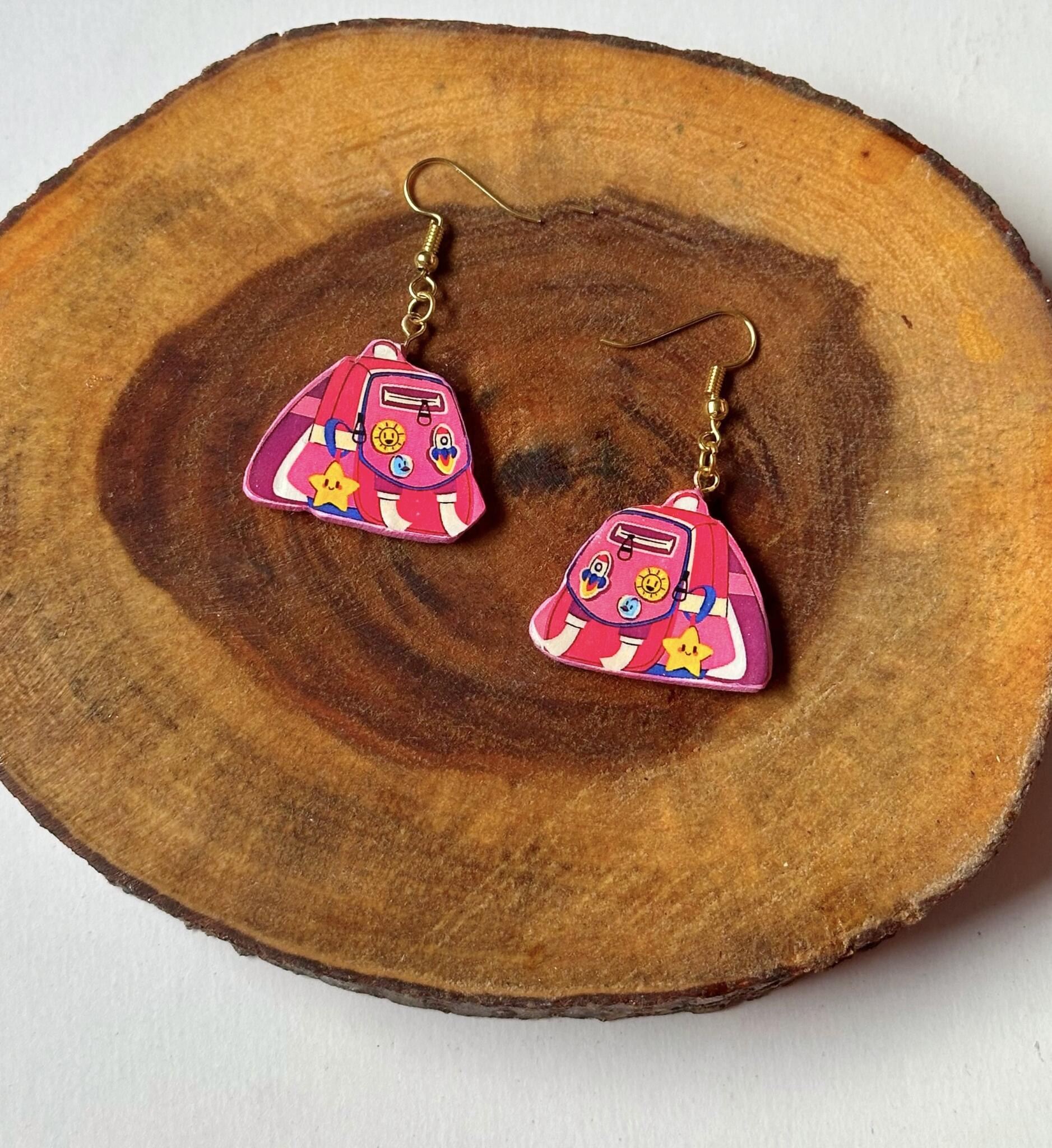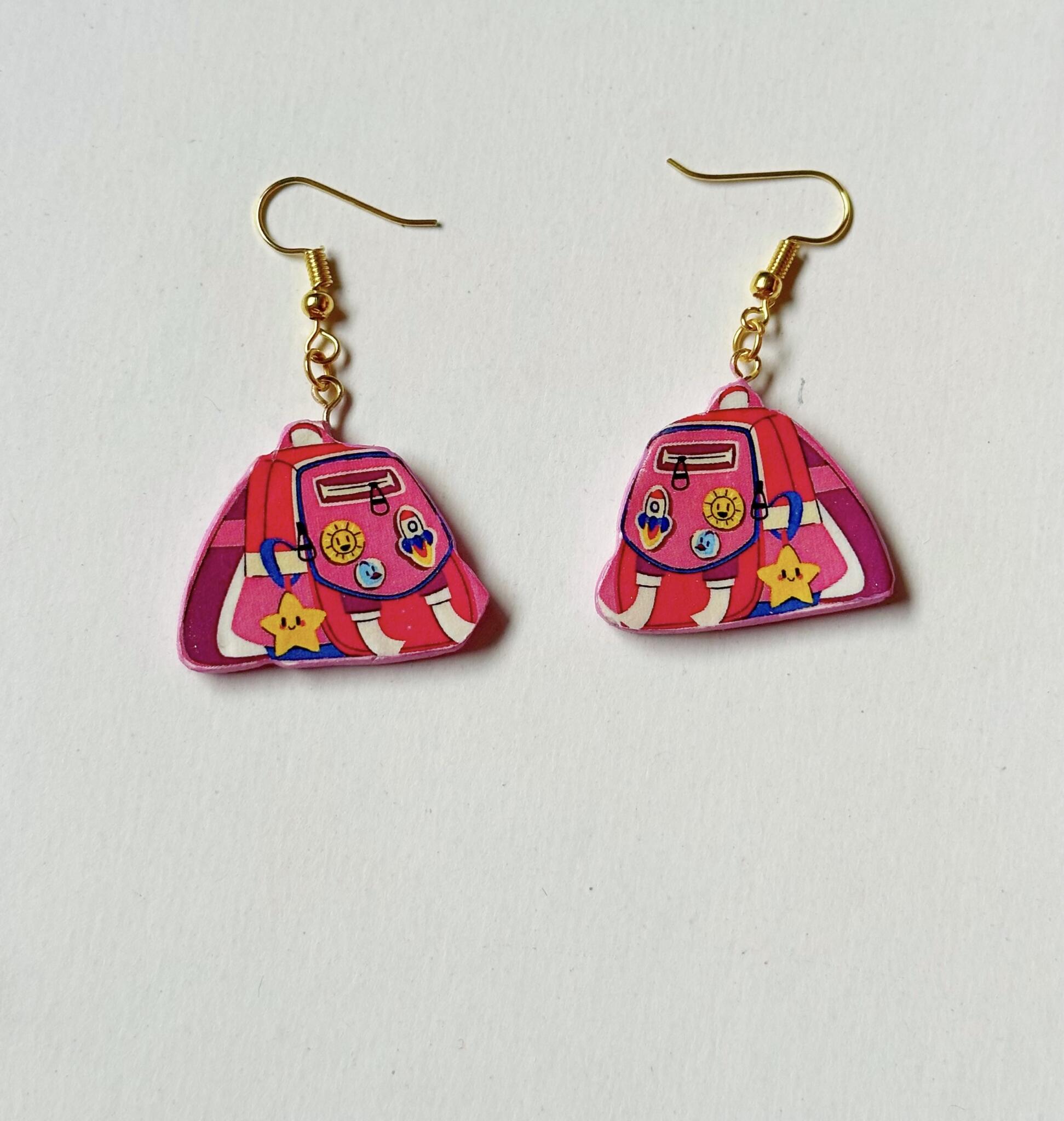 Unique handmade earrings featuring two school bags charms, a fun reminder of school days and a touch of artistic style.