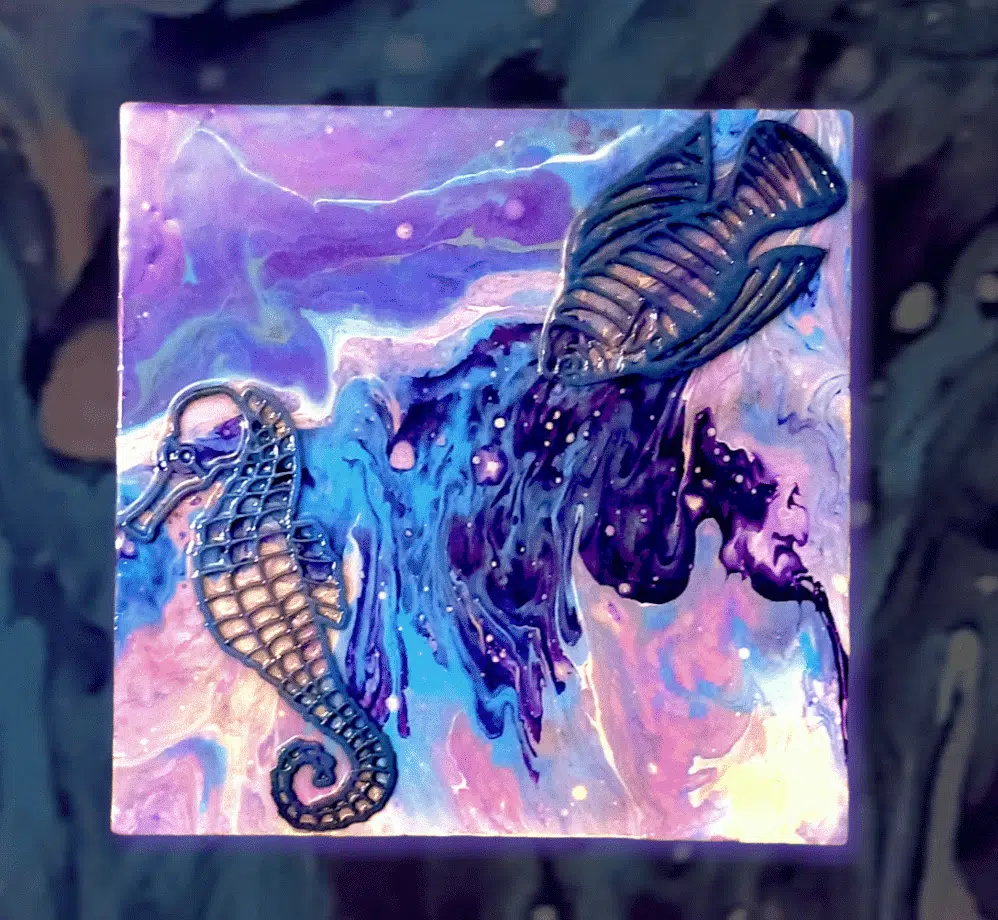 Seahorse and fish acrylic tableau – pouring art style with resin top coat