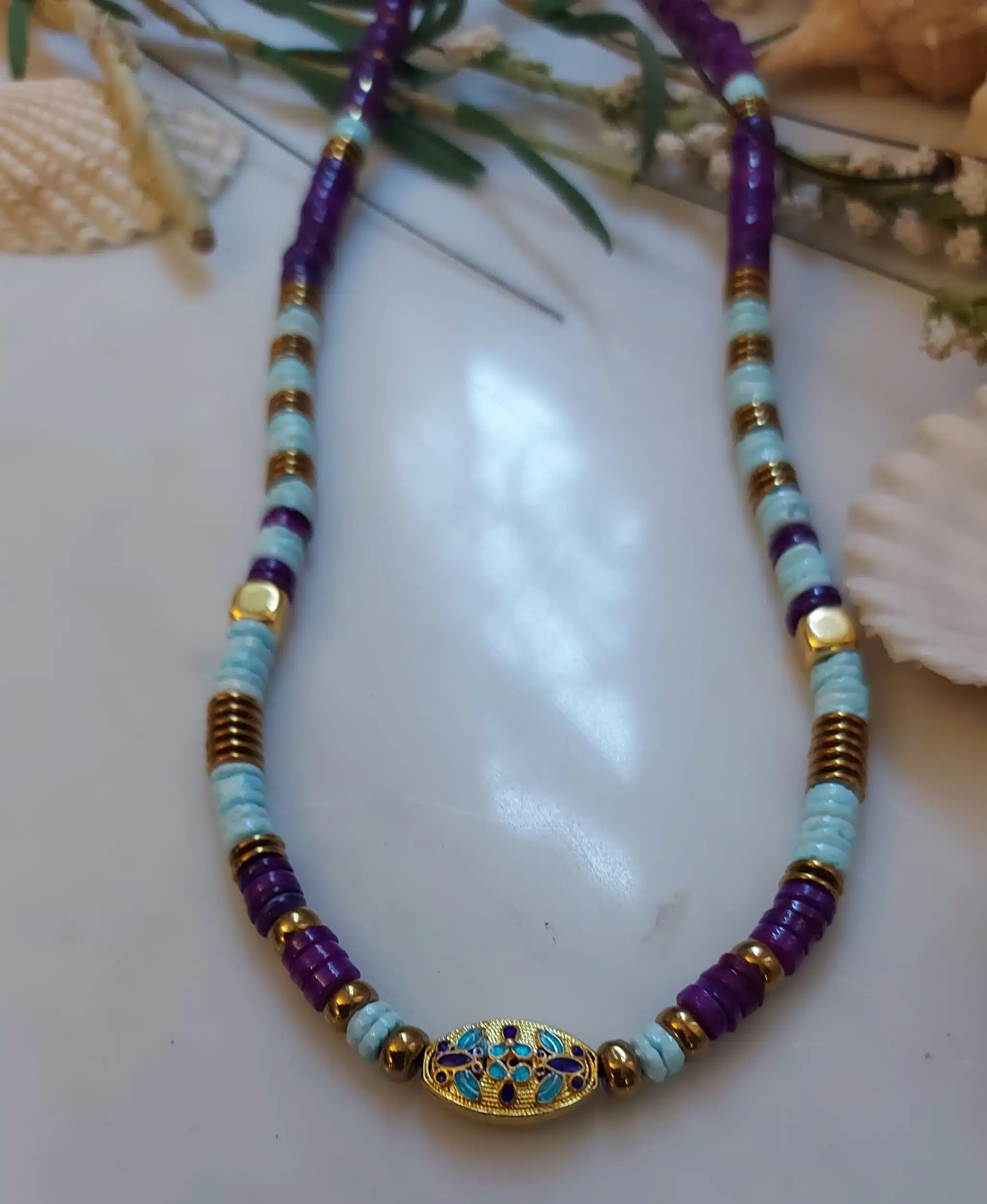 Handmade necklaces by seashell beads and India motifain the middle