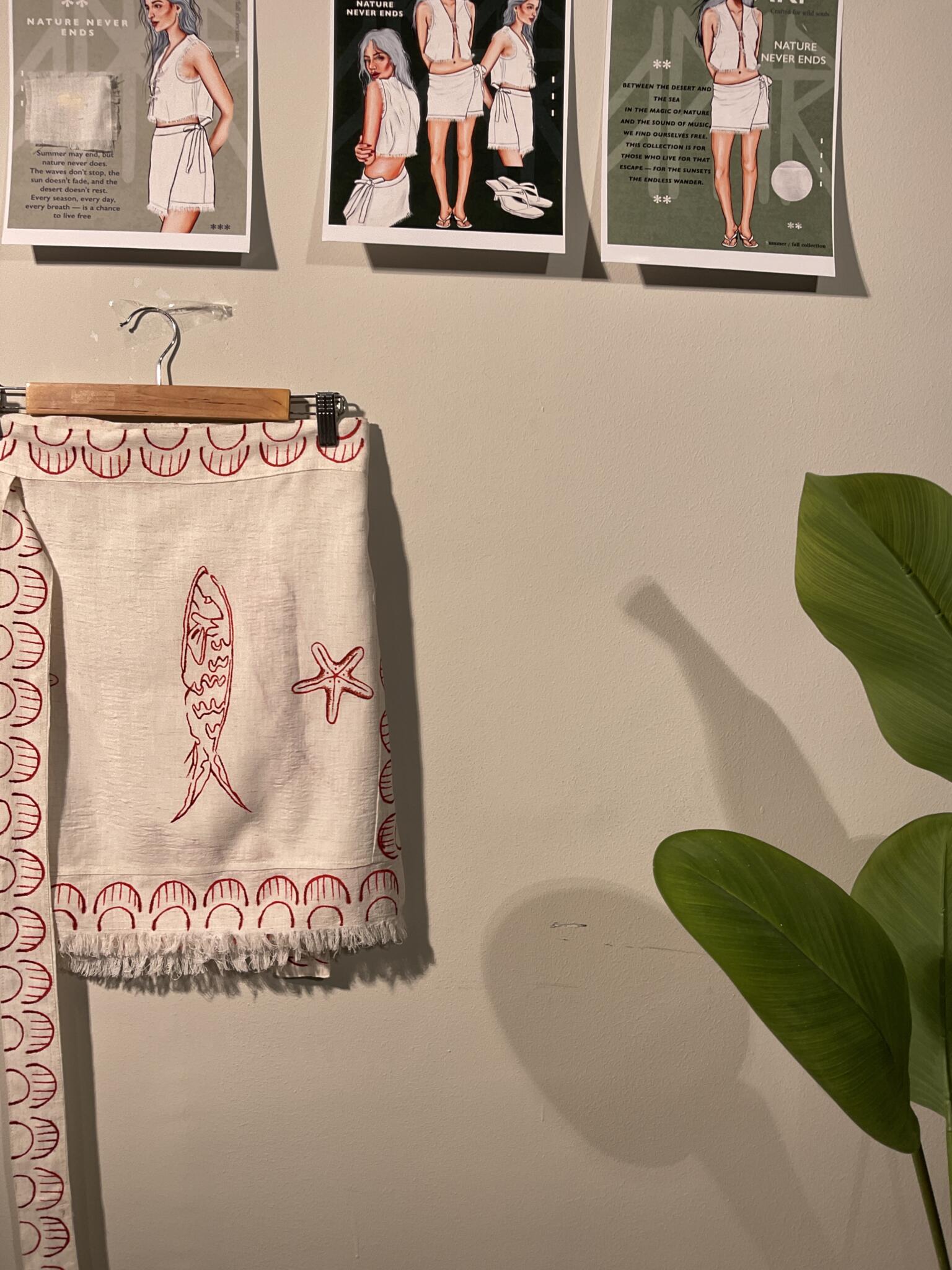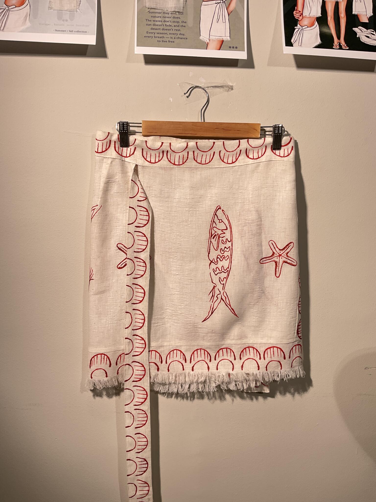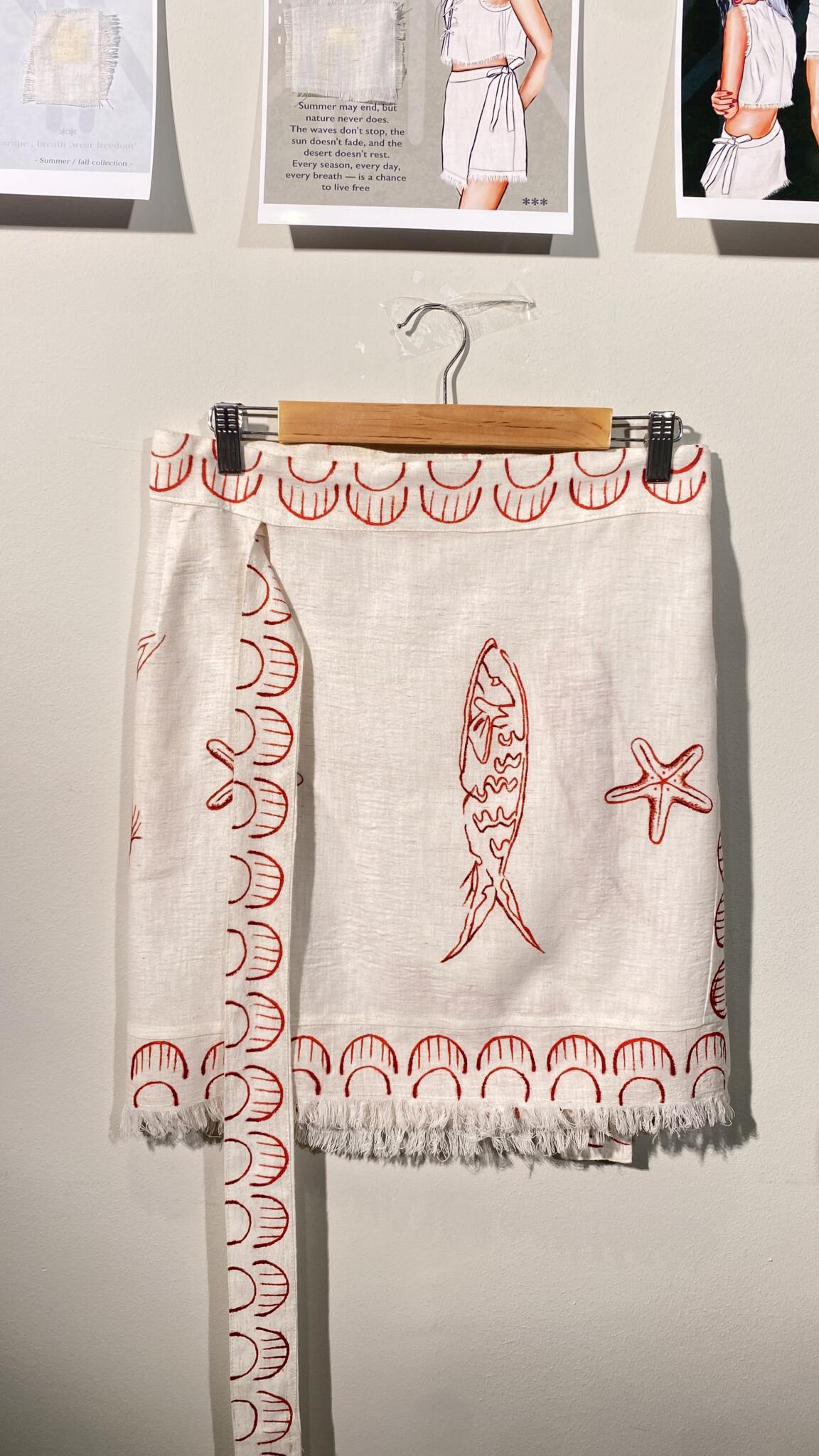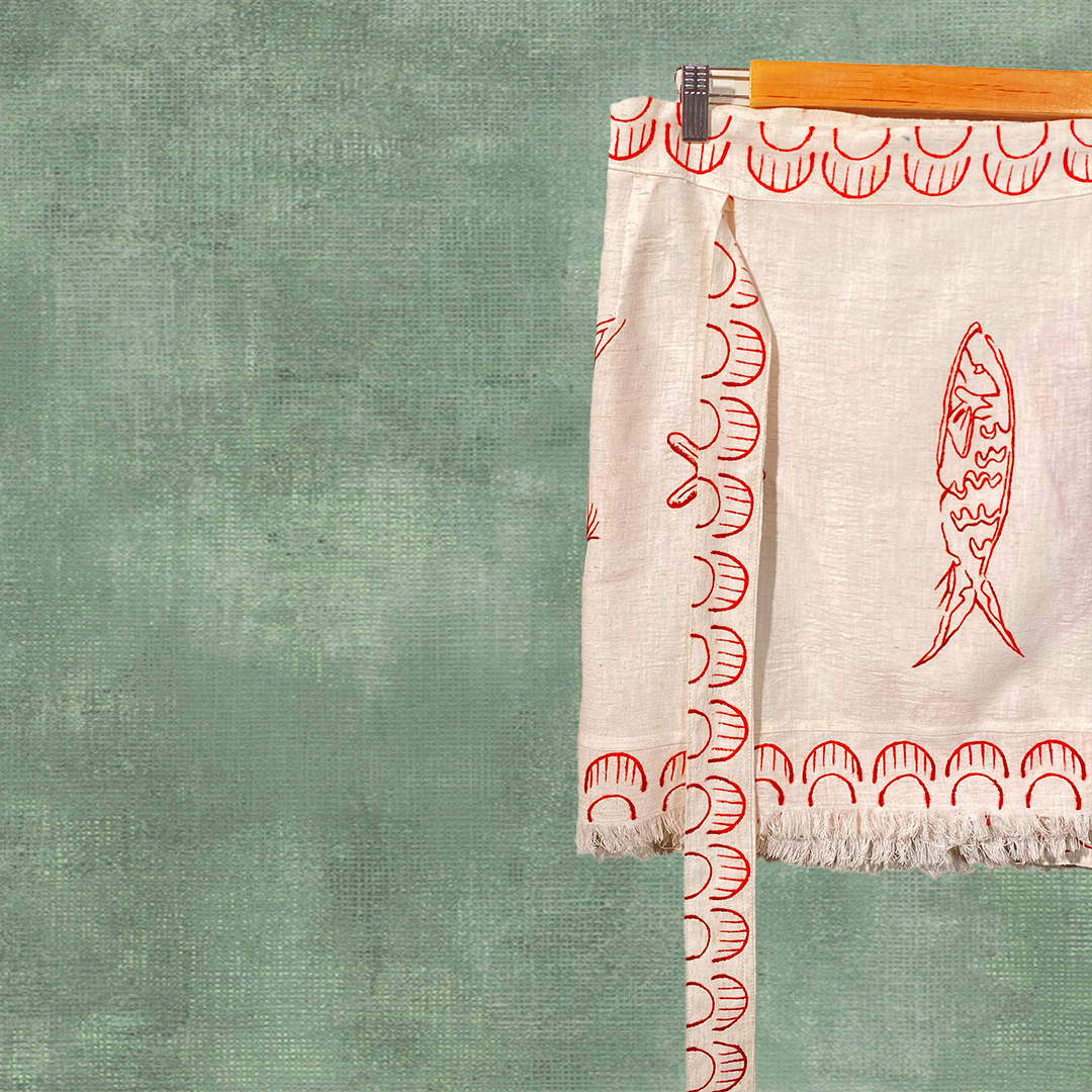 Wrap linen hand painted skirt with marine-inspired motifs — each brushstroke adds a unique artistic touch details with raw unfinished edges crafted from textured African linen in a white & beige tones.