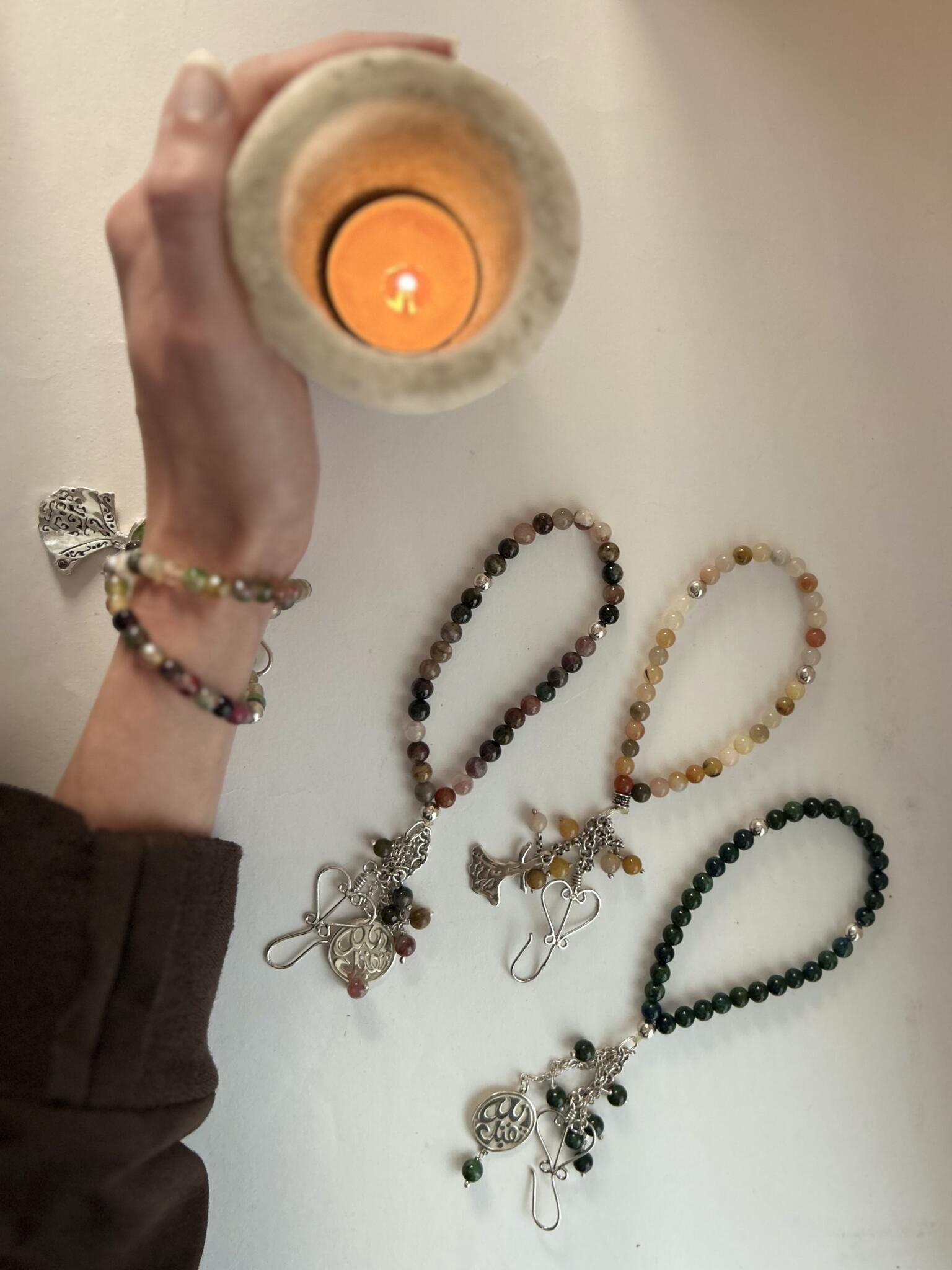 Sebha bracelet with sterling silver charms and semiprecious stones