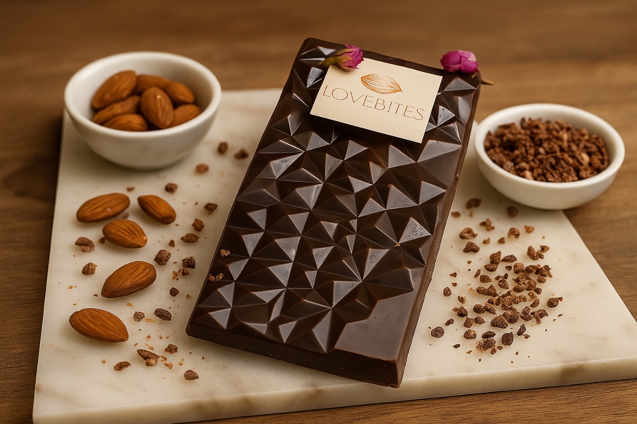 - Artisanal hand made semi dark chocolate bar 90-110 gram salted almonds and croquent