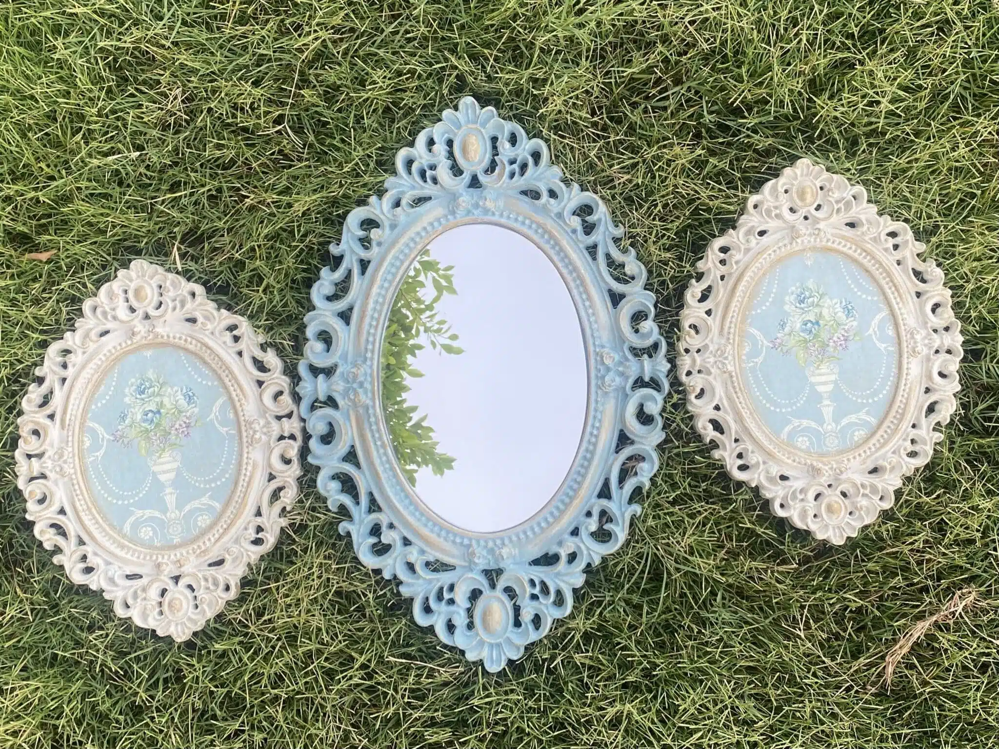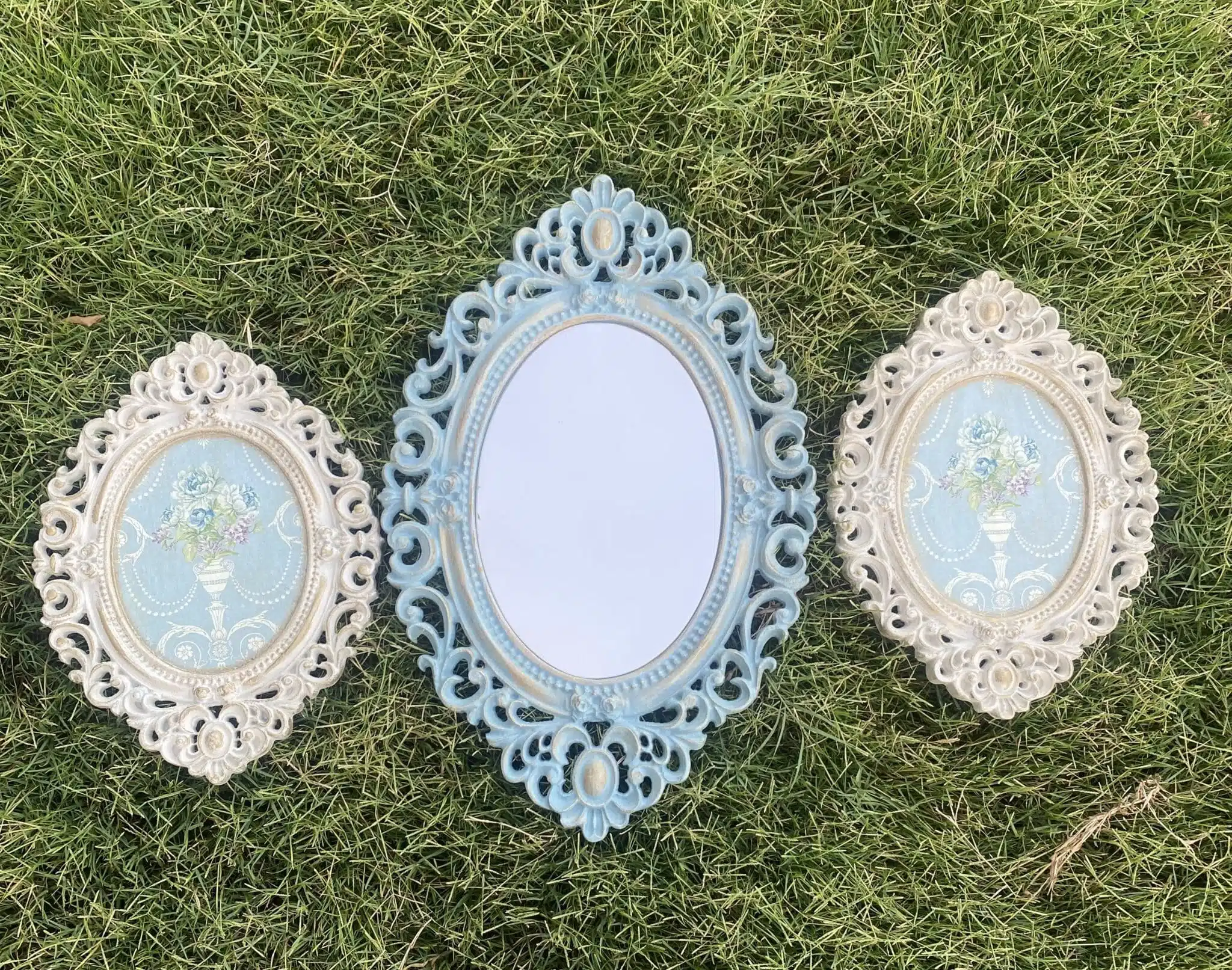 Set of wooden mirror and matching tableaux in vanilla and vintage blue colors with touch of gold