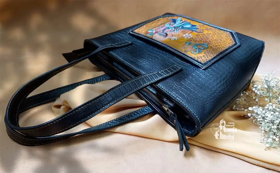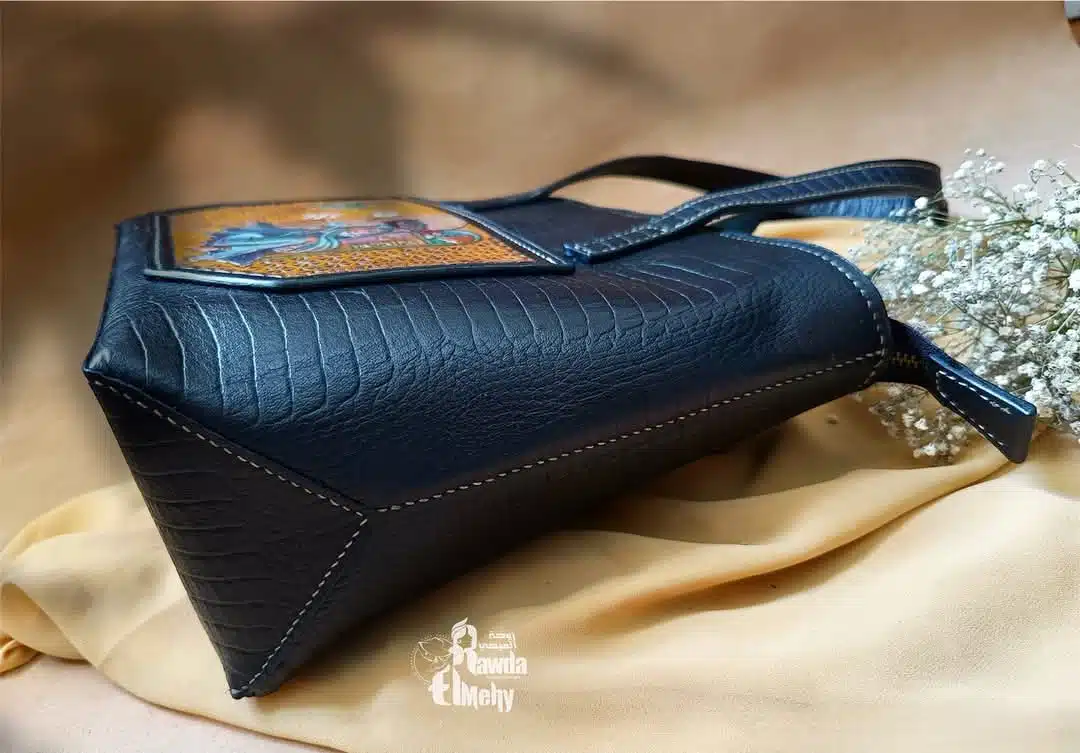 External bag pocket made of full grain natural leather, Handmade carving and Engraving and colored with colors specialized for natural leather .
