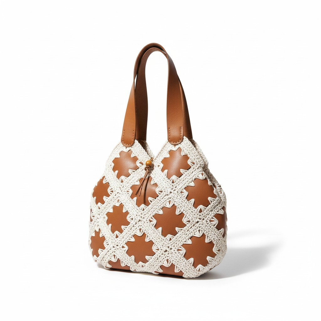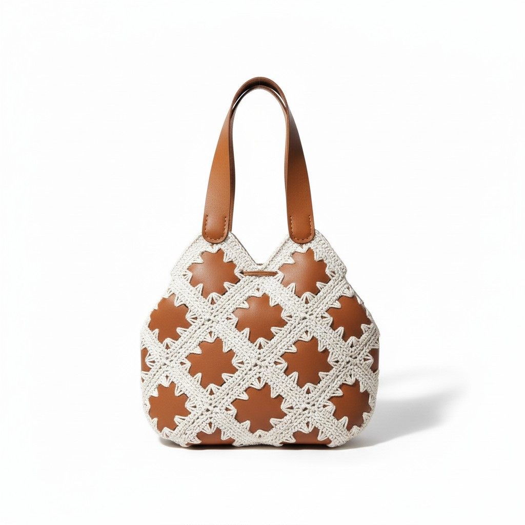 Handmade crochet tote bag, made of off white cotton yarn and natural leather patches.