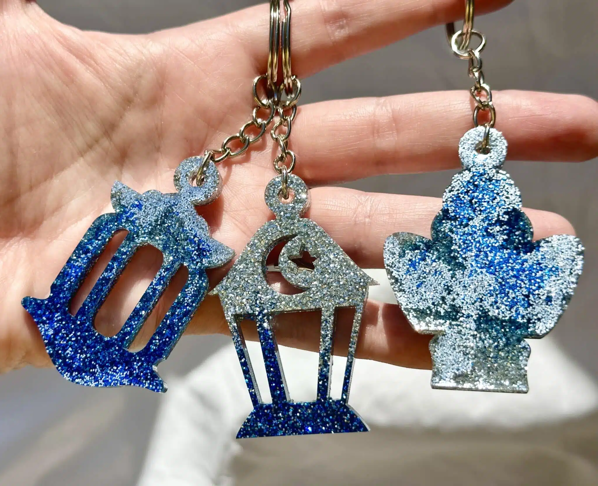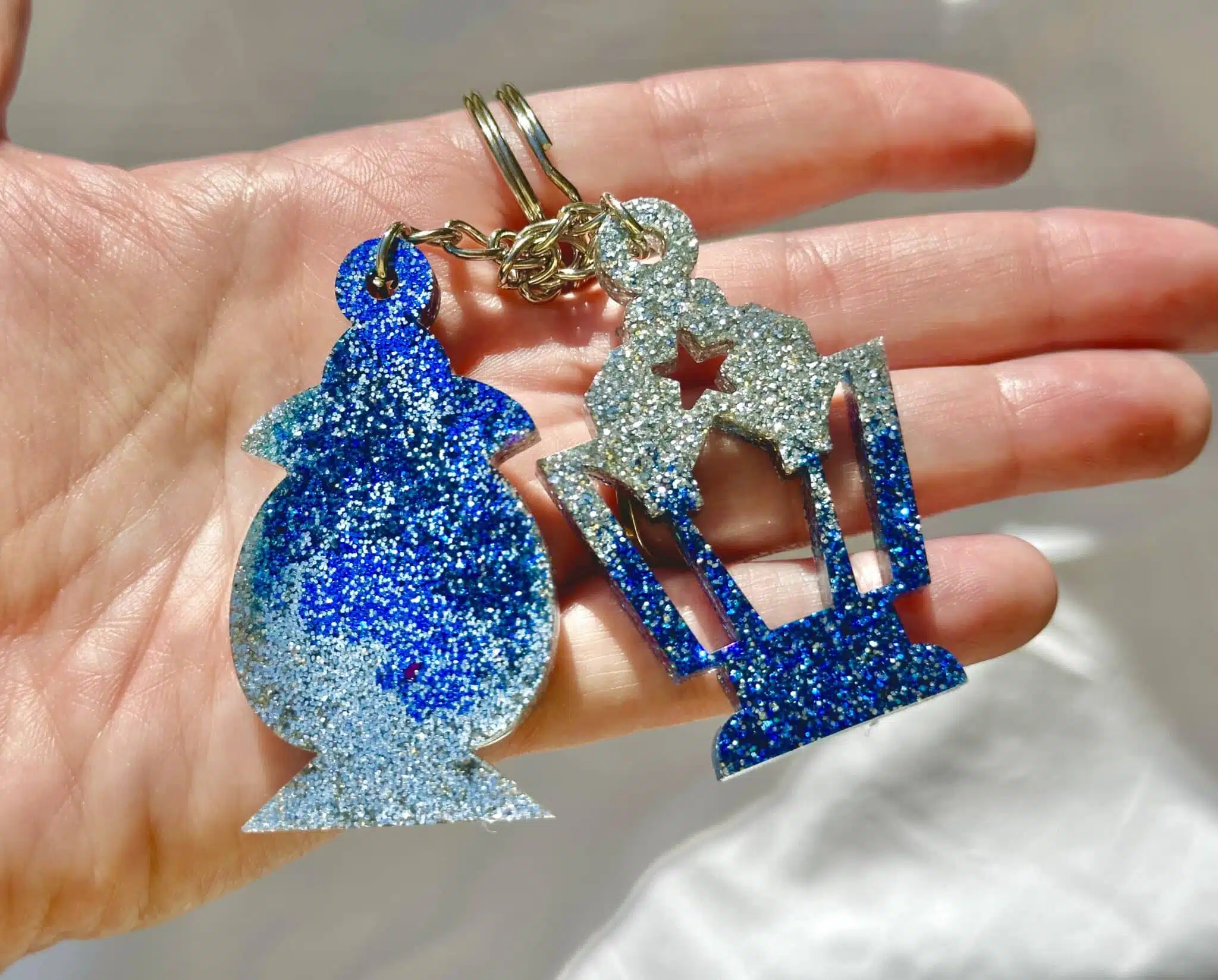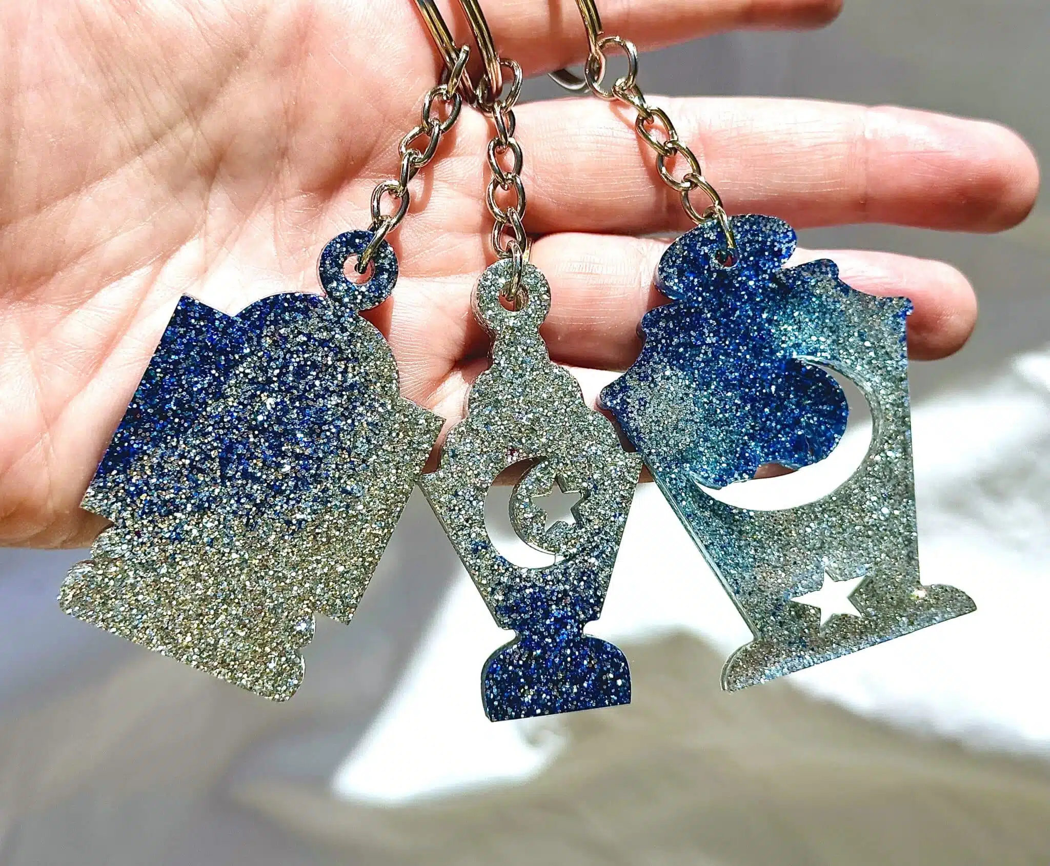 These are lovely Fanous Ramadan key chains in a mix of silver and dark blue glitter. Design is avalable in different shapes that you can choose from.