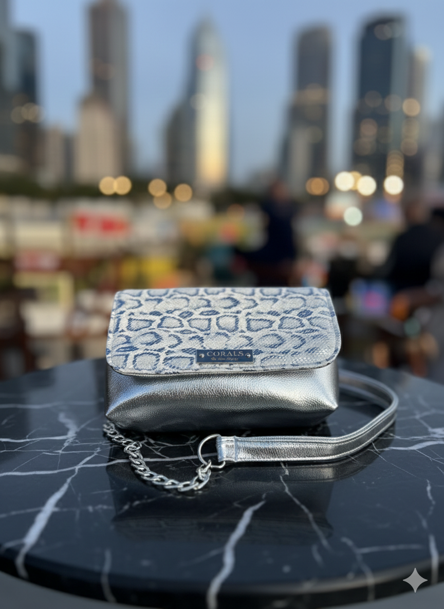 حقيبة كروس بودي مميزة بنقشة جلد ثعبان أزرق وأبيض مع جسم فضي لامع. بفضل حزام السلسلة القابل للفصل، تتحول بسهولة إلى كلاتش أو حقيبة خصر. النقشة اللافتة واللمسة المتألقة تجعلها قطعة متعددة الاستخدامات لأي مناسبة.