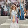 Silver and white pouch made from silver metallic raffia threads and also from white raffia threads in additional to fur threads.