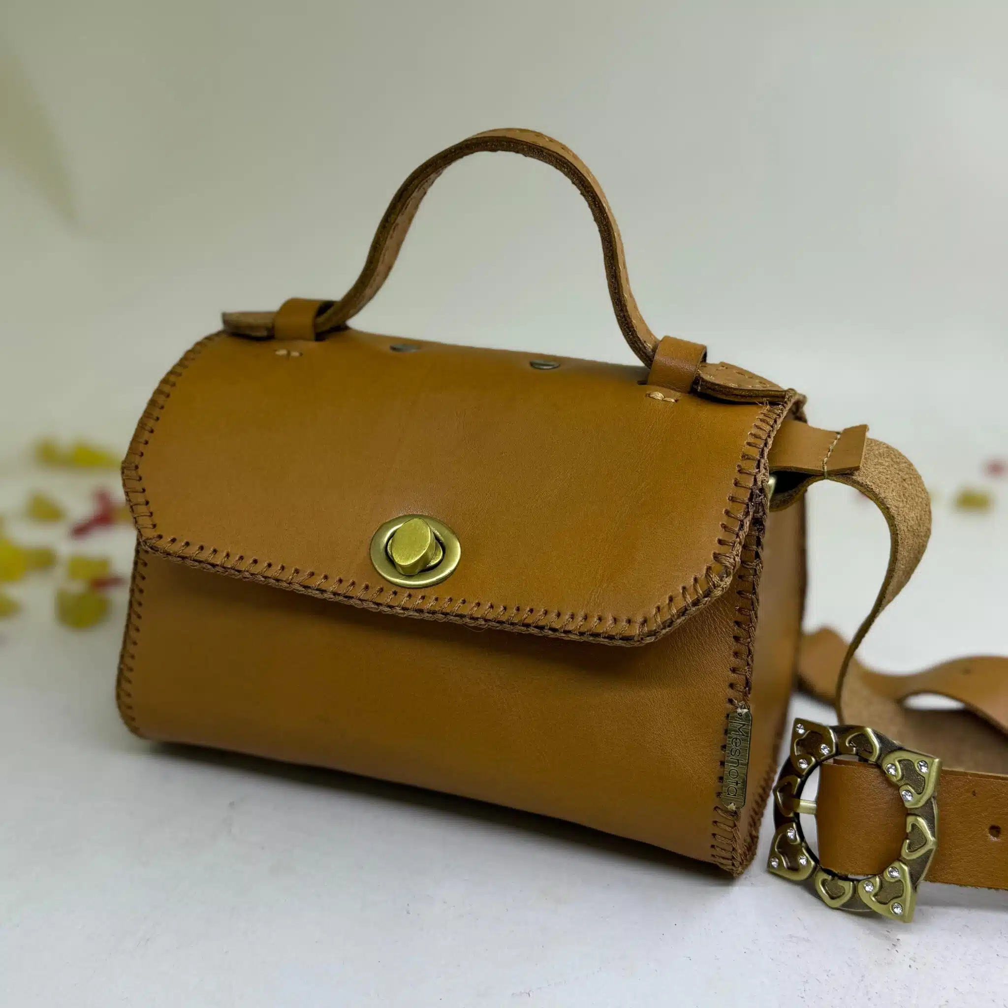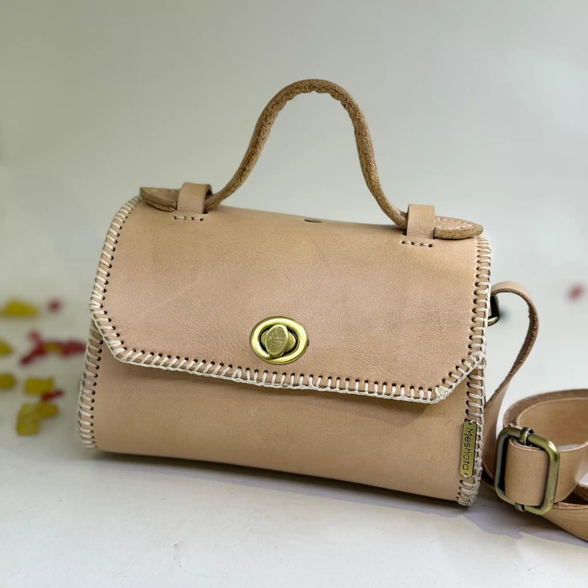 A simple, genuine leather bag with a pyramid-shaped side. Size: 20*12*10 cm. Equipped with a short handle for easy carrying and a crossbody strap.