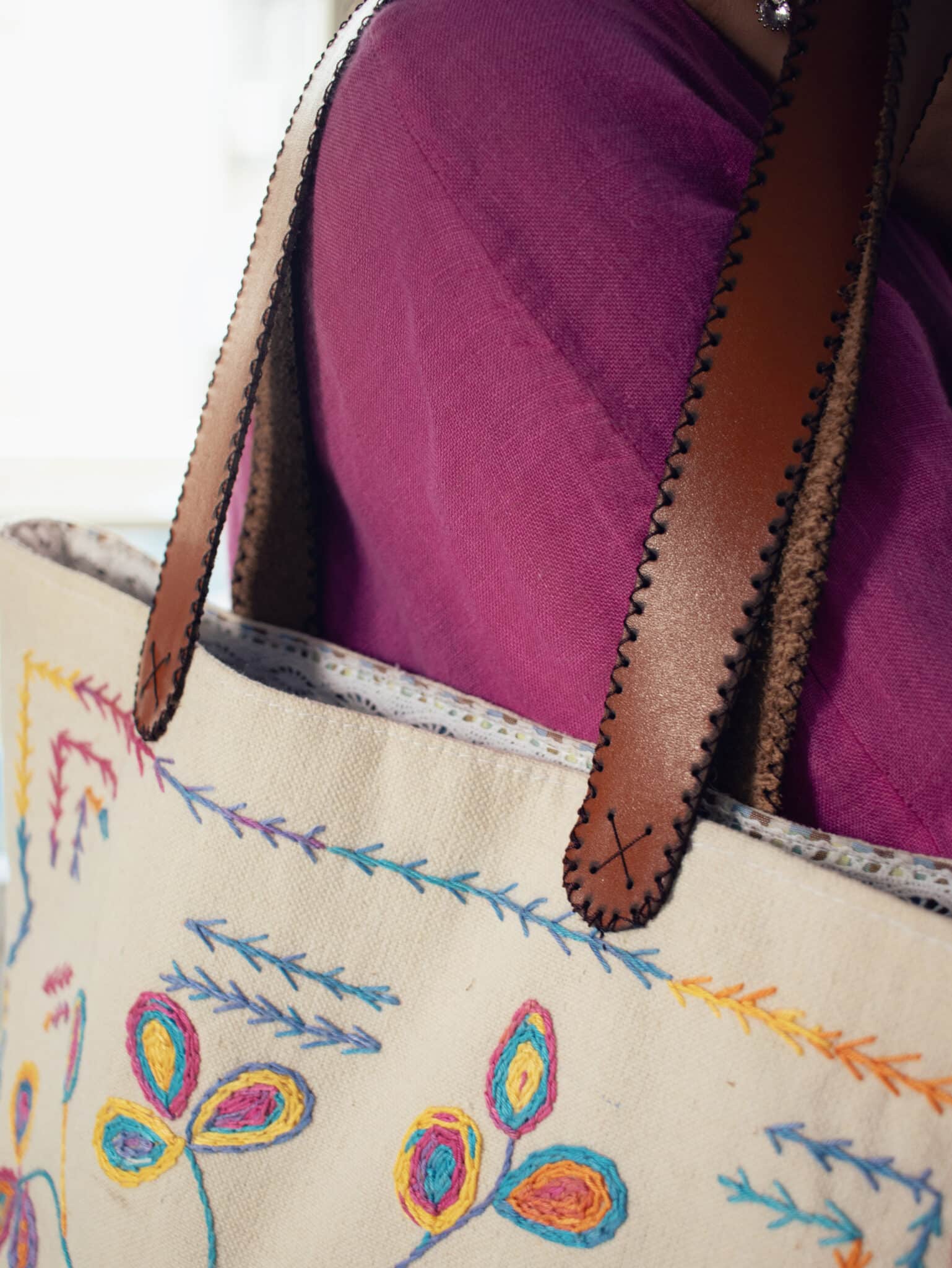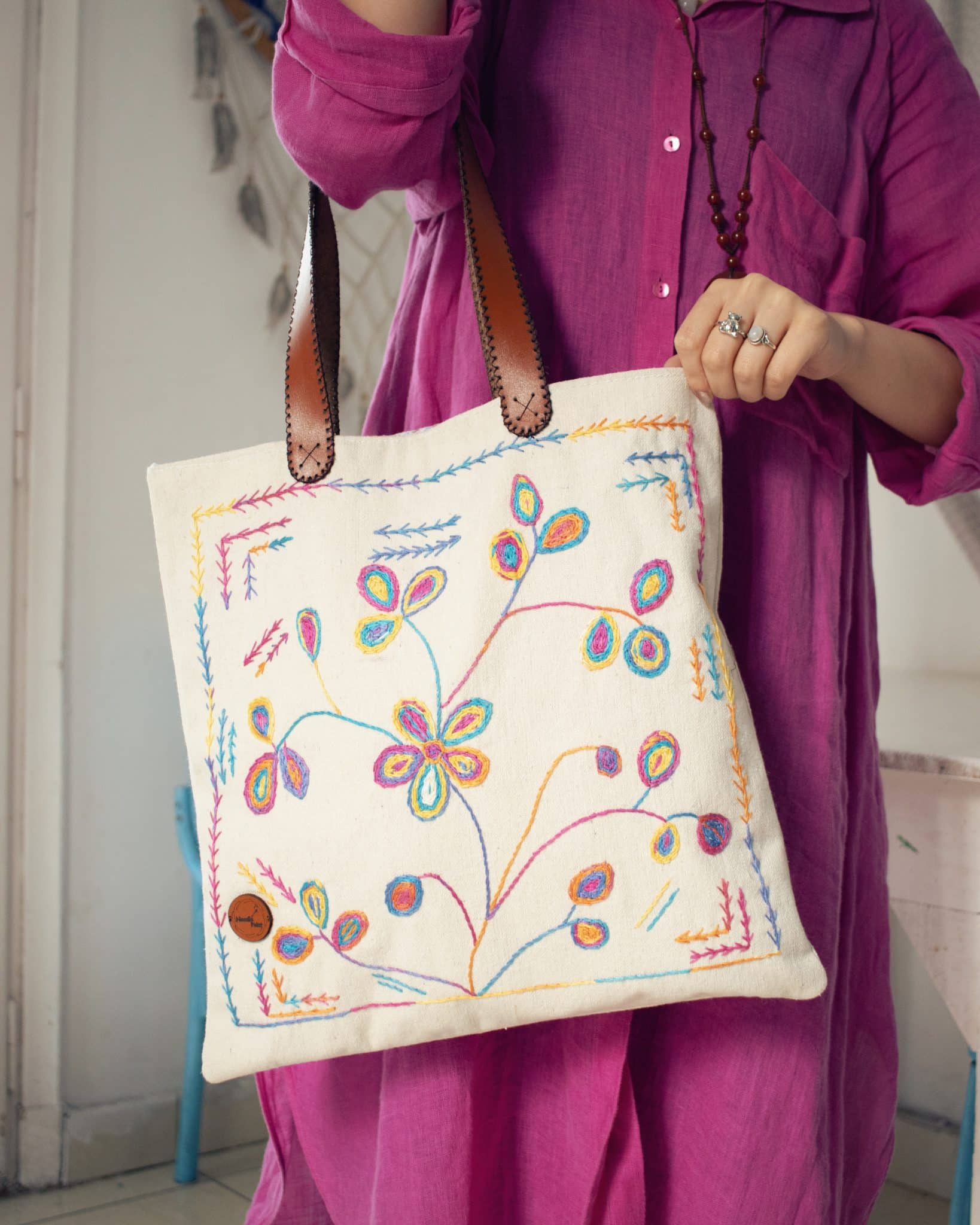 A white linen bag embroidered with colorful threads in beautiful shades.