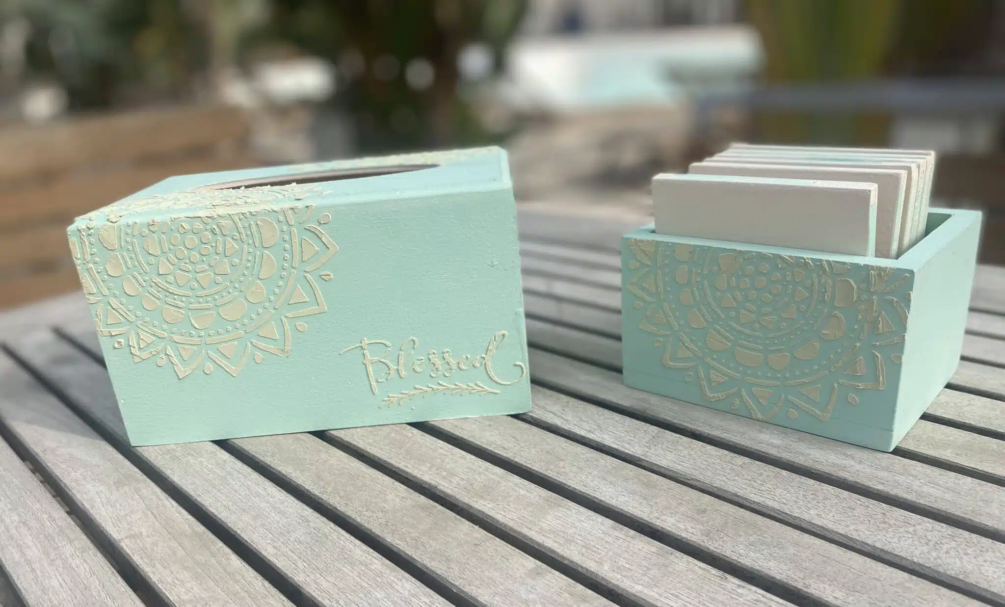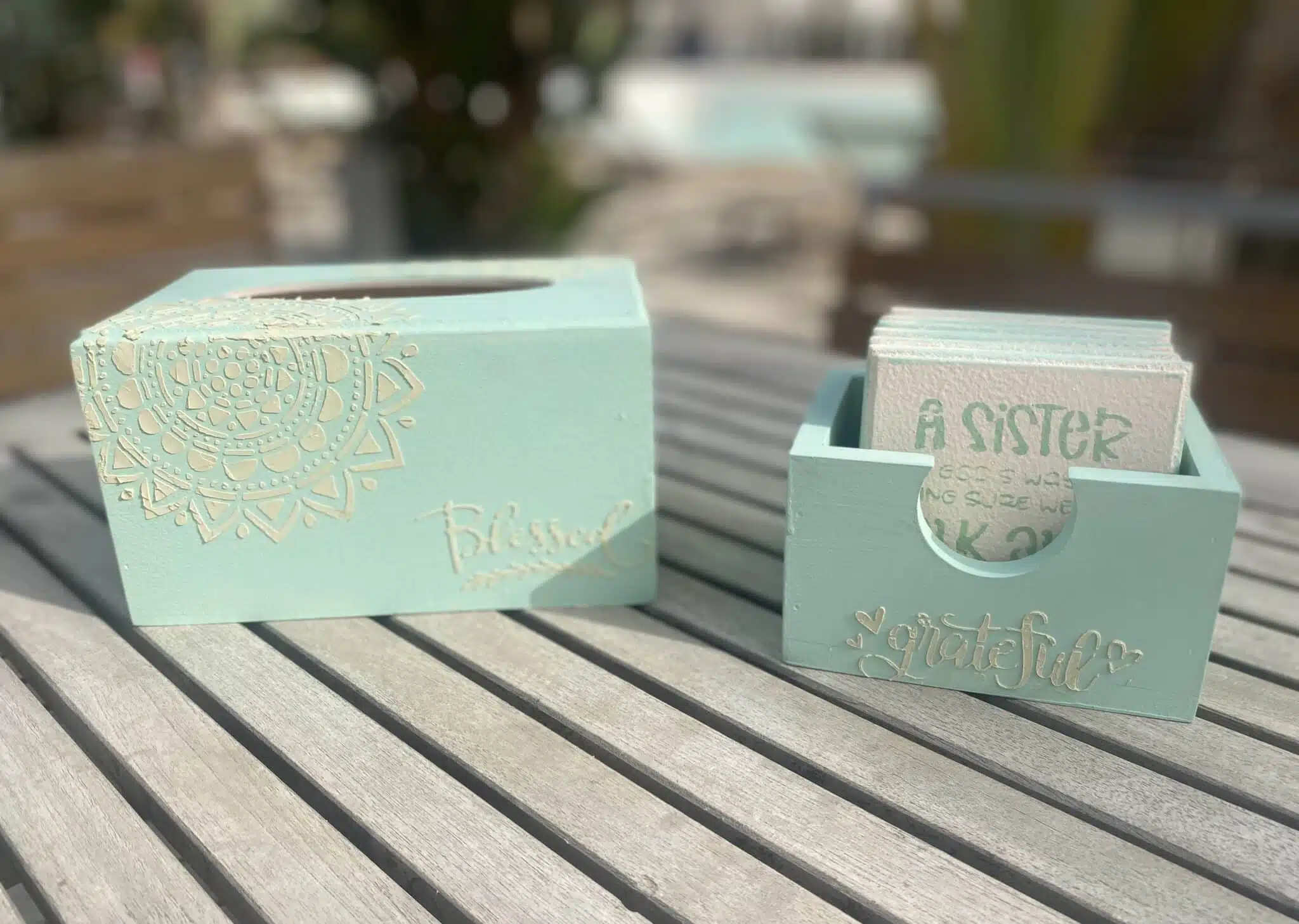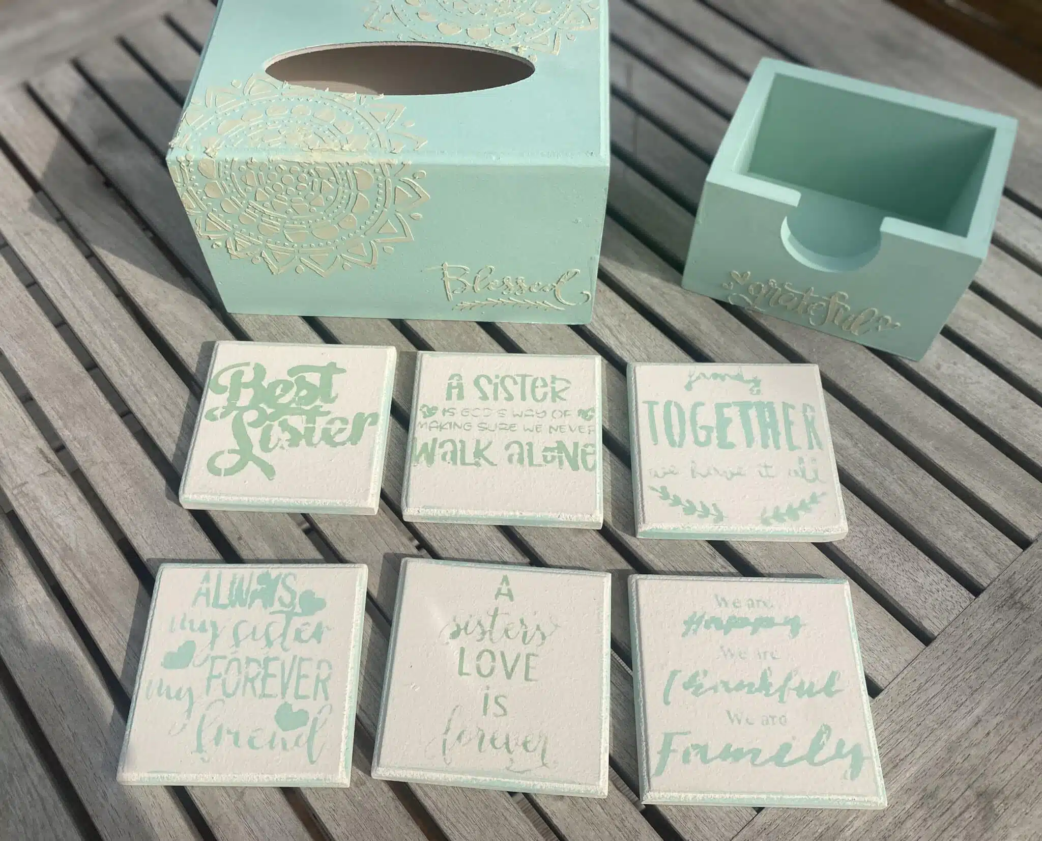 Wooden set tissue box & coasters with sister’s love theme