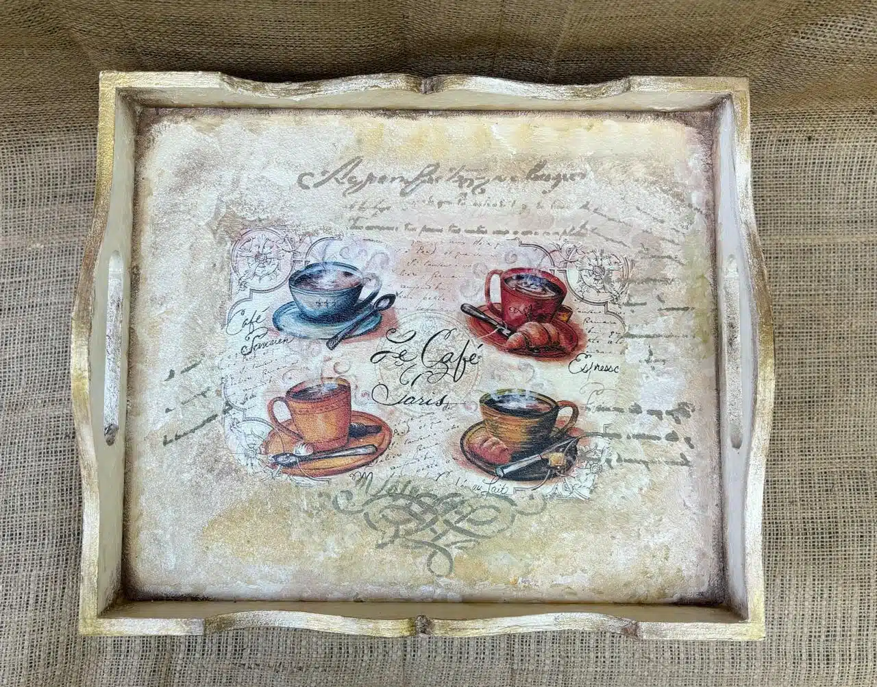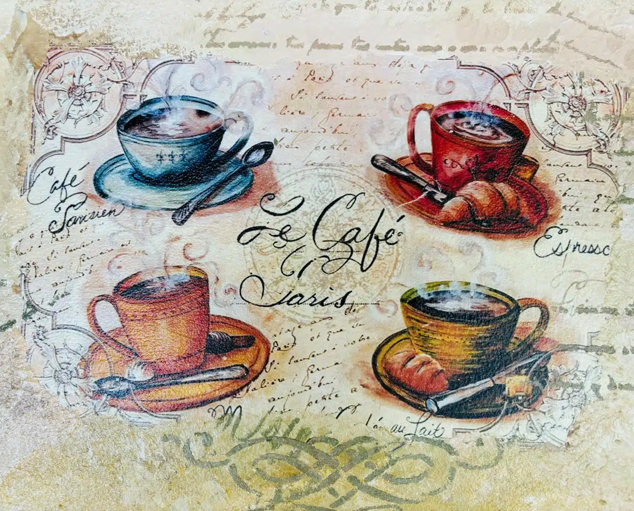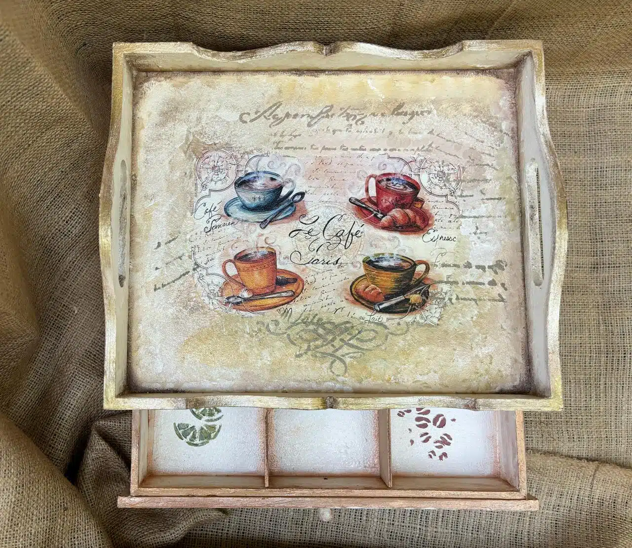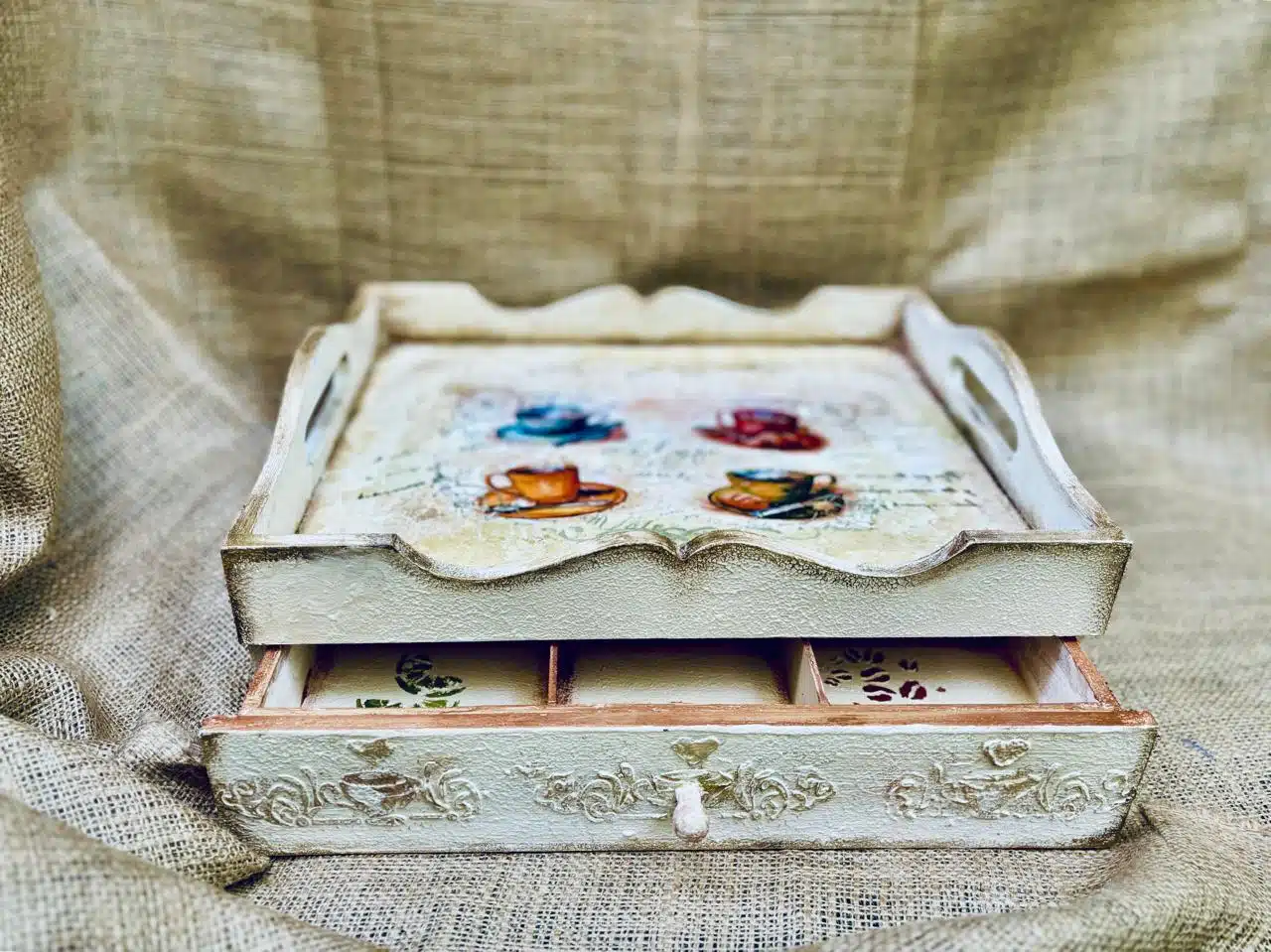 Small coffee corner with drawer divided into 9 square hand painting with chalk paint inside the drawer