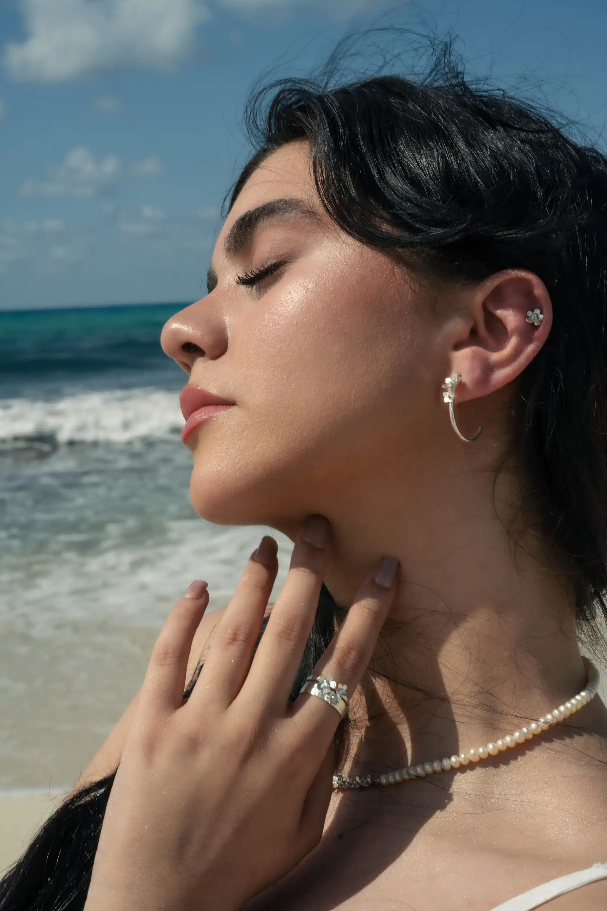 Silver band ring with a luminous texture and a delicate flower detail. Accented with a small flower. Perfect for stacking.