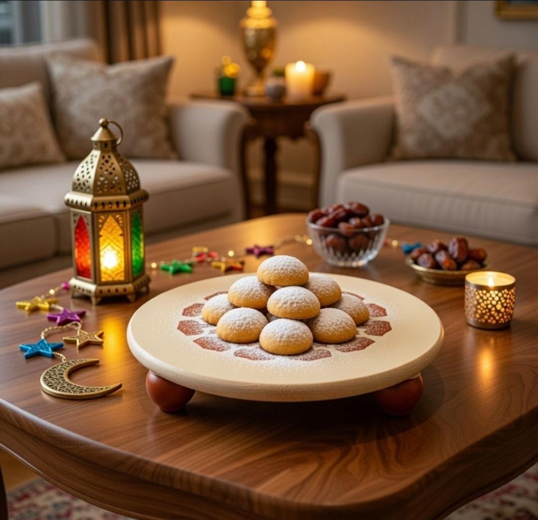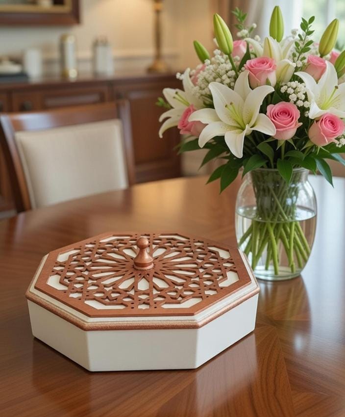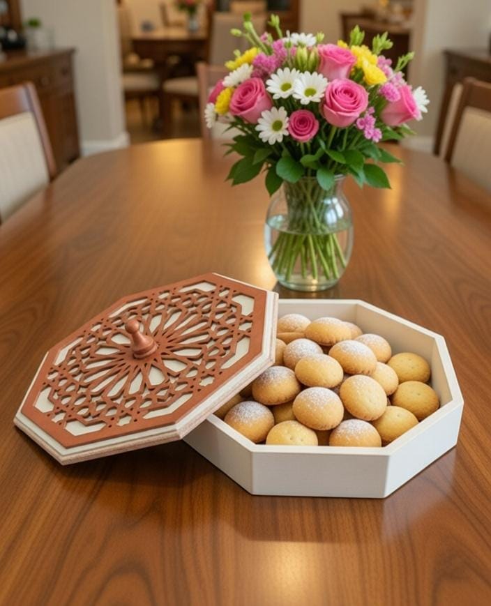 A unique set of a box and a table stand with special Arabic design, ideal to put inside sweets, Kahk, yameesh Ramadan and nuts.