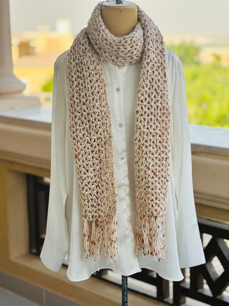 A soft, handmade crochet scarf crafted in a warm neutral shade with delicate speckled yarn. Its textured stitches and flowy fringe add a cozy, elegant touch—perfect for elevating any winter outfit.