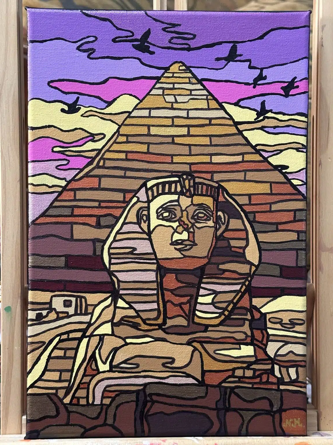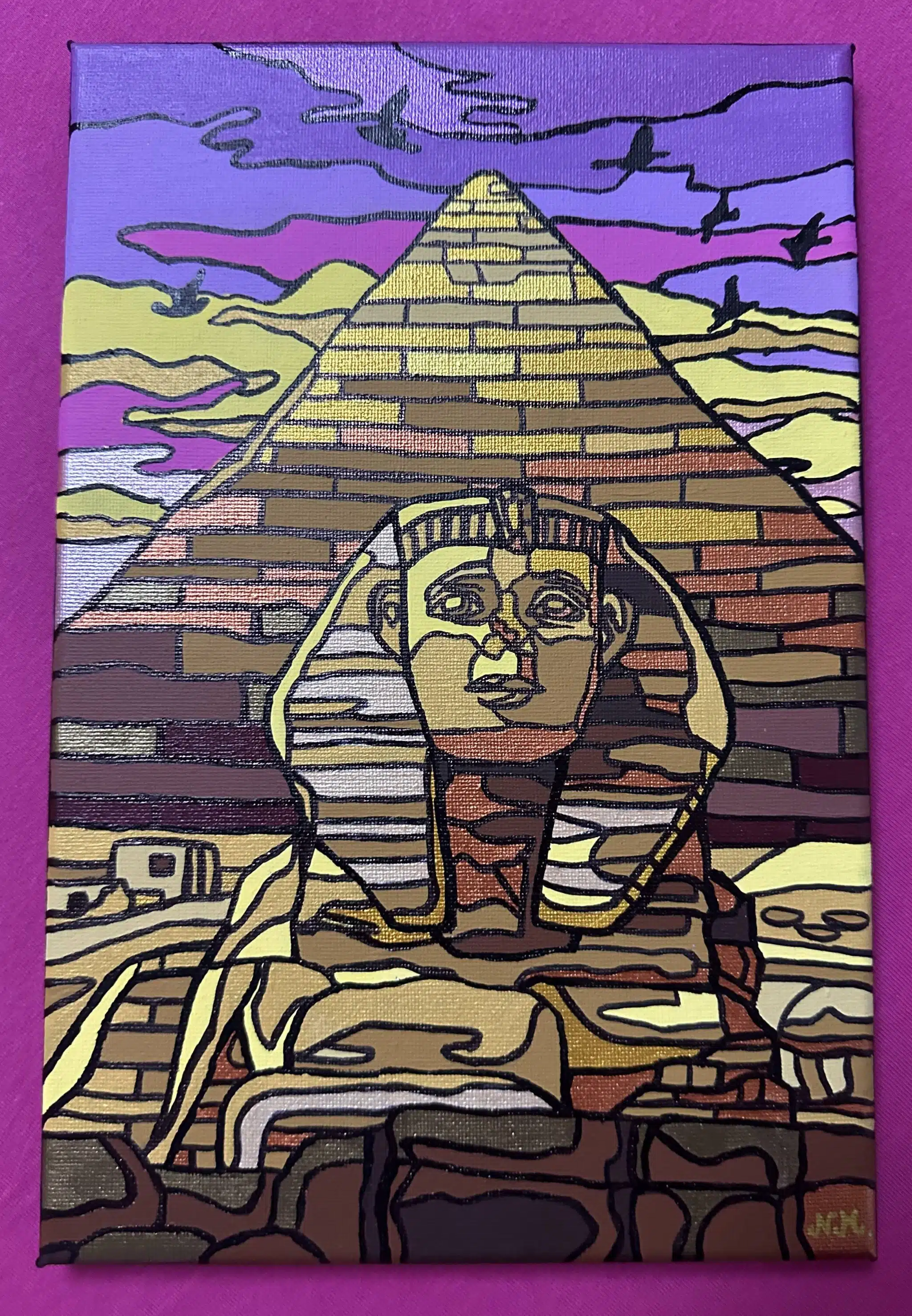 This is a painting in the pop art style of the Sphinx. It is made with acrylic colors. The use of metallic acrylics gives it a unique, elegant touch.