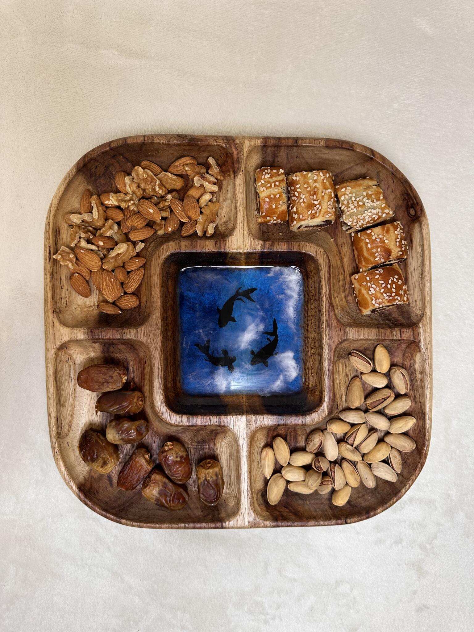 This is a rosewood (خشب سرسوع) snacks’ plate with modern sea and fish resin design in the center. The plate is food safe. Care instructions will be included.