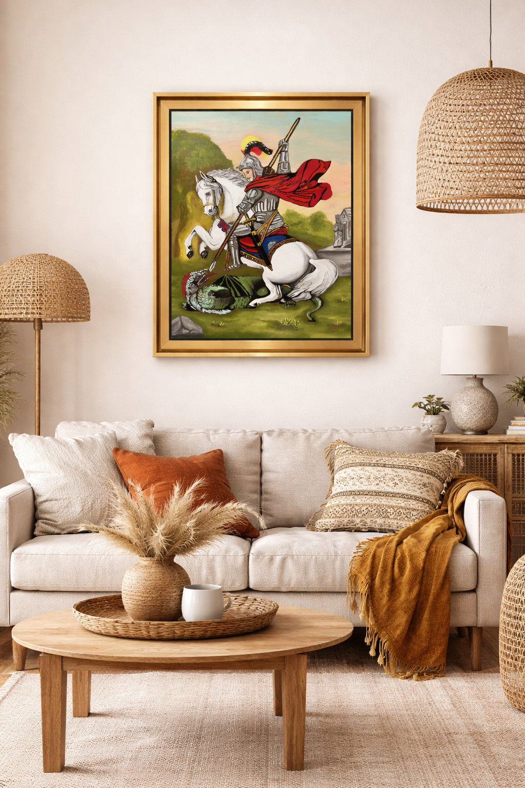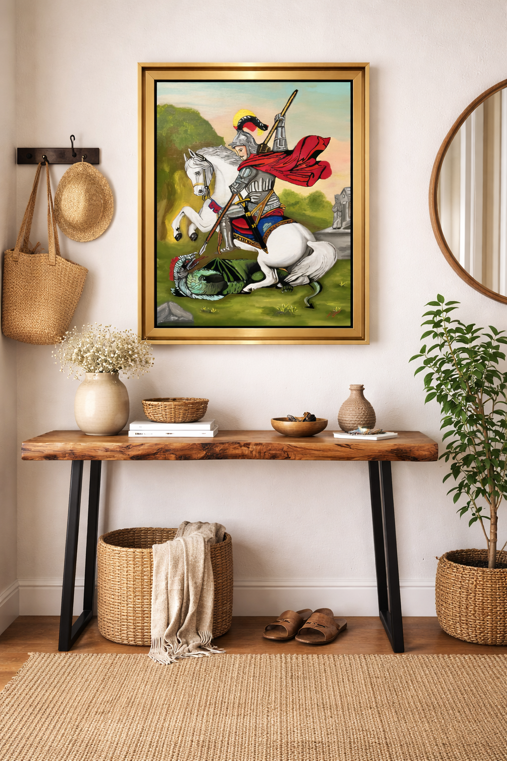 This is an acrylic painting of st. George the roman in his famous heroic scene, defeting the dragon. The painting style is called pop/wpap art. It is a unique and artistic style for your home. It takes long hours to create this portrait.