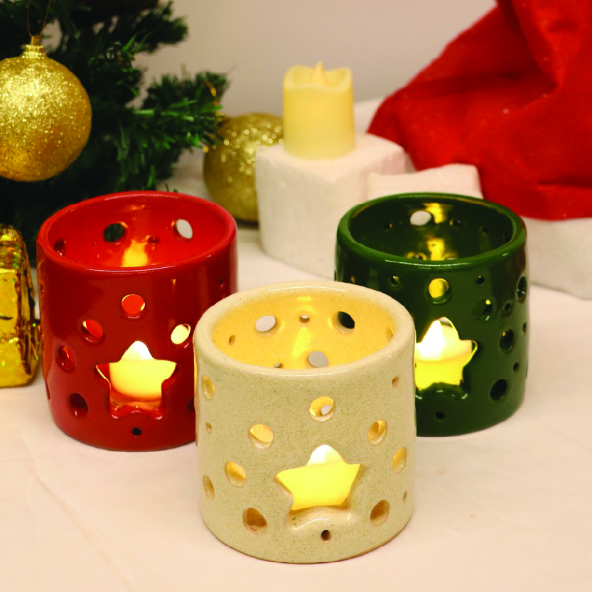 A circular candle holder featuring a charming star cut-out, creating a warm, twinkling glow. Perfect for cozy and festive décor. Available in Dark Green, Red, and Off-White.