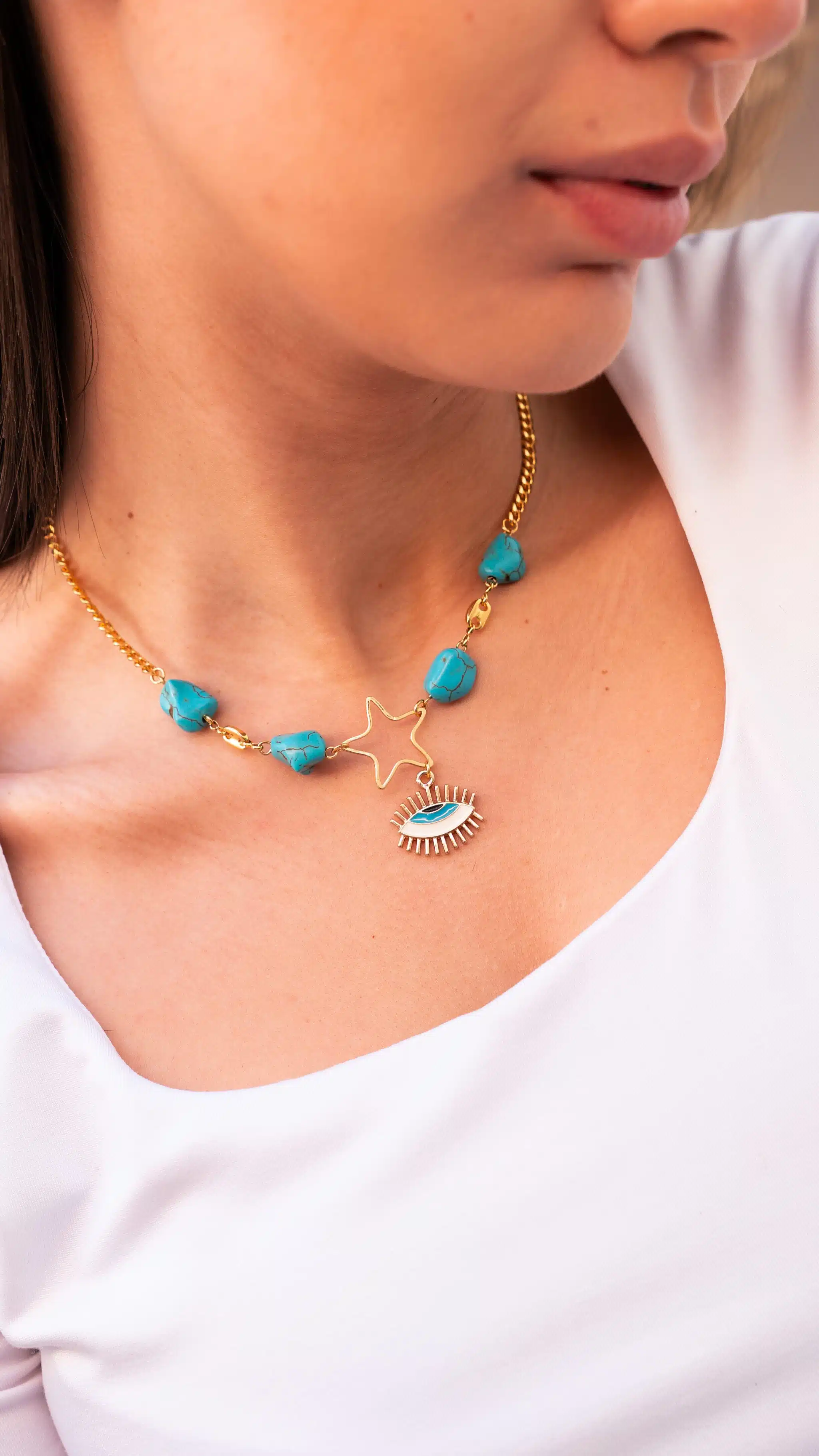 يتميز العقد بدلاية عين زرقاء ترمز إلى الحمايه وأخرى على شكل نجمة ذهبية لامعة متداخلة مع الخرز الفيروزى وسلسلة ذهبية لامعة