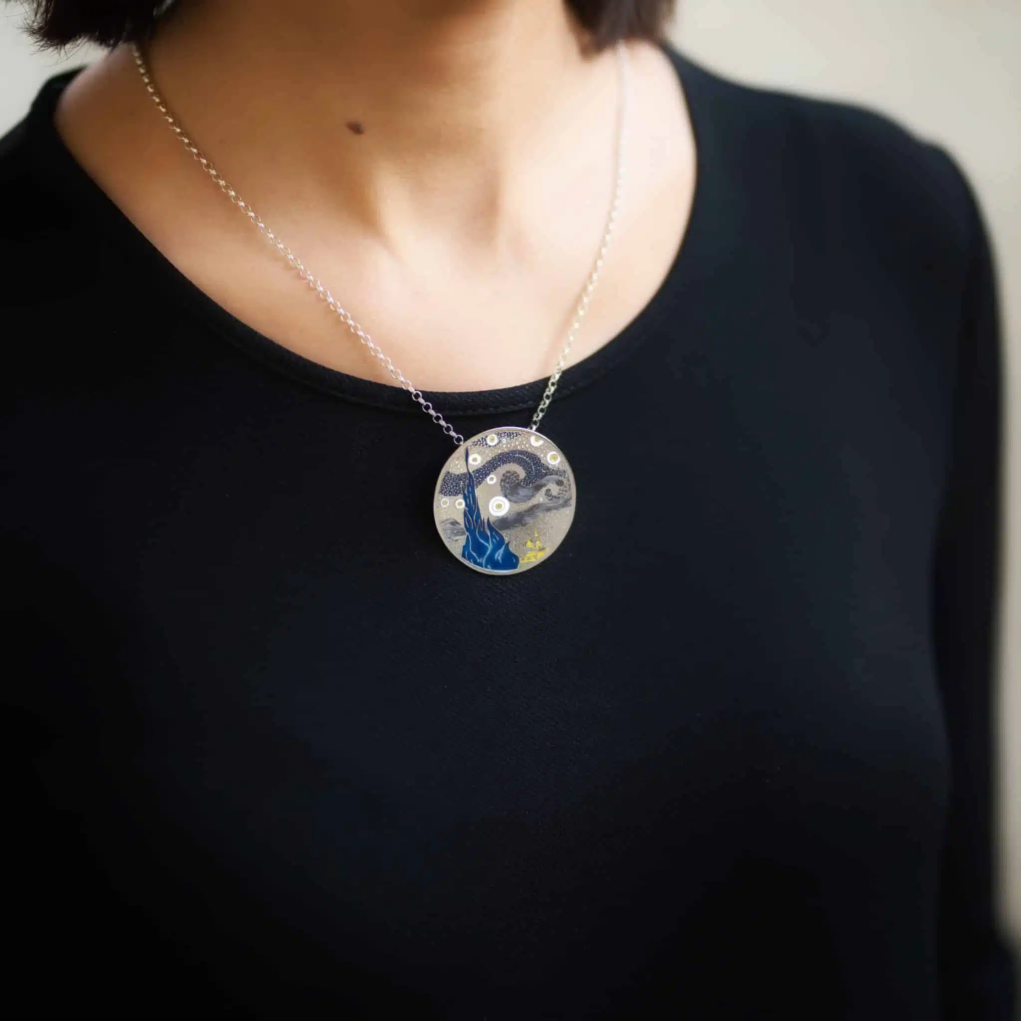 Hand painted Sterling silver Starry Night necklace 4 cm in diameter inspired by Vincent Van Gough.