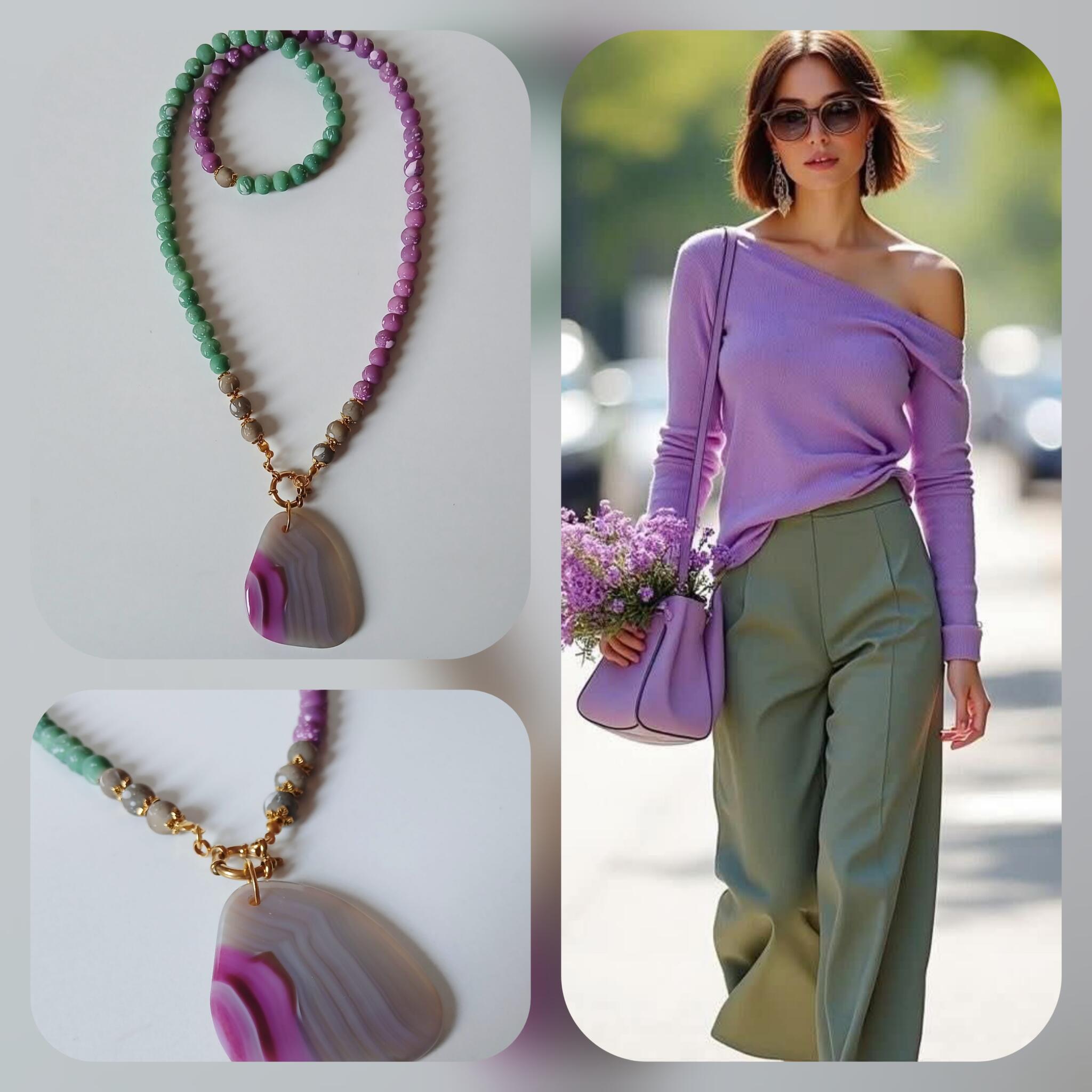 Statement necklace made from jasper beads in violet and jade and beige colours with a big gemstone in mixed colour of violet and beige.
