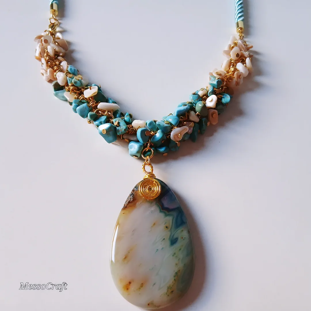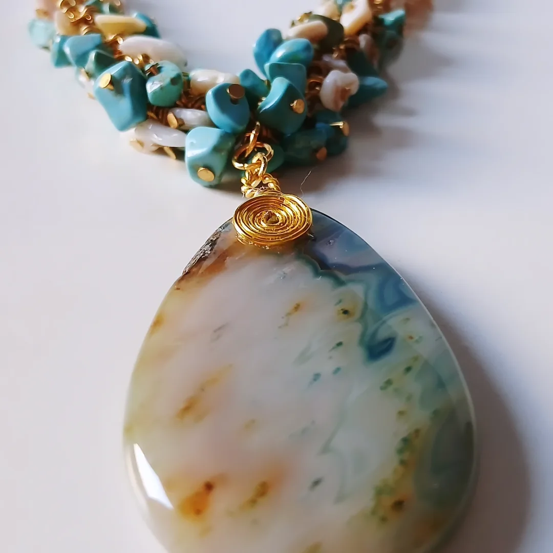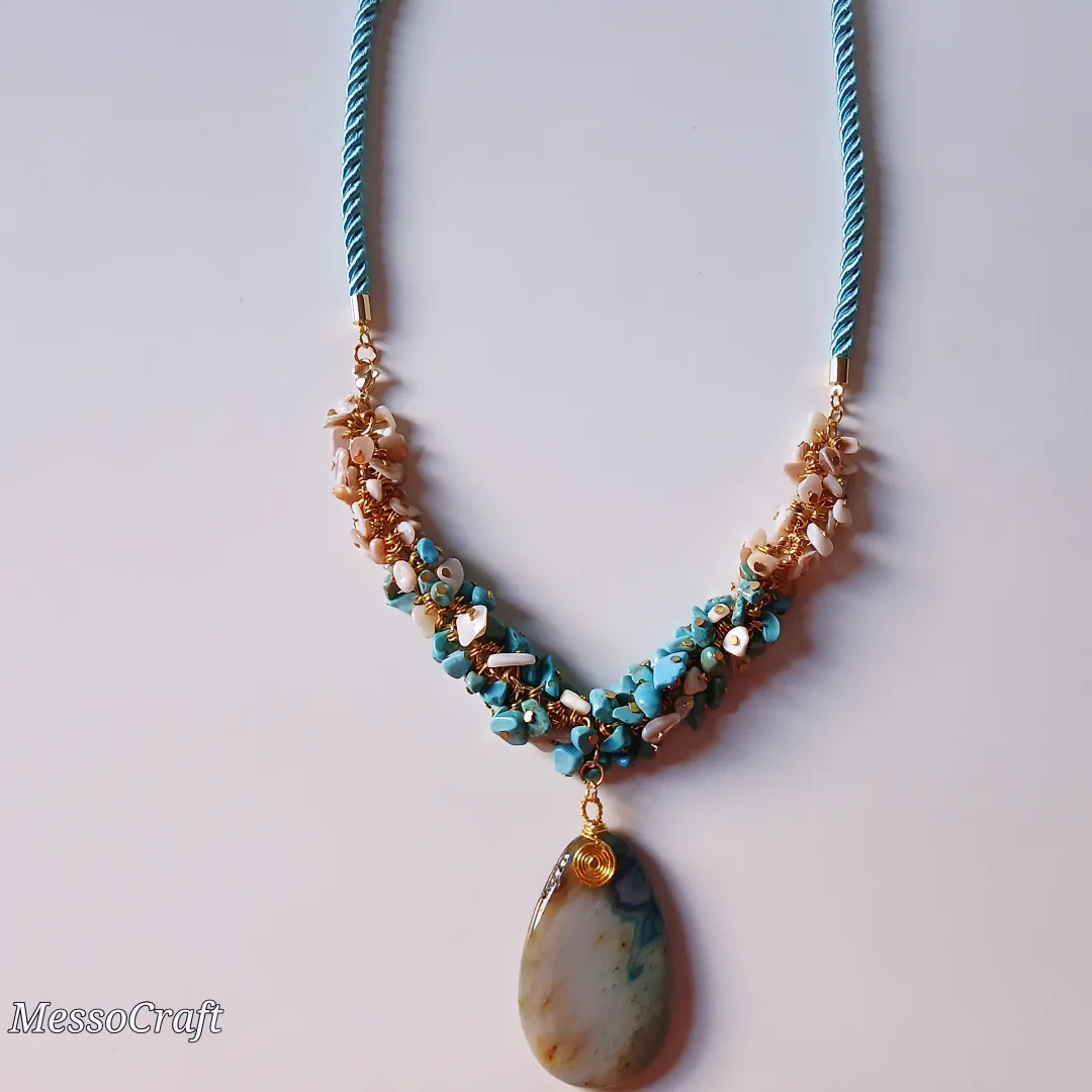 Statement necklace made of blue fayrouz and beige beads stone, big gemstone and blue cordon