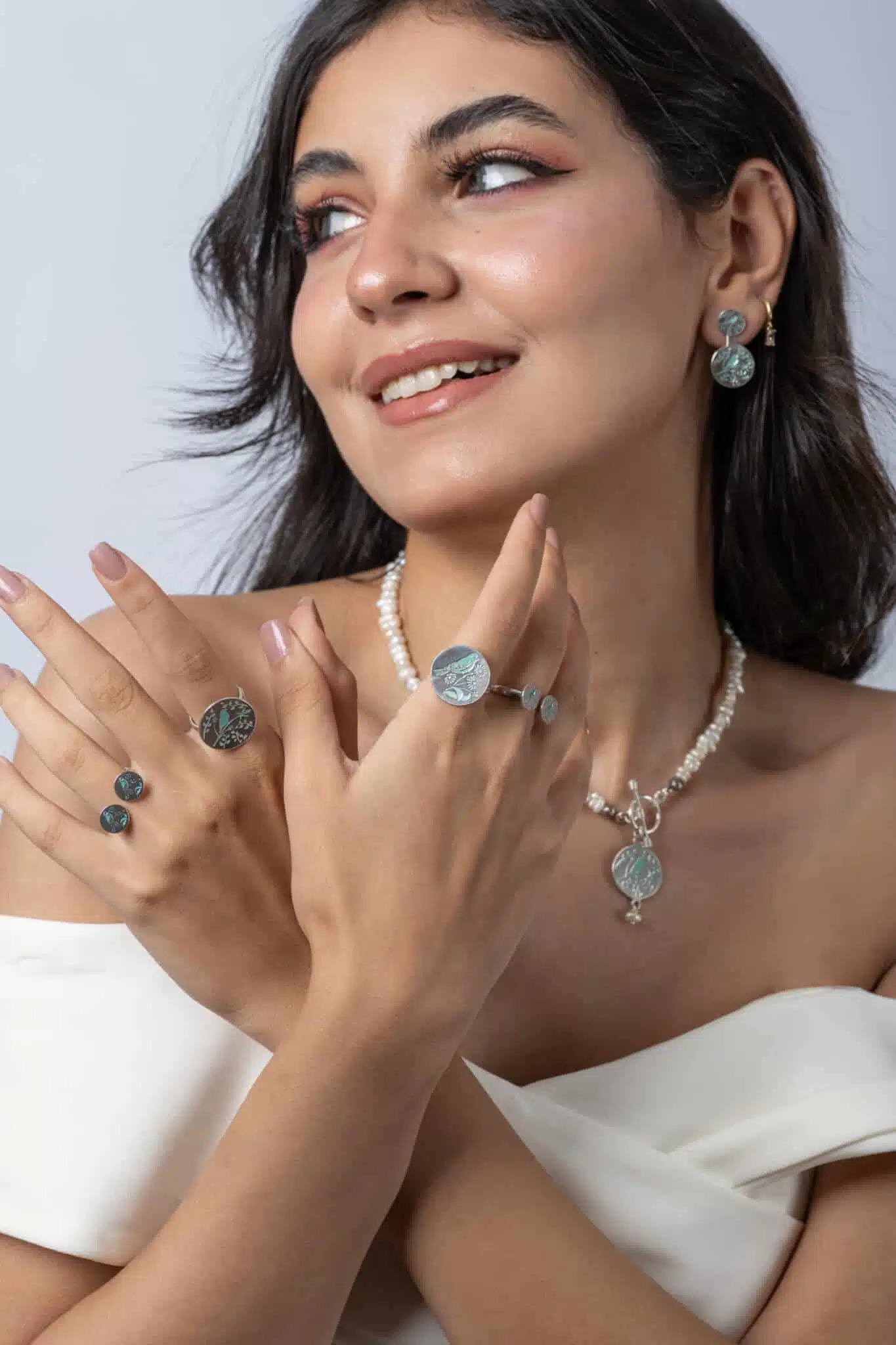 Sterling Silver Double Sided hand painted pendant with natural pearls Necklace. One side with a beautiful geometric pattern and the other side a cute bird.