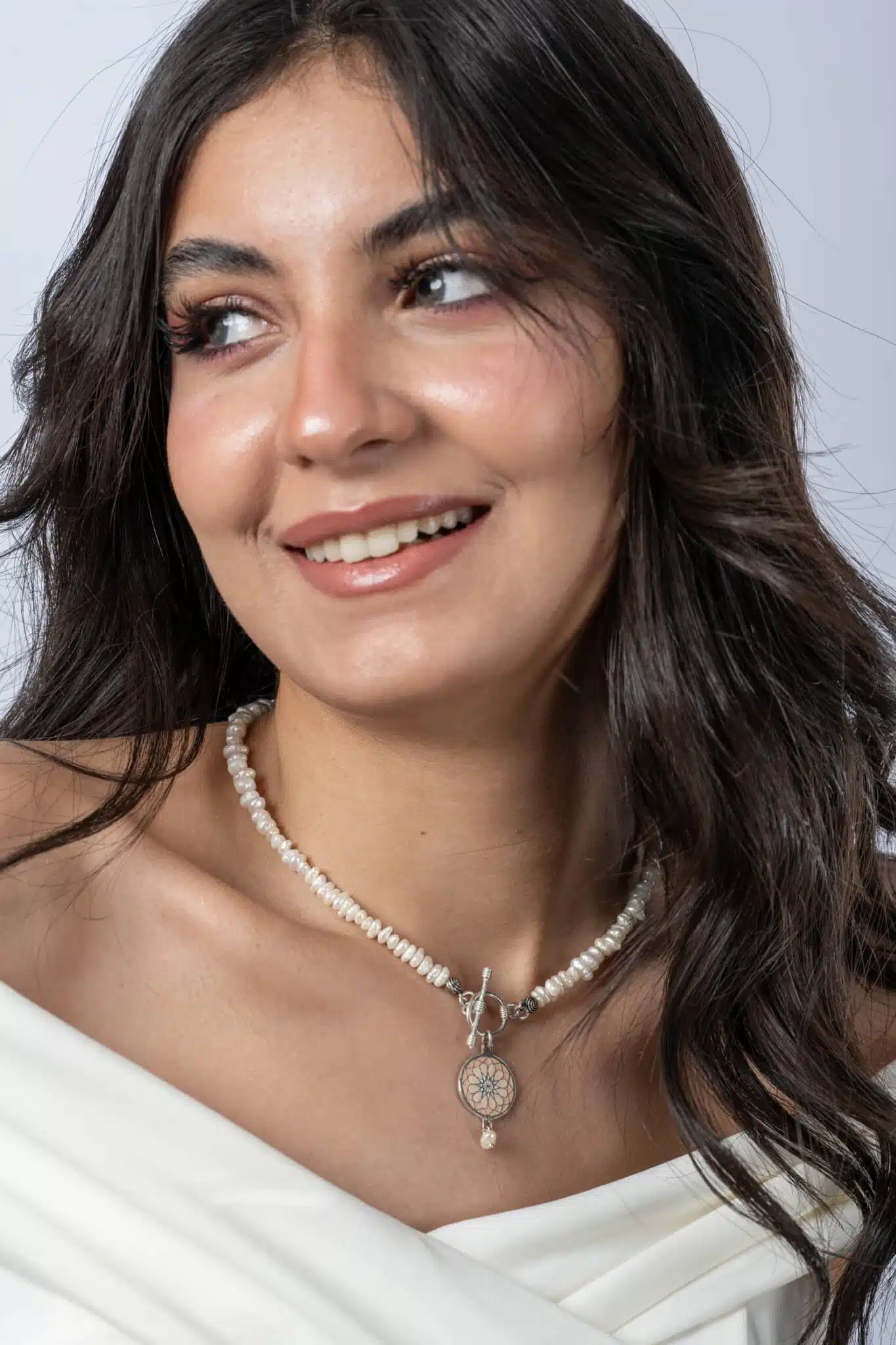 Sterling Silver Double Sided Pendant with Pearls Necklace.