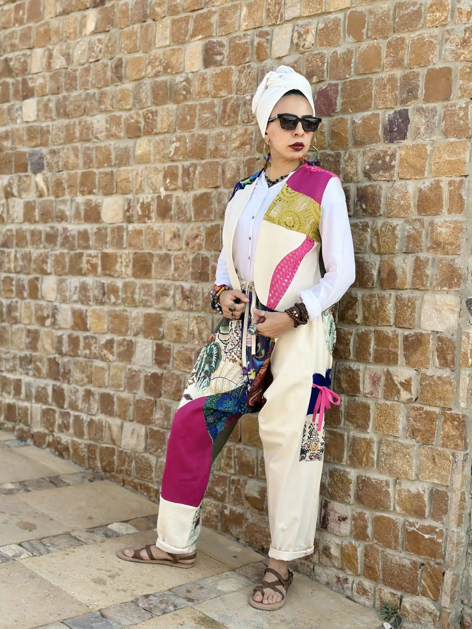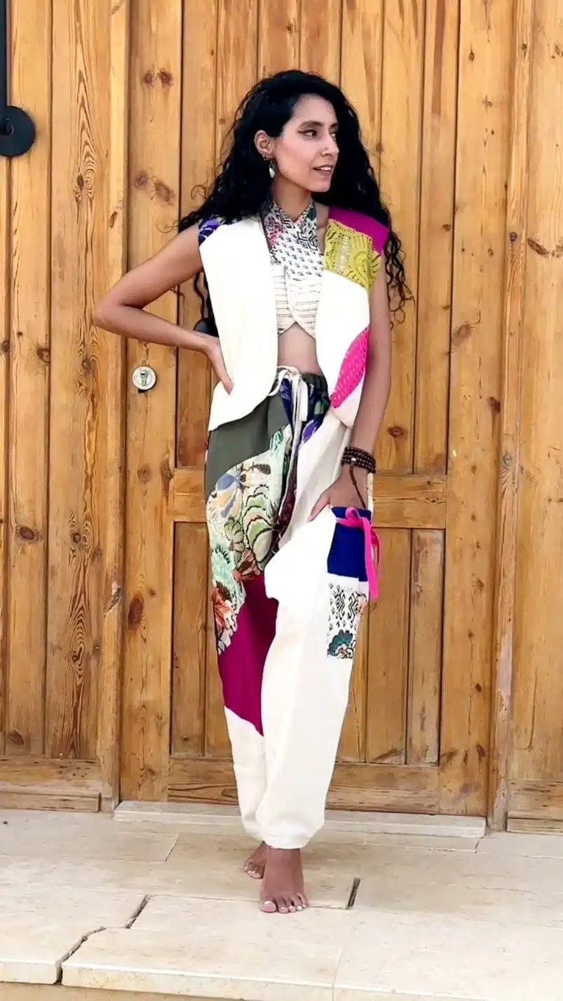Composed of patches of different patterns for a gypsy look.