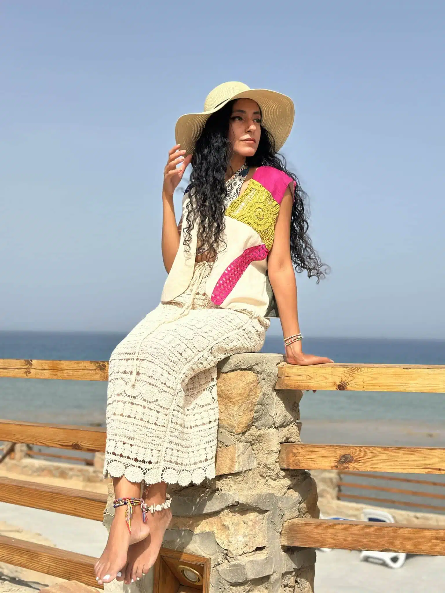 Patchwork handmade vest, created from different fabrics, Pure linen – crochet – indian chiffon – voile – crepe