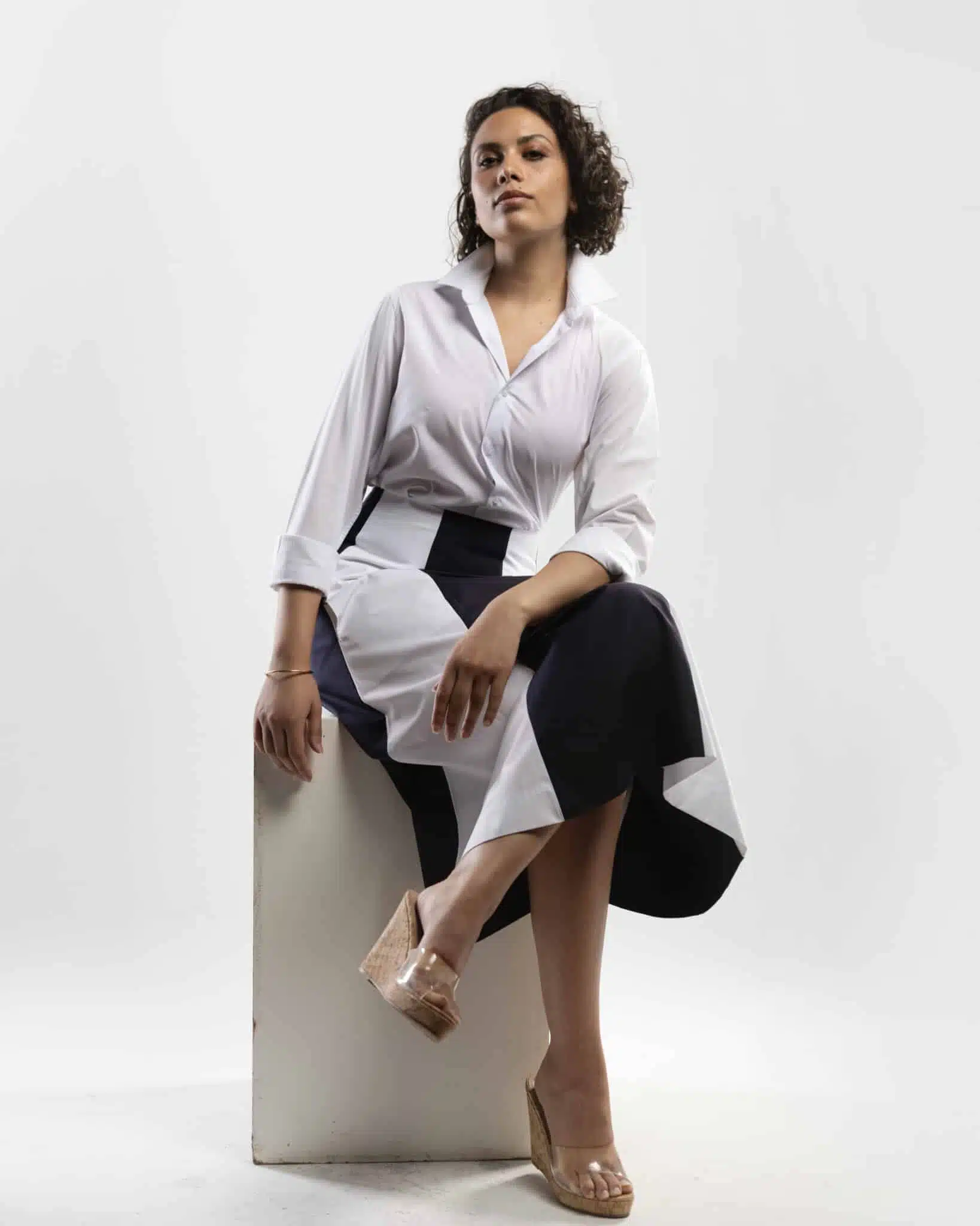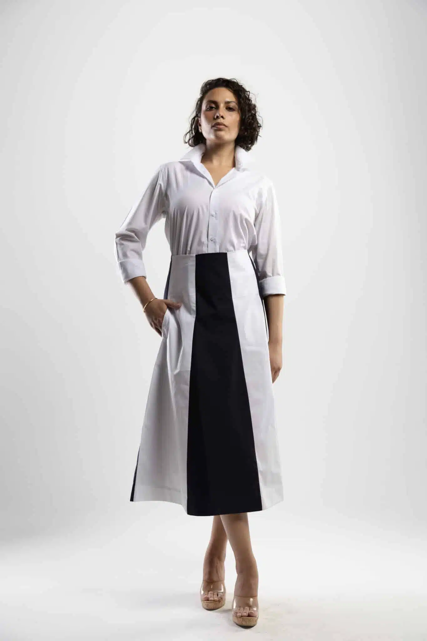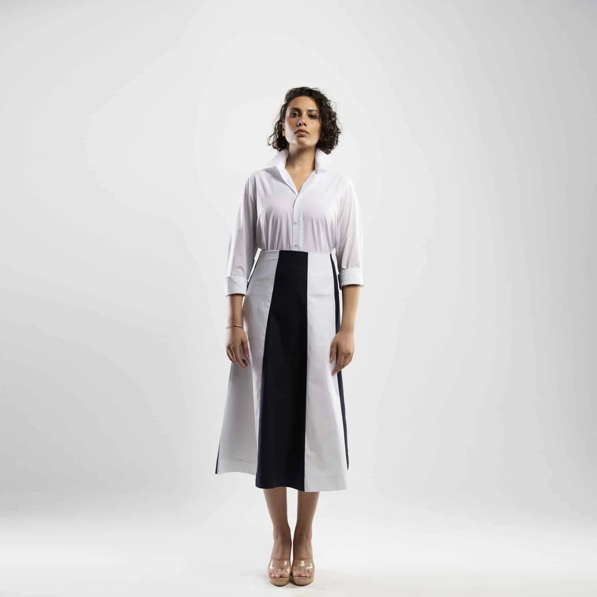 The navy blue and white striped poplin skirt effortlessly transitions from the office to an evening out, offering versatile elegance with every styling.