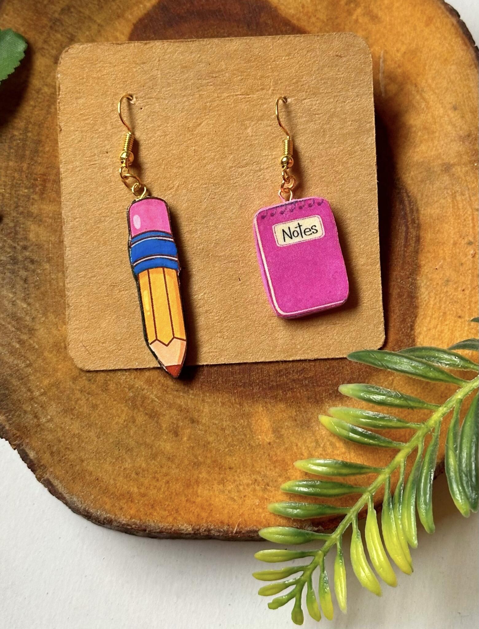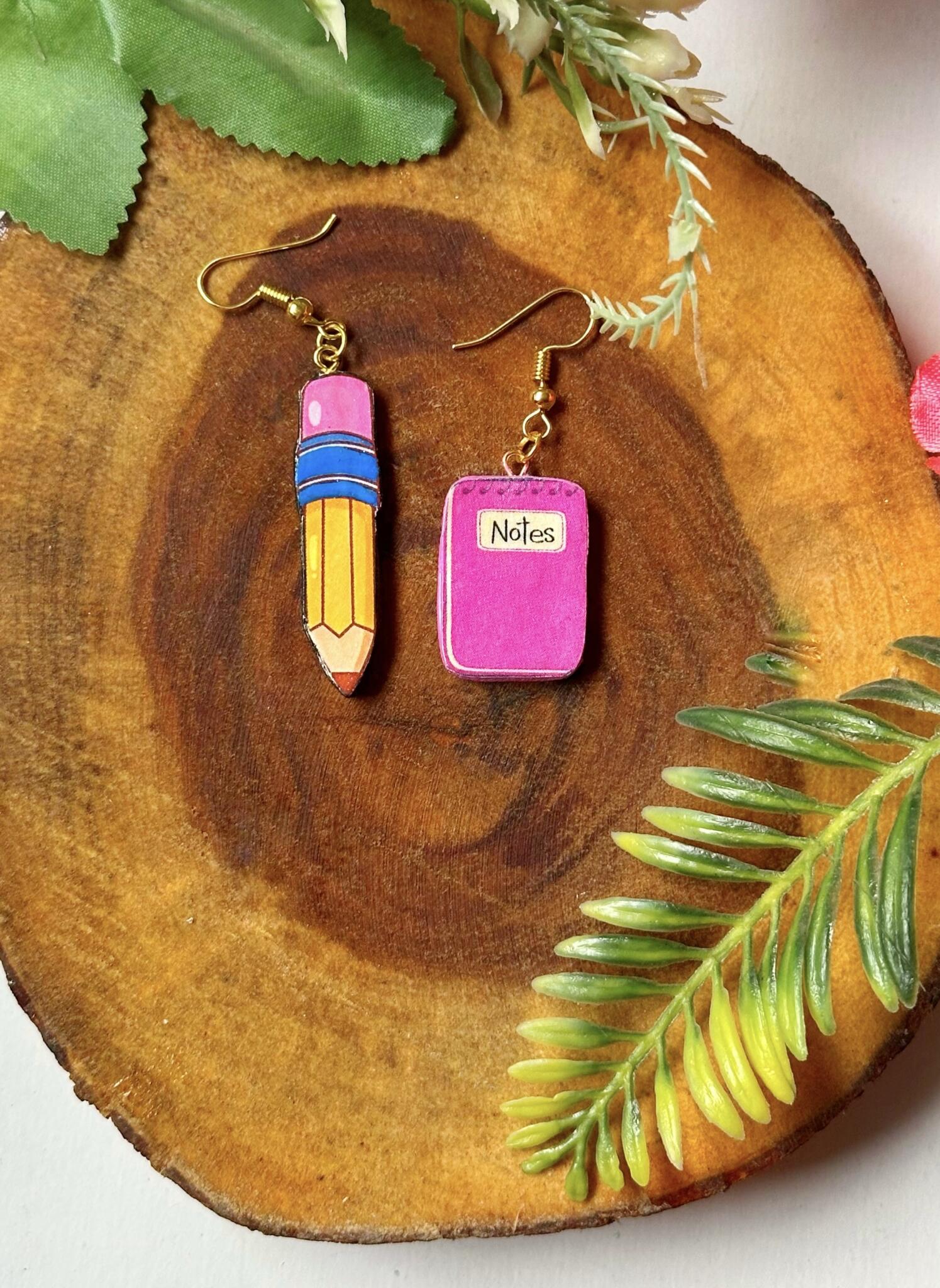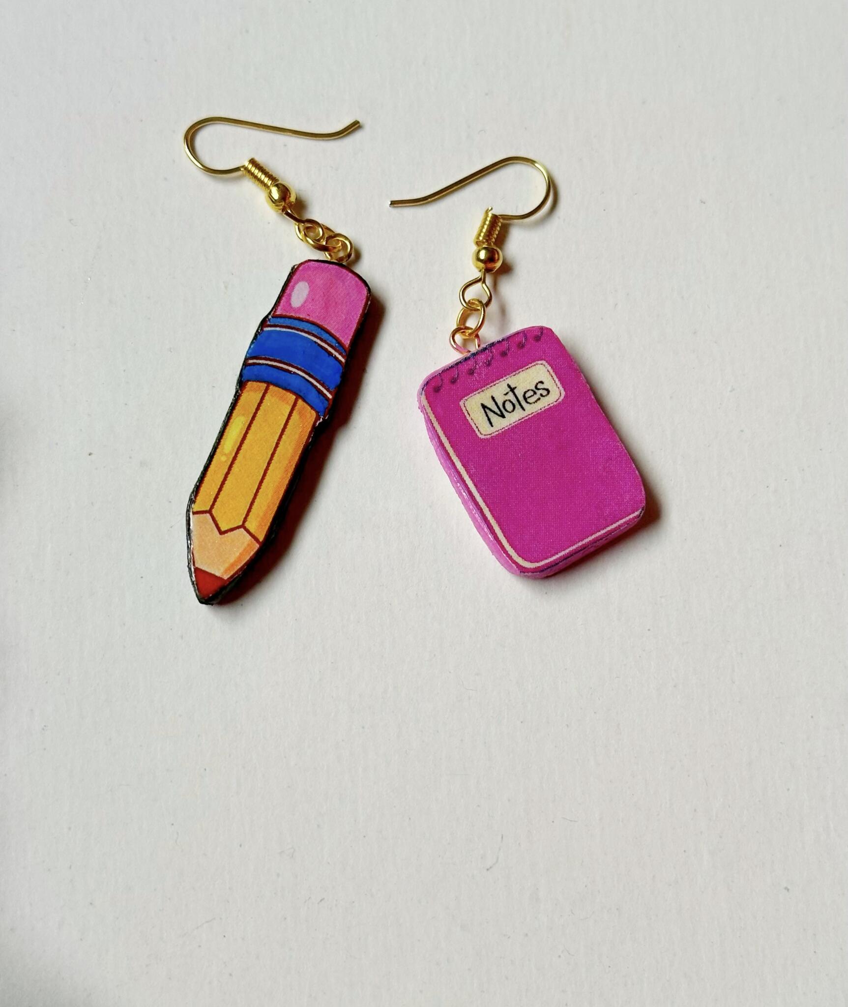 Handmade earrings with a pencil and notebook, for those who love learning with a touch of fashion.