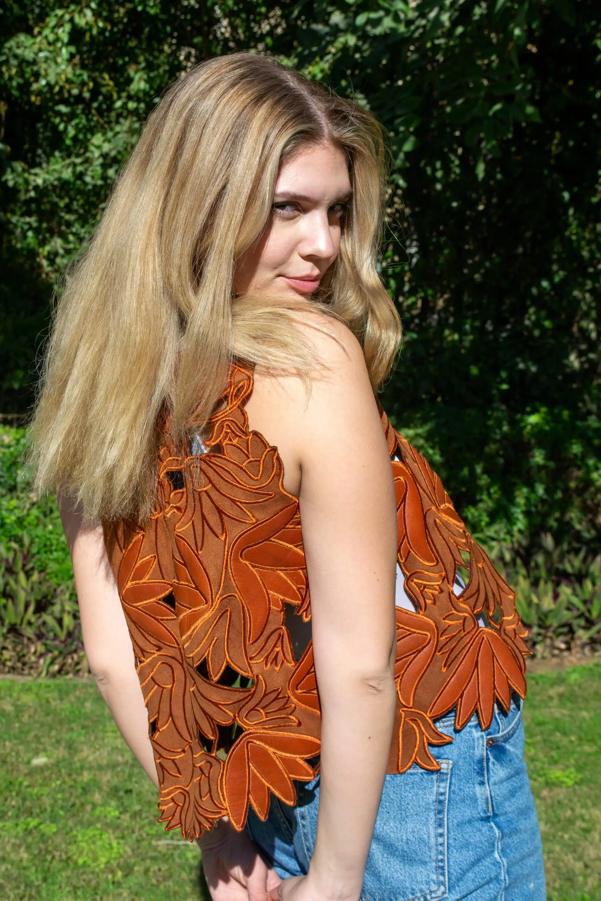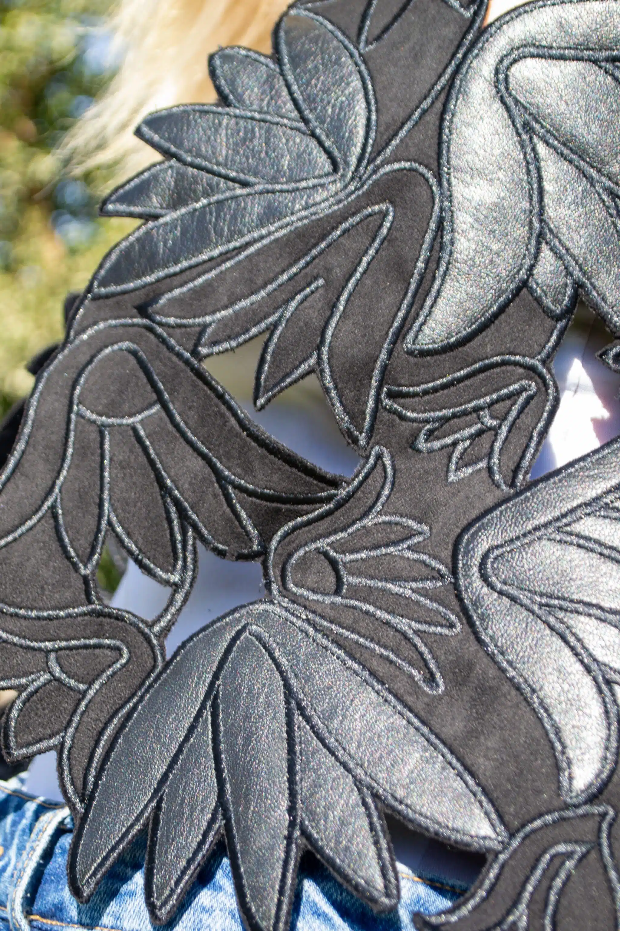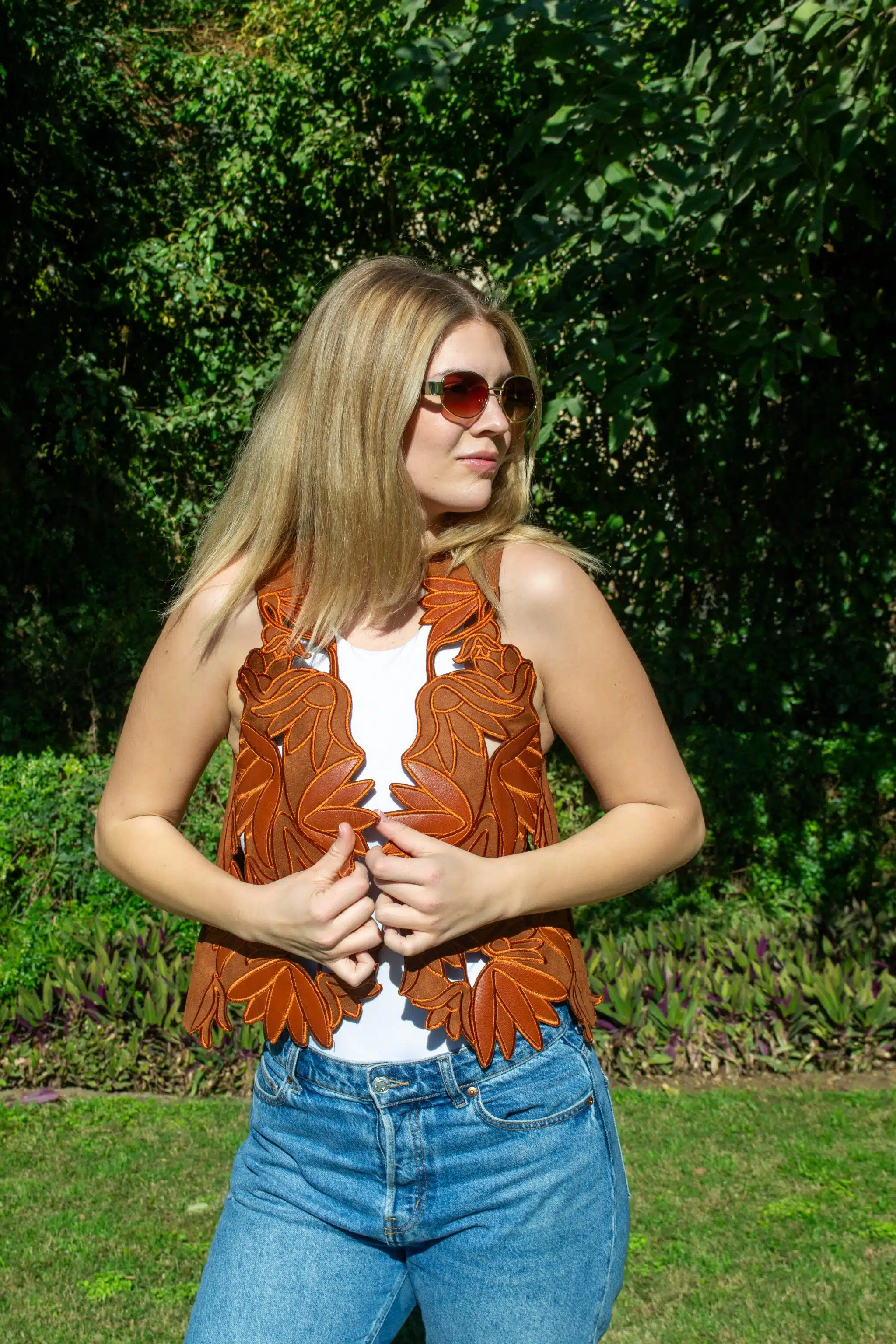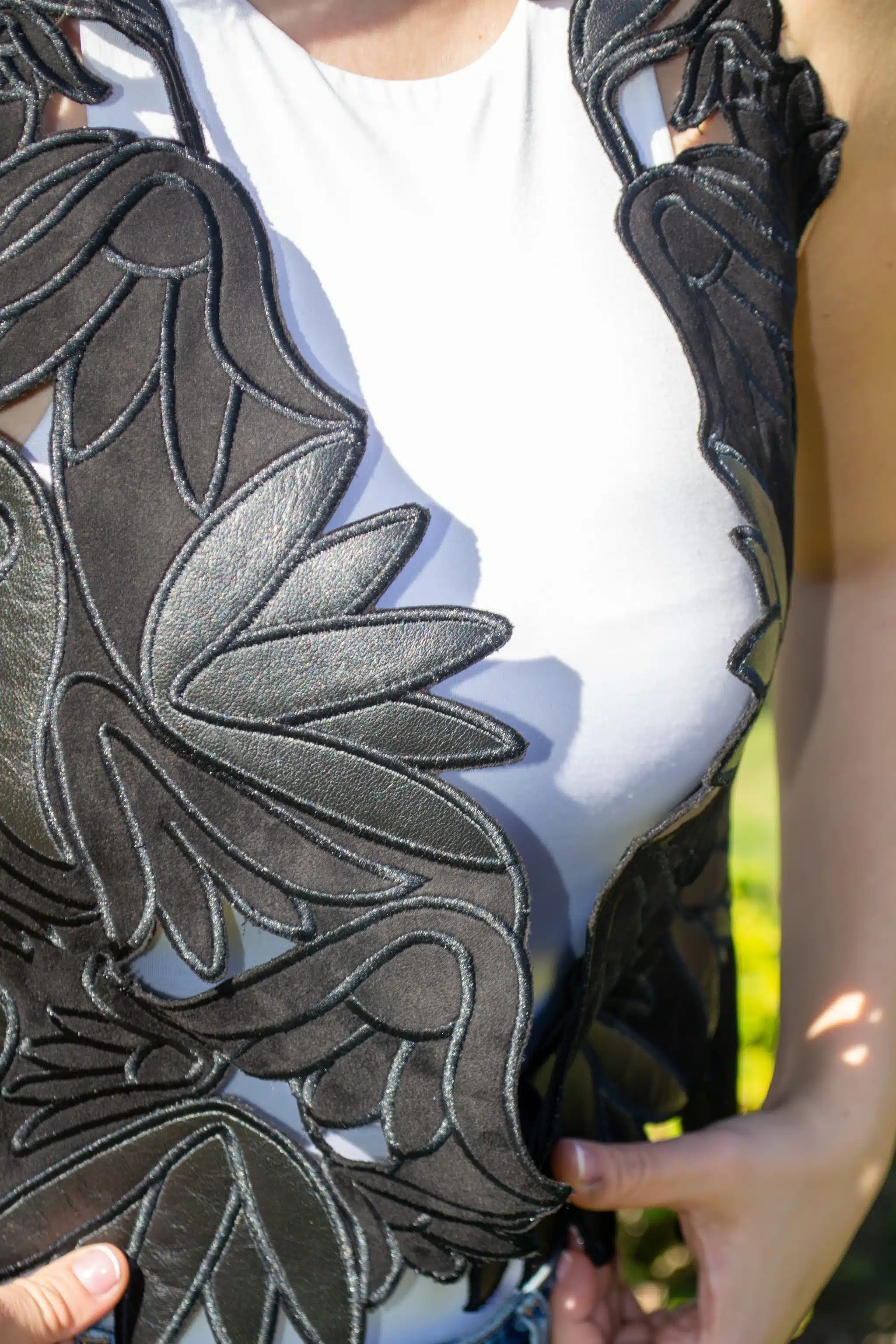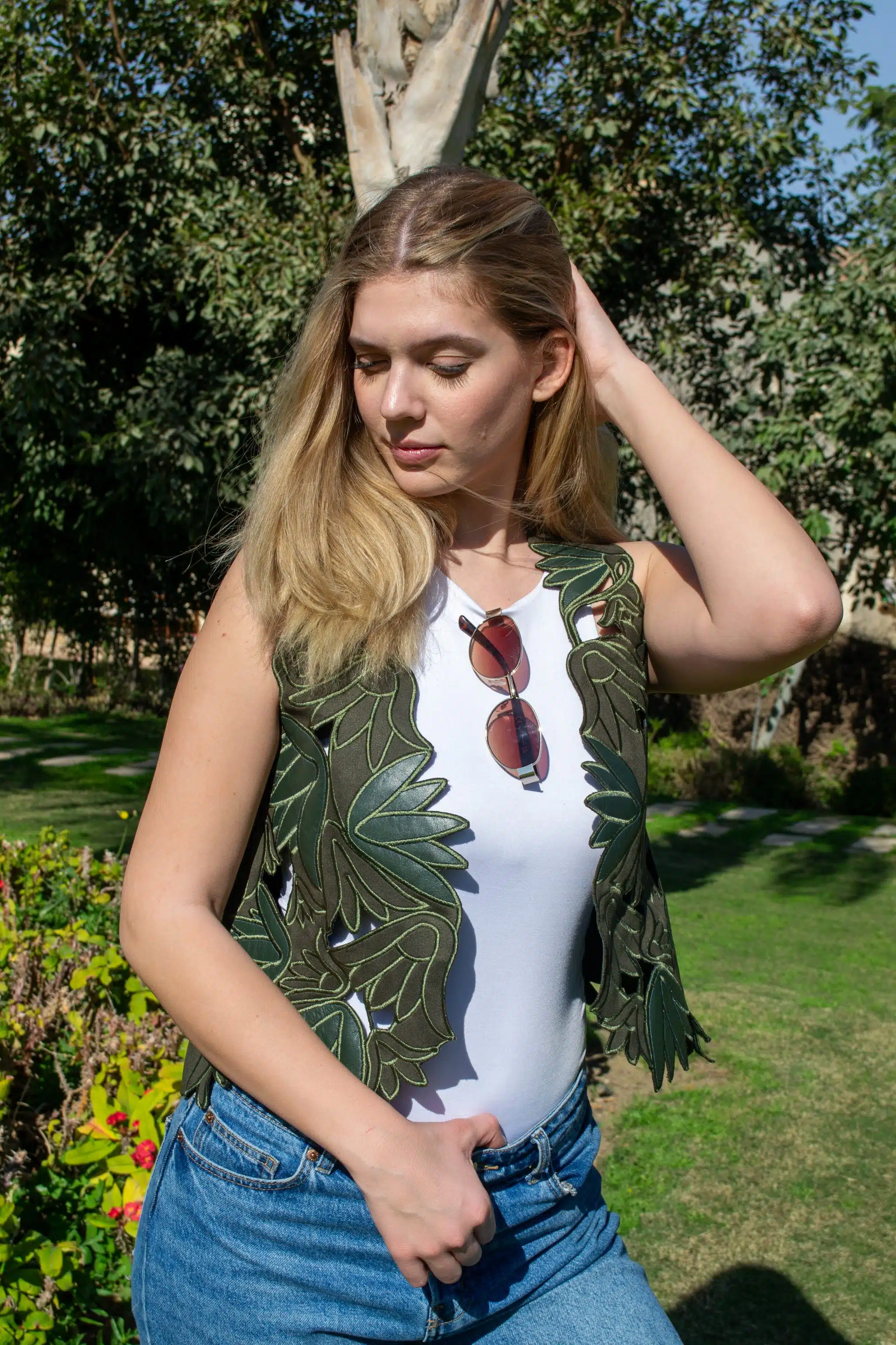 suede vest with genuine leather lotus flowers avalaible in Olive, Black and Camel length 55 cm