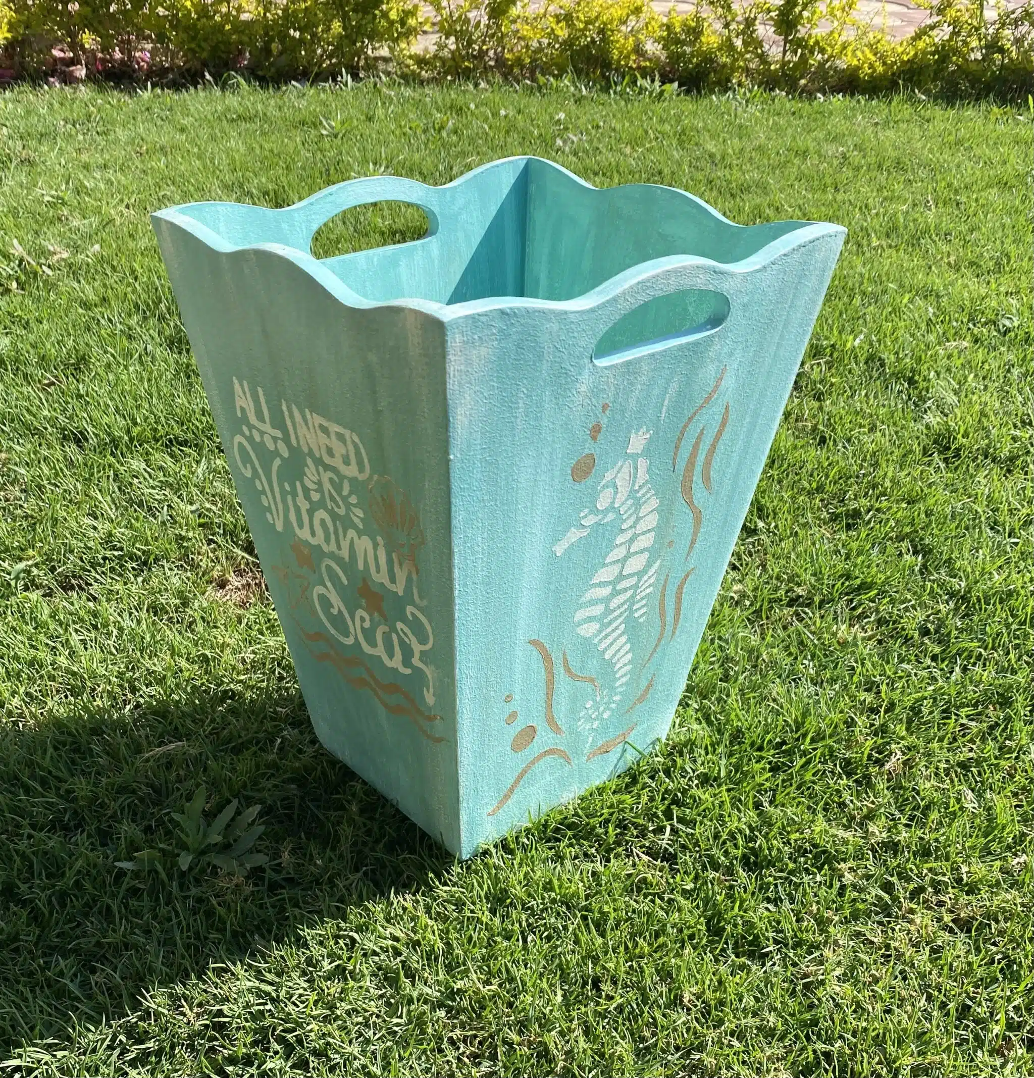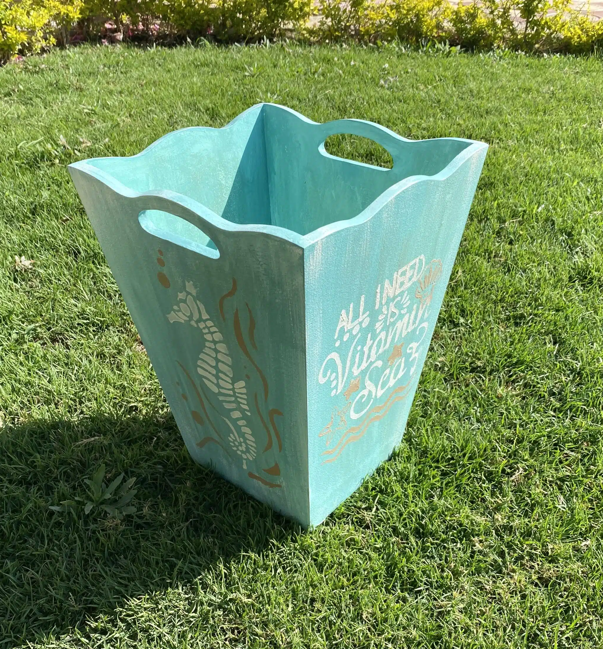 Wooden basket in washed blu color and summer theme