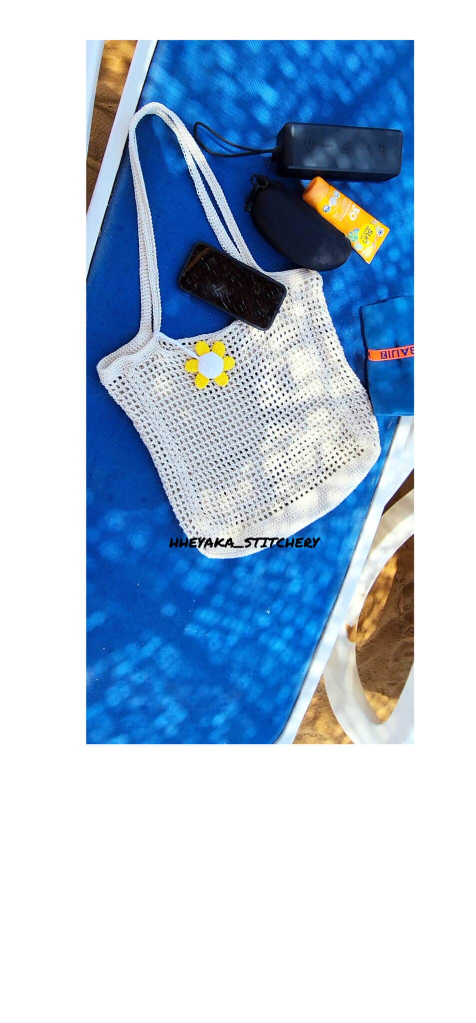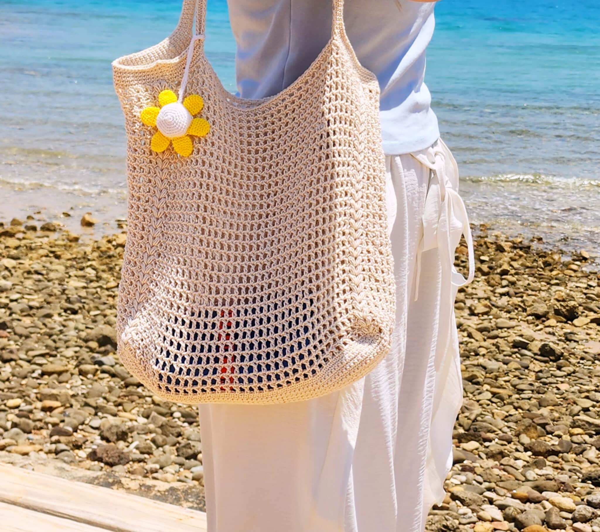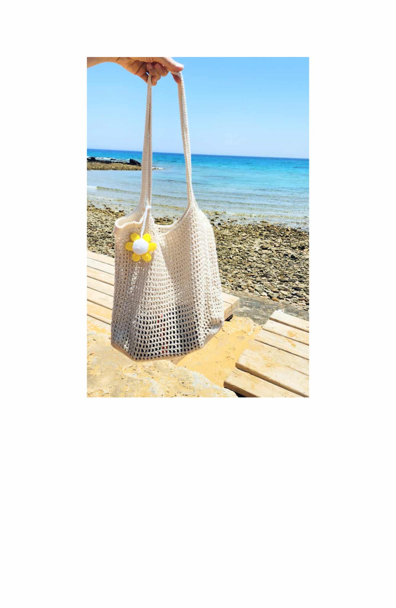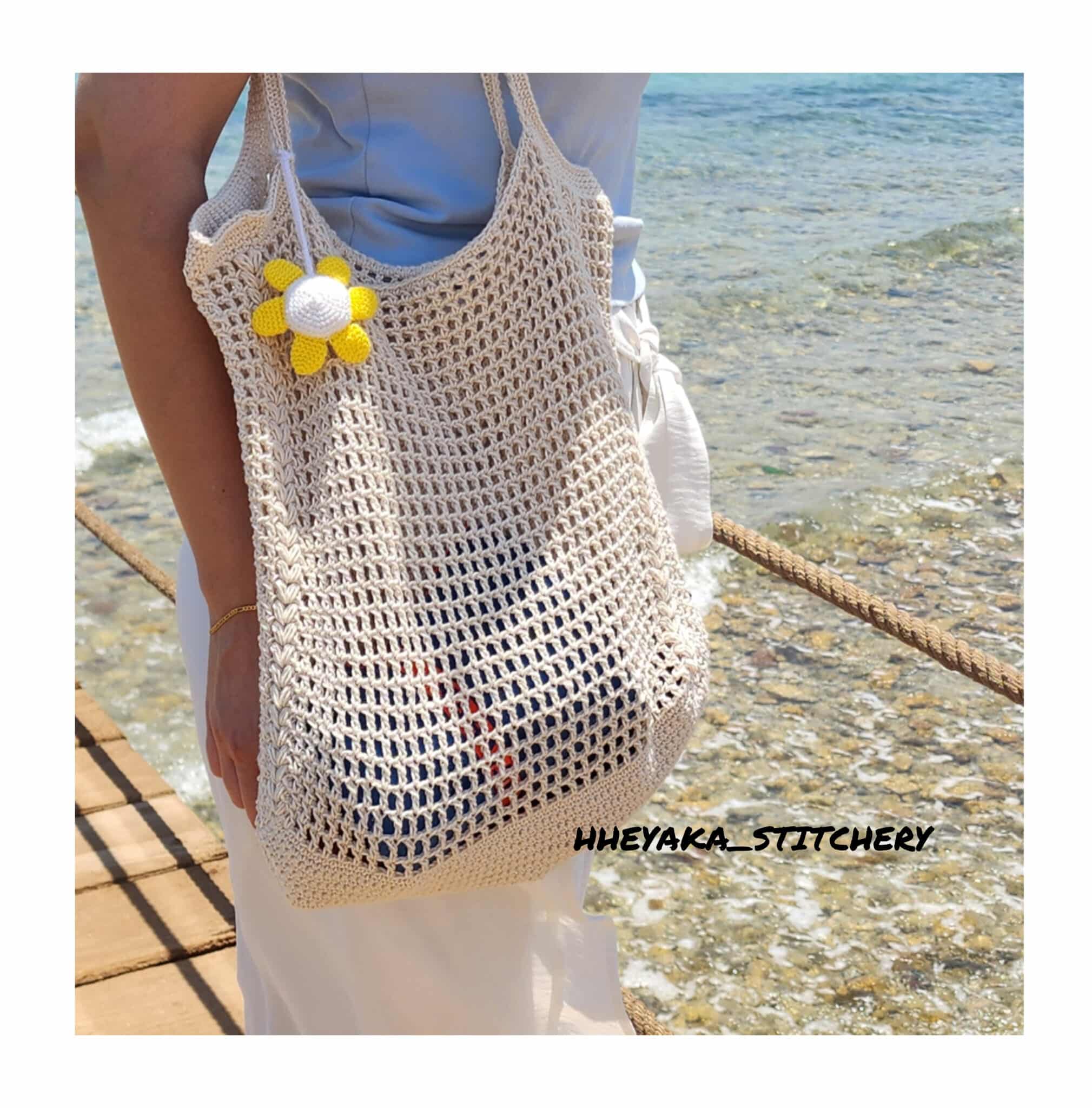 Handmade crocheted with 100% off-white cotton yarn. The bags is airy so that you easily find your stuff inside the bag. The yarn is strong so you can hold many items like glasses, keys, mobile, creams, tissues,….