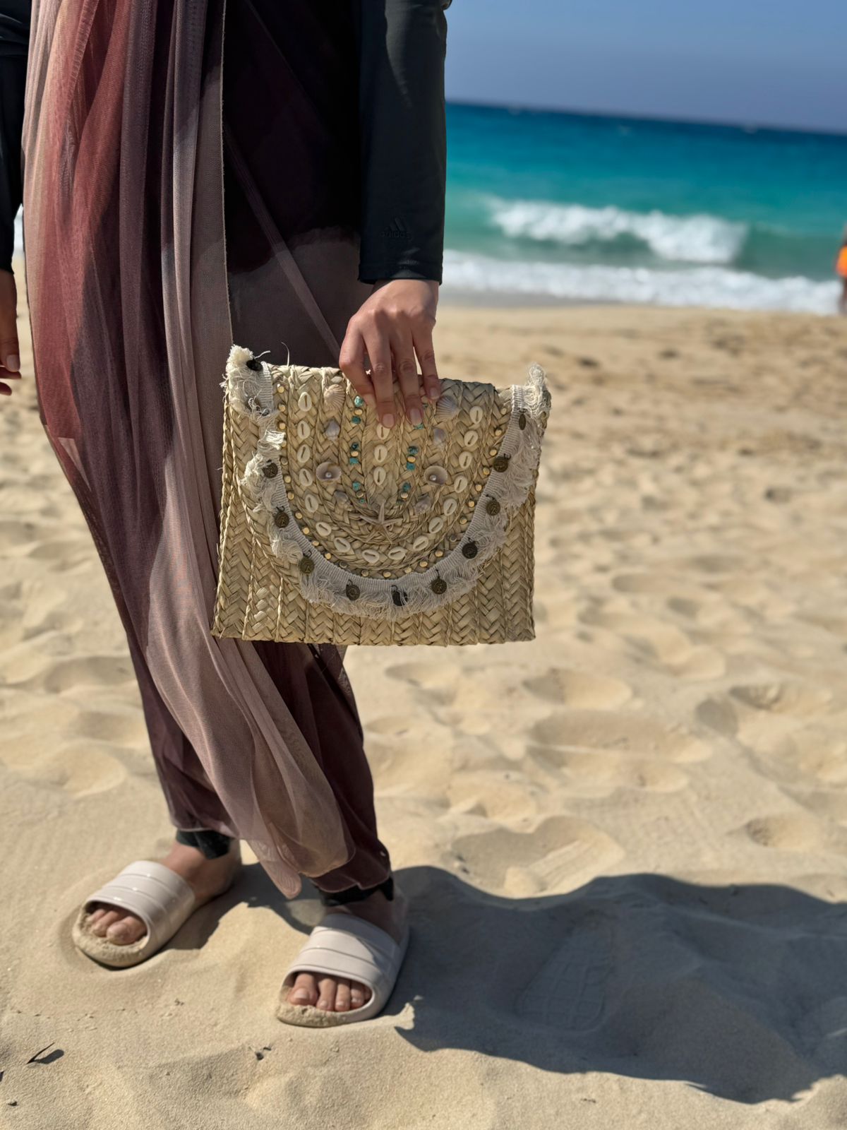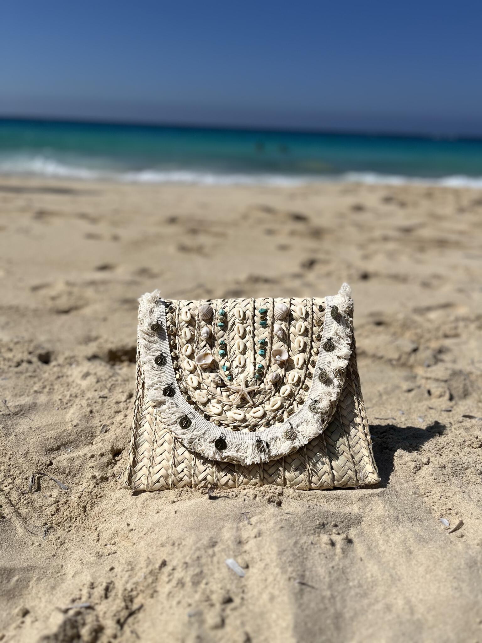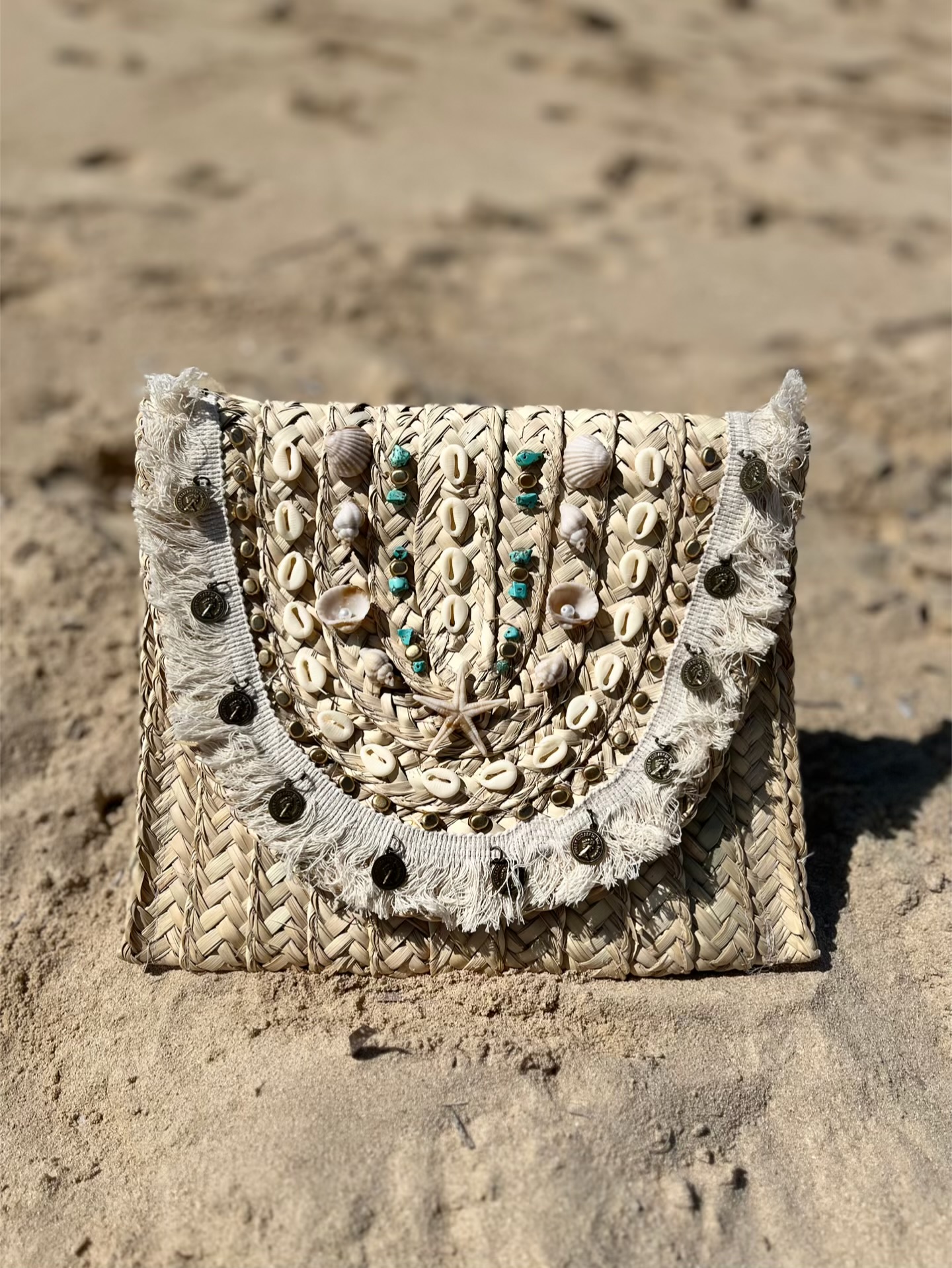 Handmade straw bag with pretty shells, coins, and beads. Light and perfect for the beach or summer days. 🤍🌊